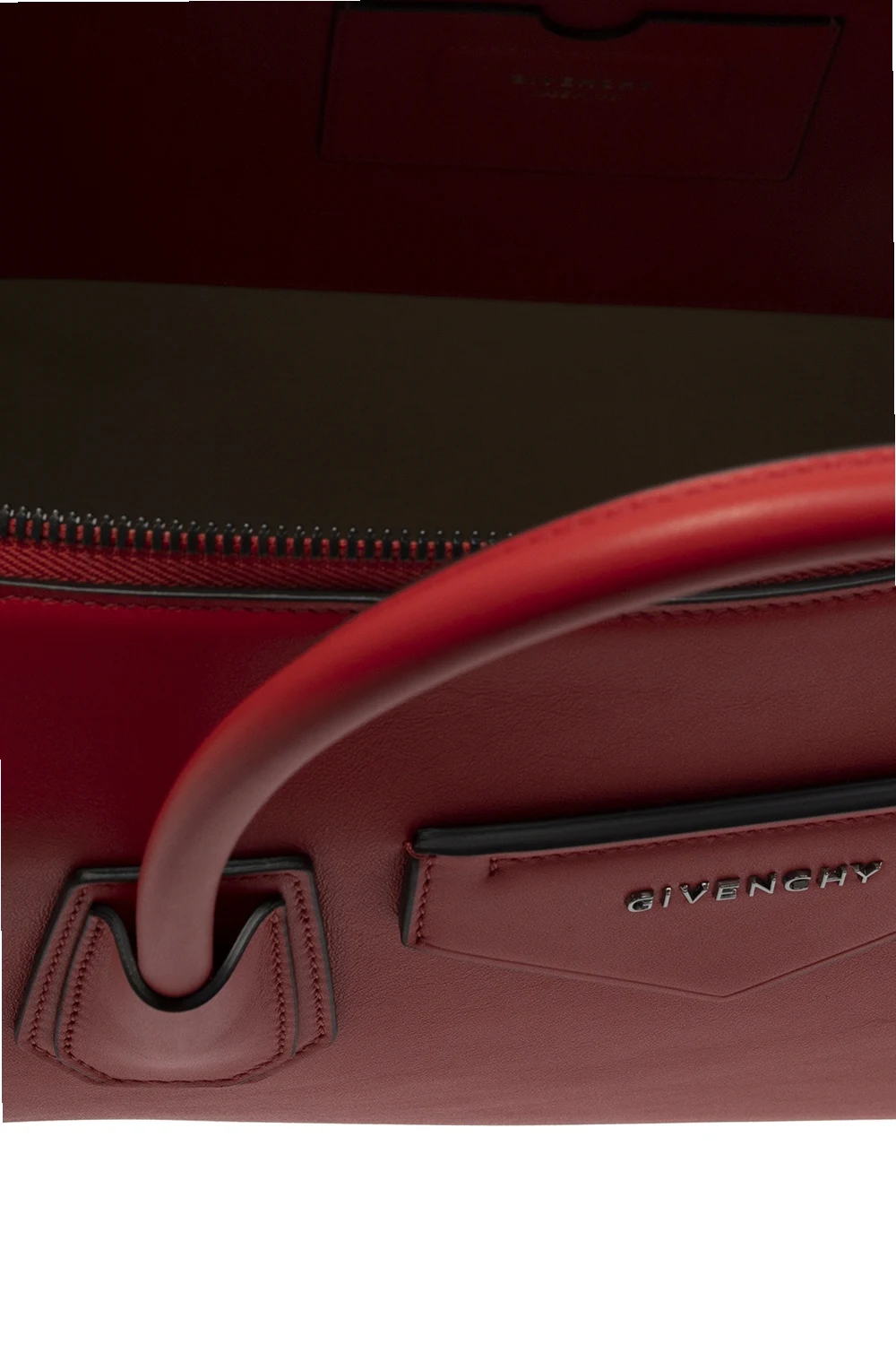Red ‘Antigona’ holdall from Givenchy. Size medium. Spruced up with silver-tone logo metalware, this calf leather-crafted design fastens via a zip and features two half-round handles, an adjustable shoulder strap and interior with one compartment, one slip pocket and one card slot.