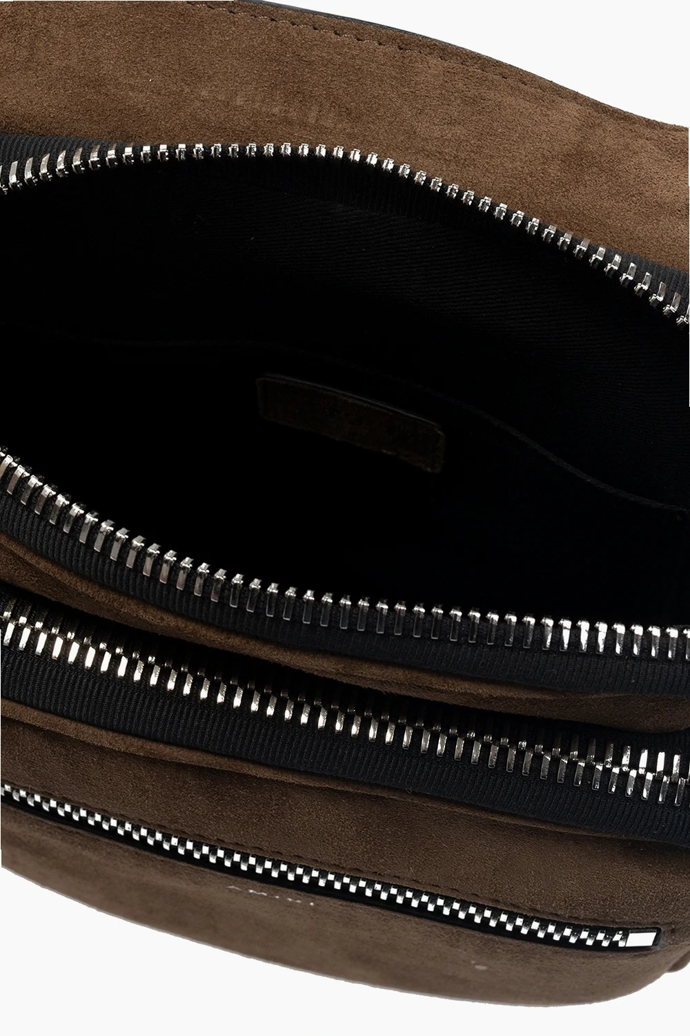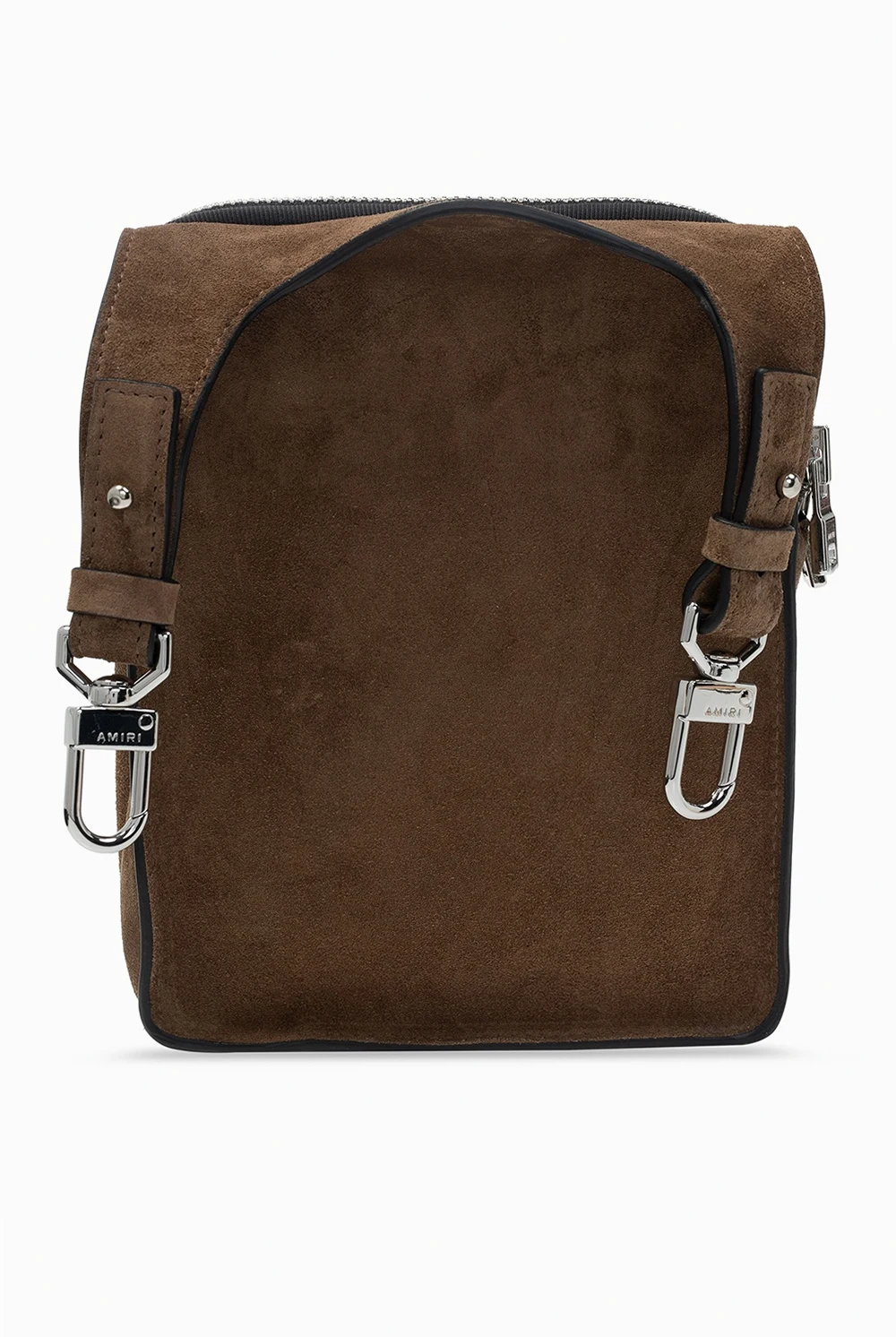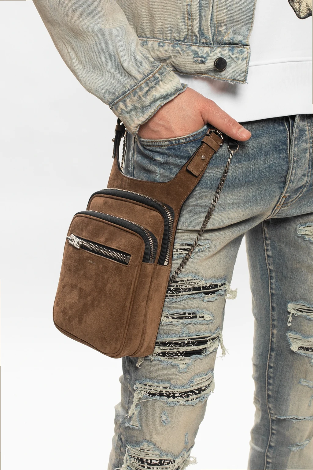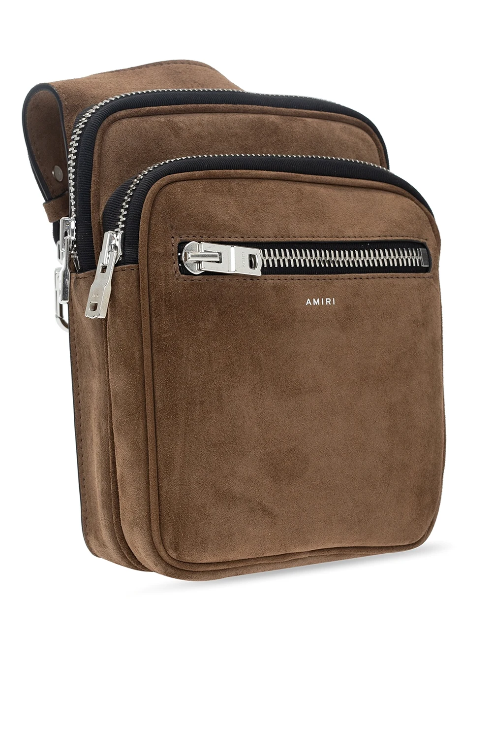 Brown belt bag from Amiri. Crafted from suede, this design fastens with zips and is decorated with a logo print. It is complete with a front zip pocket, adjustable straps with belt loop clips, silver-tone metal hardware and two internal compartments with one slip pocket.
