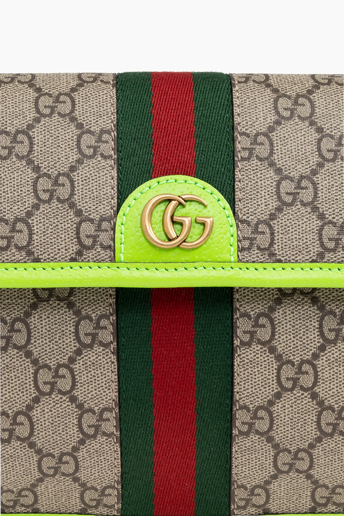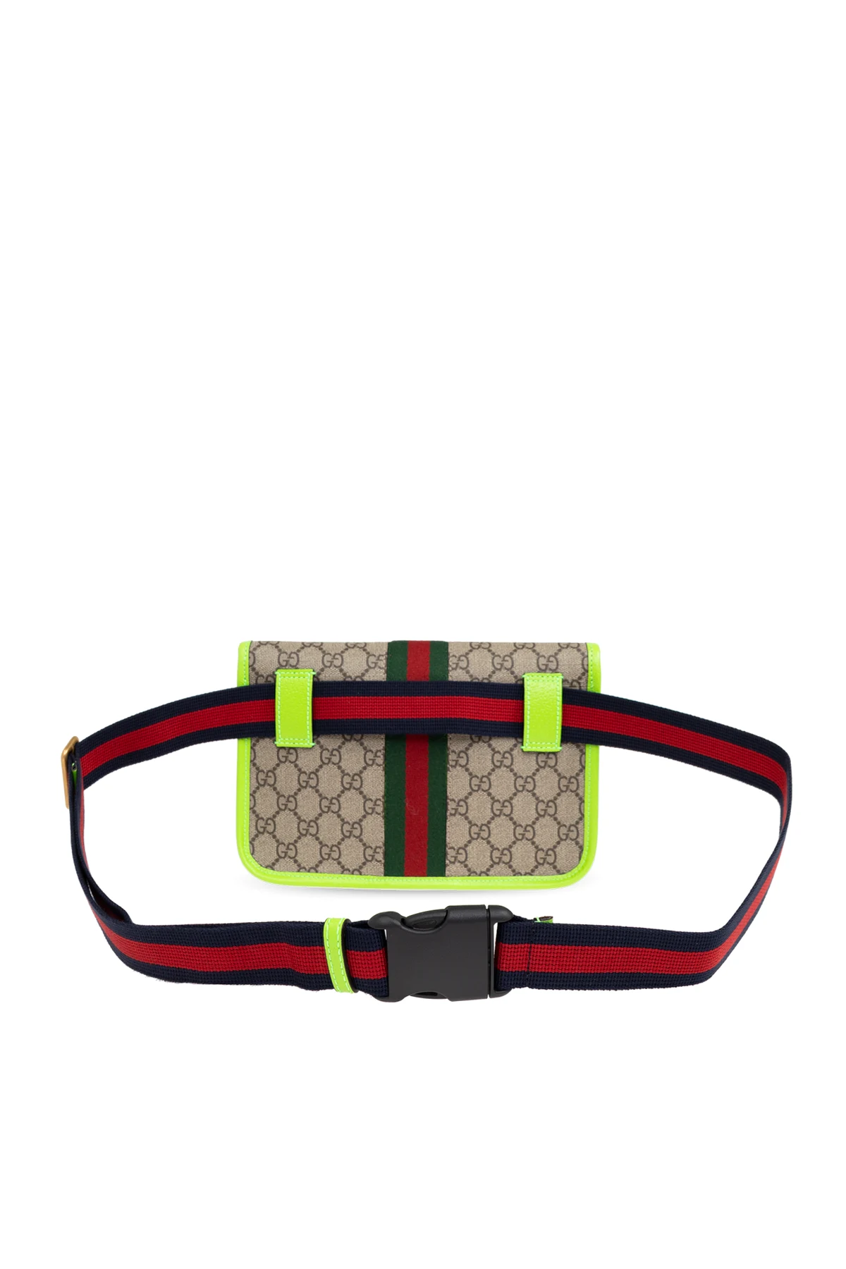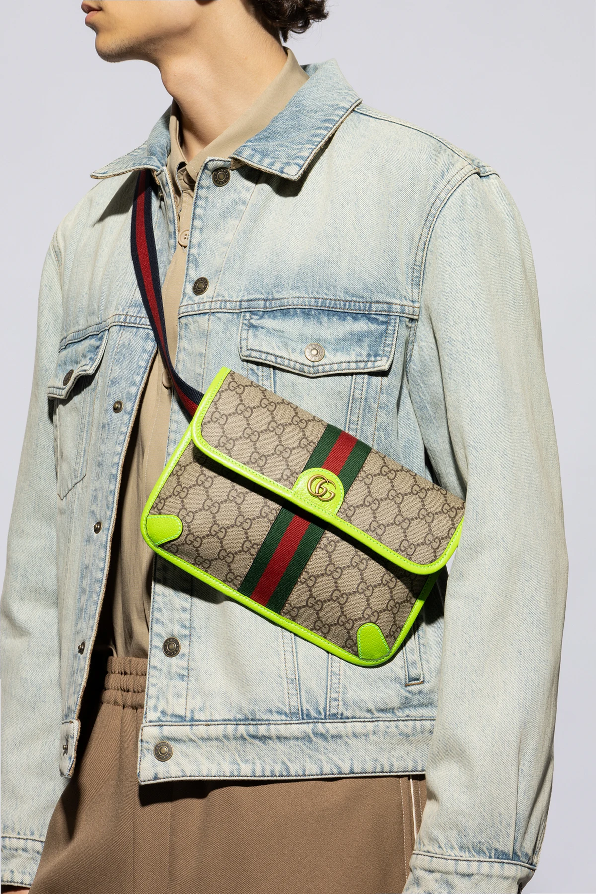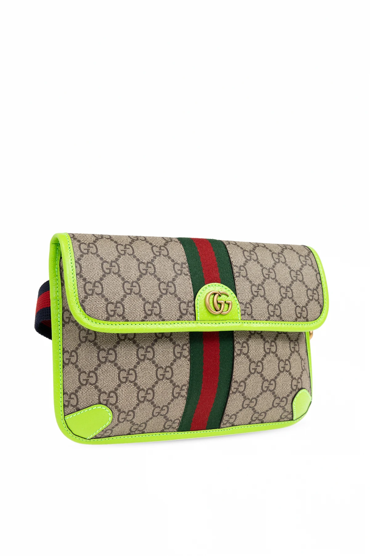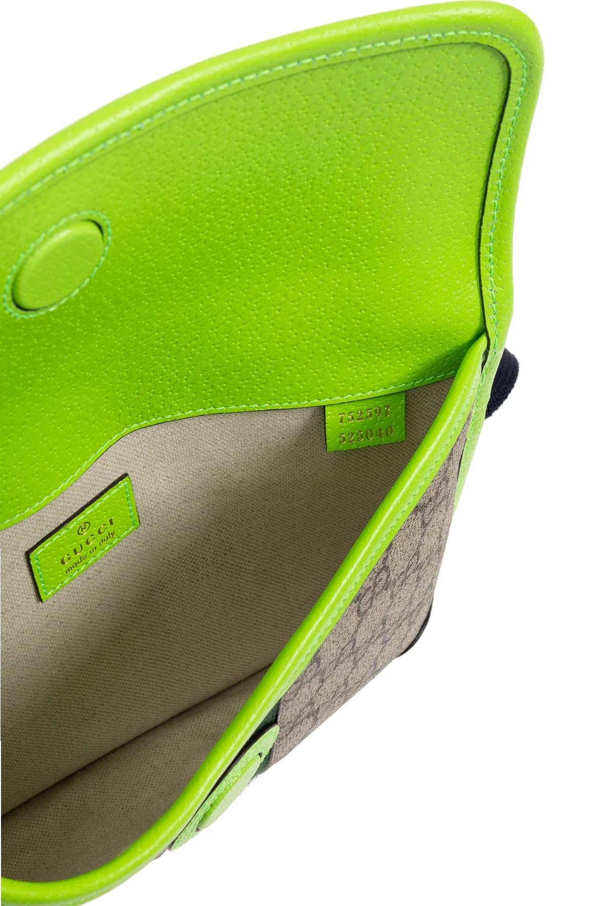 Introducing the \"Ophidia\" men\'s belt bag, an epitome of luxury and functionality from the renowned designer, Gucci. This exquisite accessory is designed to cater to the discerning gentleman who values both aesthetics and practicality in his wardrobe. The bag\'s dominant beige hue, adorned with the iconic \"GG\" monogram pattern, exudes sophistication, while the signature green and red stripes add a touch of elegance. The front flap of the bag showcases a circular, bold designer logo in green with a metallic gold finish, further elevating its allure. The neon green accents around the edges and flap introduce a contemporary contrast to its classic design. Crafted from calfskin leather and \'GG Supreme\' canvas, the outer layer of the bag promises durability and potential resistance to weather conditions, making it an ideal companion for the urban explorer. The interior, lined with green fabric, underscores the bag\'s cohesive color scheme and offers a spacious compartment for essentials. A serial number tag inside ensures authenticity. The bag\'s rectangular silhouette with pronounced edges, secured with a magnetic snap closure, and an adjustable shoulder strap with a robust buckle, underscores its practicality and ease of use. Why Purchase This Product? Elegant design with distinctive Gucci green and red stripes. Durable materials including calfskin leather and \'GG Supreme\' canvas. Contemporary neon green detailing for a modern twist. Adjustable, sturdy shoulder strap for customized fit and comfort. Magnetic snap closure for secure and easy access.