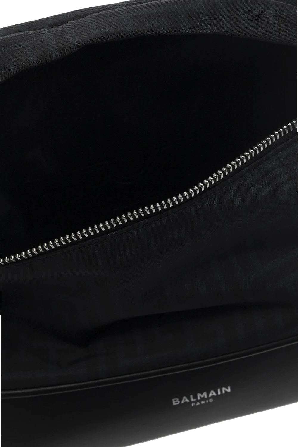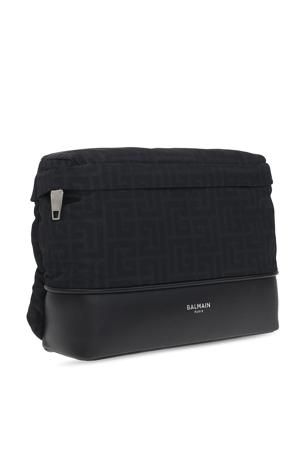 Black belt bag from Balmain. Embellished with the brand\'s logo and a monogram pattern, this design features two zipped pockets on the sides, an adjustable strap, silver-tone metal hardware and one internal compartment with a slip pocket.