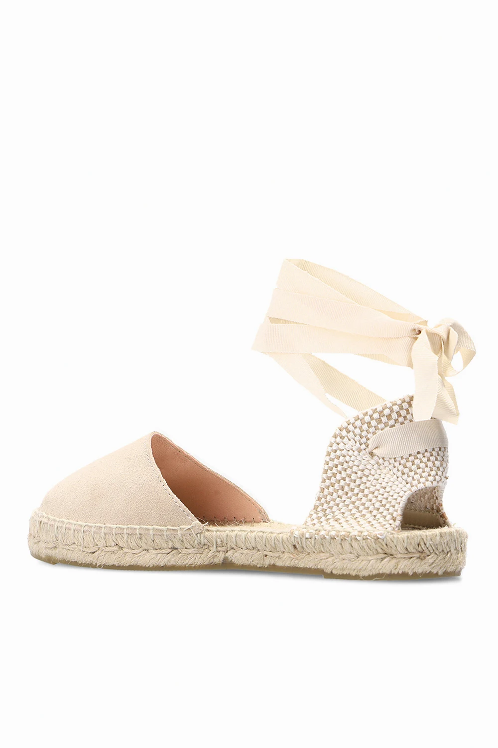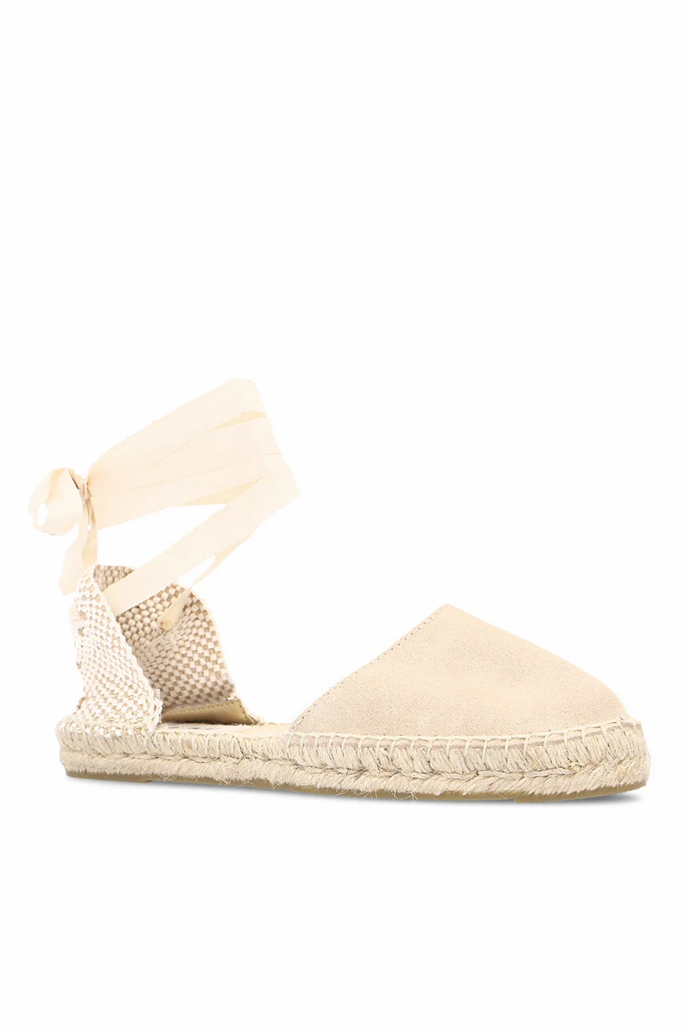 Beige ‘Valenciana’ espadrilles from Manebi. Crafted from suede, this pair is complete with decorative ankle ties, a cut-out at the heel and a beige rubber sole.