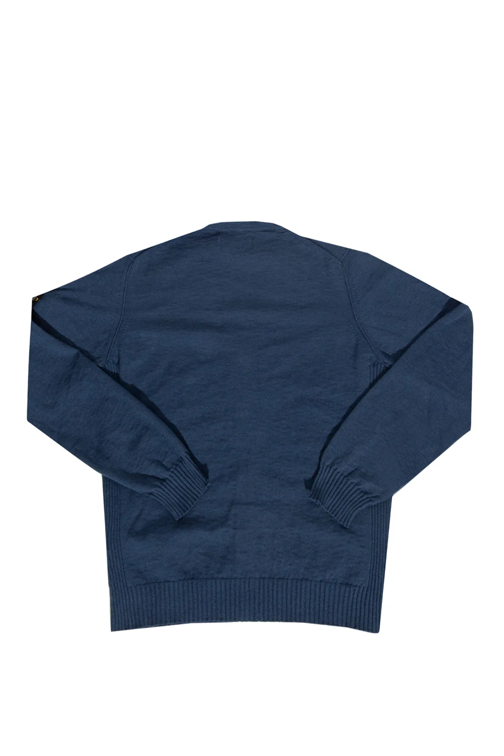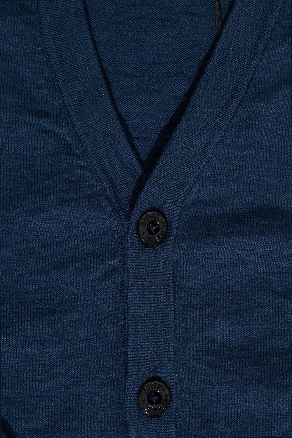 Navy blue cardigan from Stone Island Kids. Made of cotton, this style features button fastenings, a V-neckline, a black-yellow-green logo patch and ribbed edges.