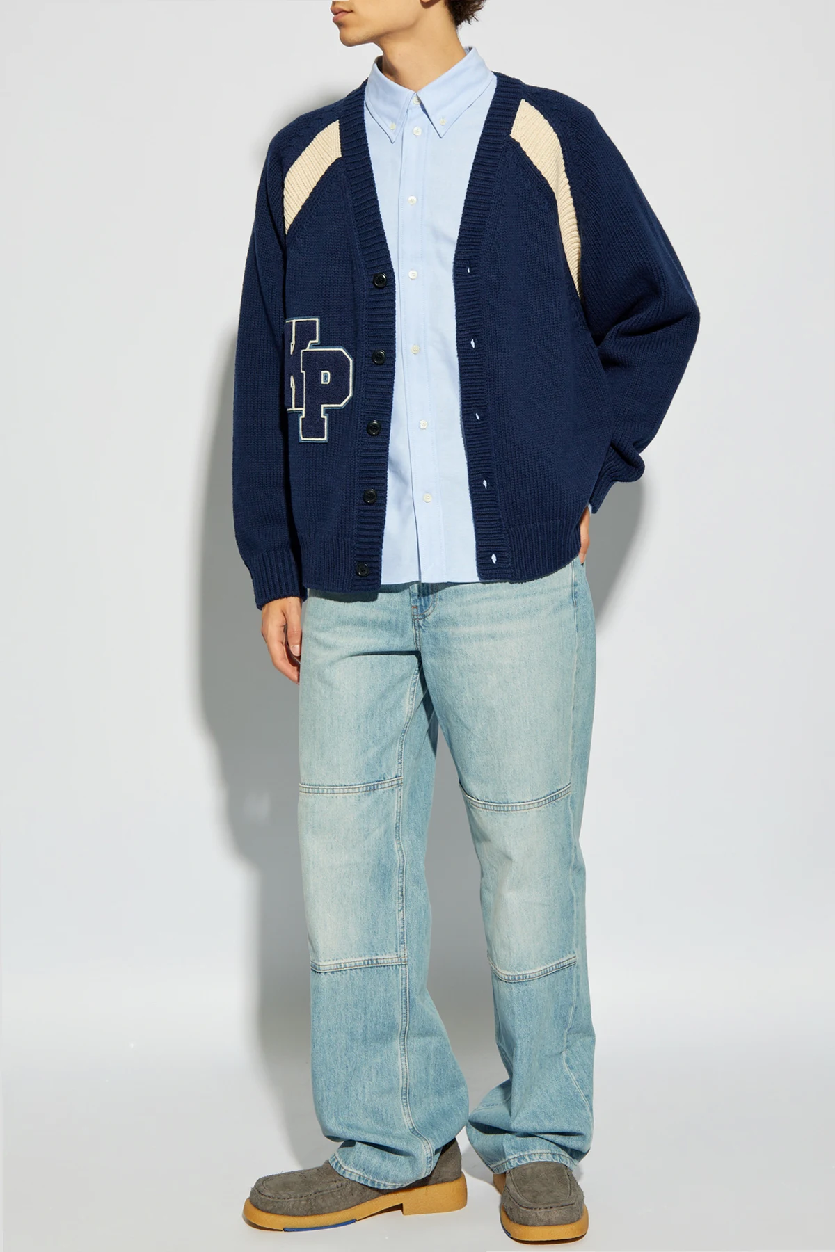 Introducing the epitome of sophistication and warmth, the Kenzo Buttoned Cardigan in a striking navy hue, accentuated with cream inserts on the shoulders, making it a standout piece in any wardrobe. This exquisite garment, crafted from a thick, knit fabric, primarily consisting of wool, promises not only to elevate your style but also to serve as an ideal outer layer for those brisk days. The cardigan features a distinctive \"KP\" logo on the left chest, rendered in a thick, embossed material surrounded by a thin white outline, which brilliantly contrasts against the navy background, ensuring its visibility and adding a touch of exclusivity to the piece. Its classic, button-down design allows for versatility in styling, whether worn open for a more relaxed look or buttoned up for added warmth. The ribbed cuffs and hem ensure a snug fit, maintaining the garment\'s shape and enhancing its overall aesthetic appeal. Why Purchase This Product? Elegant navy and cream color scheme enhances visual appeal. Made from high-quality, warm knit fabric with a majority wool composition. Features a bold \"KP\" logo for a unique touch of branding. Flexible styling with its button-down design, suitable for any occasion. Ribbed cuffs and hem for a perfect fit and shape retention.