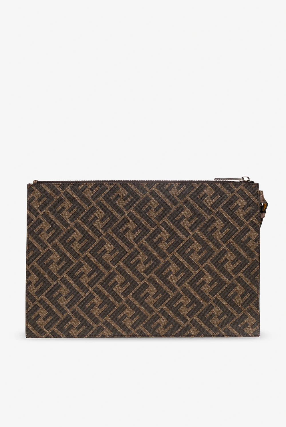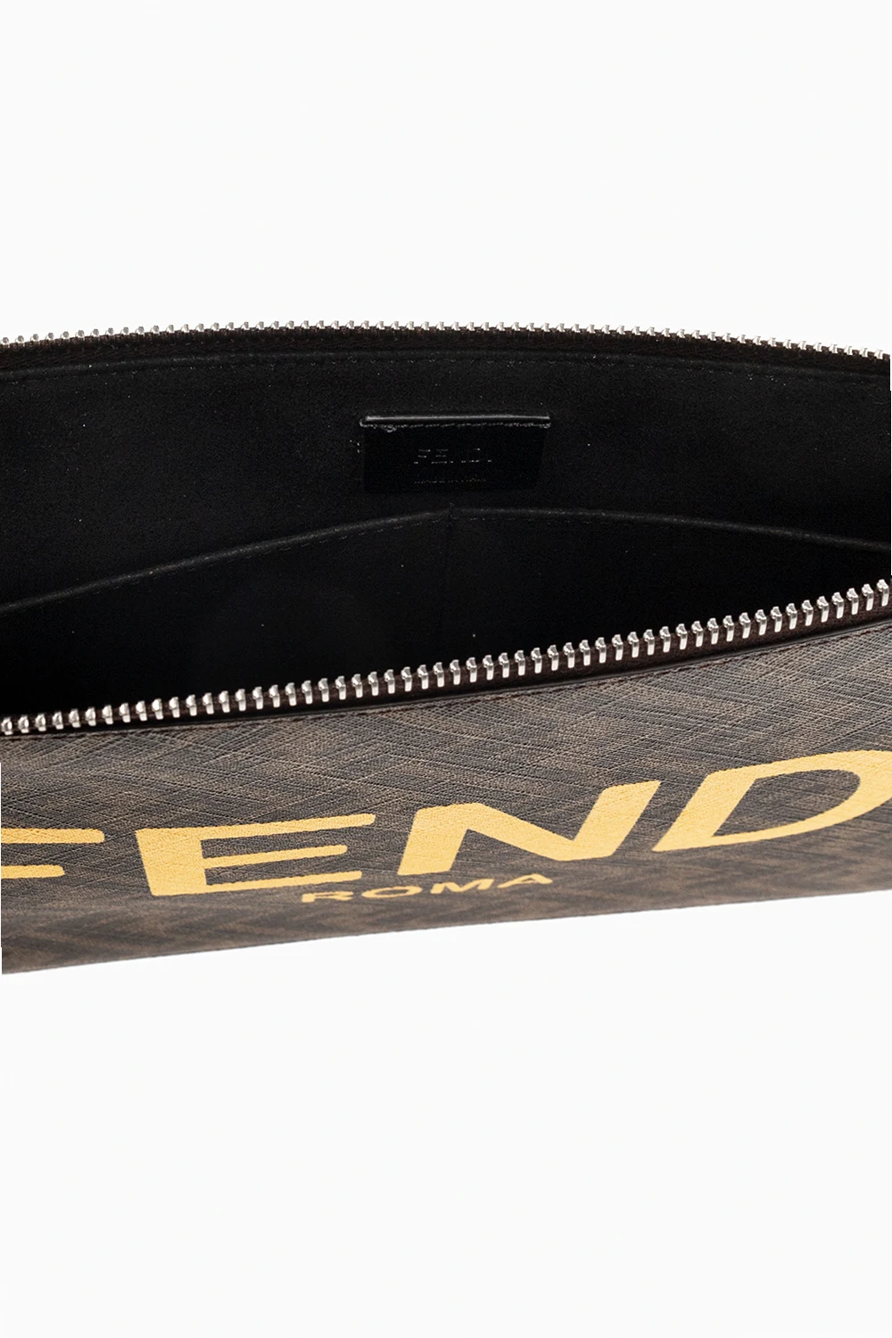 Brown and yellow handbag from Fendi. Made in part from calf leather, this design is decorated with a monogram pattern, yellow logo, zip fastening, round handle and silver-tone metal hardware. It has one internal compartment with three slip pockets and four card slots.
