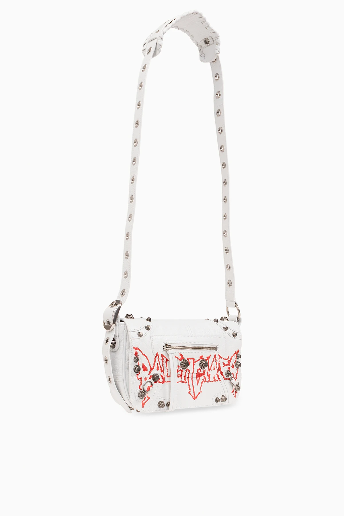 White ‘Le Cagole Medium’ shoulder bag from Balenciaga. Made of textured leather, this design fastens with a magnetic snap and is decorated with a red logo, metal studs and fringes. It is complete with a zipped front and back pocket, adjustable strap, antique silver-tone metal hardware and one internal compartment with one zip pocket.