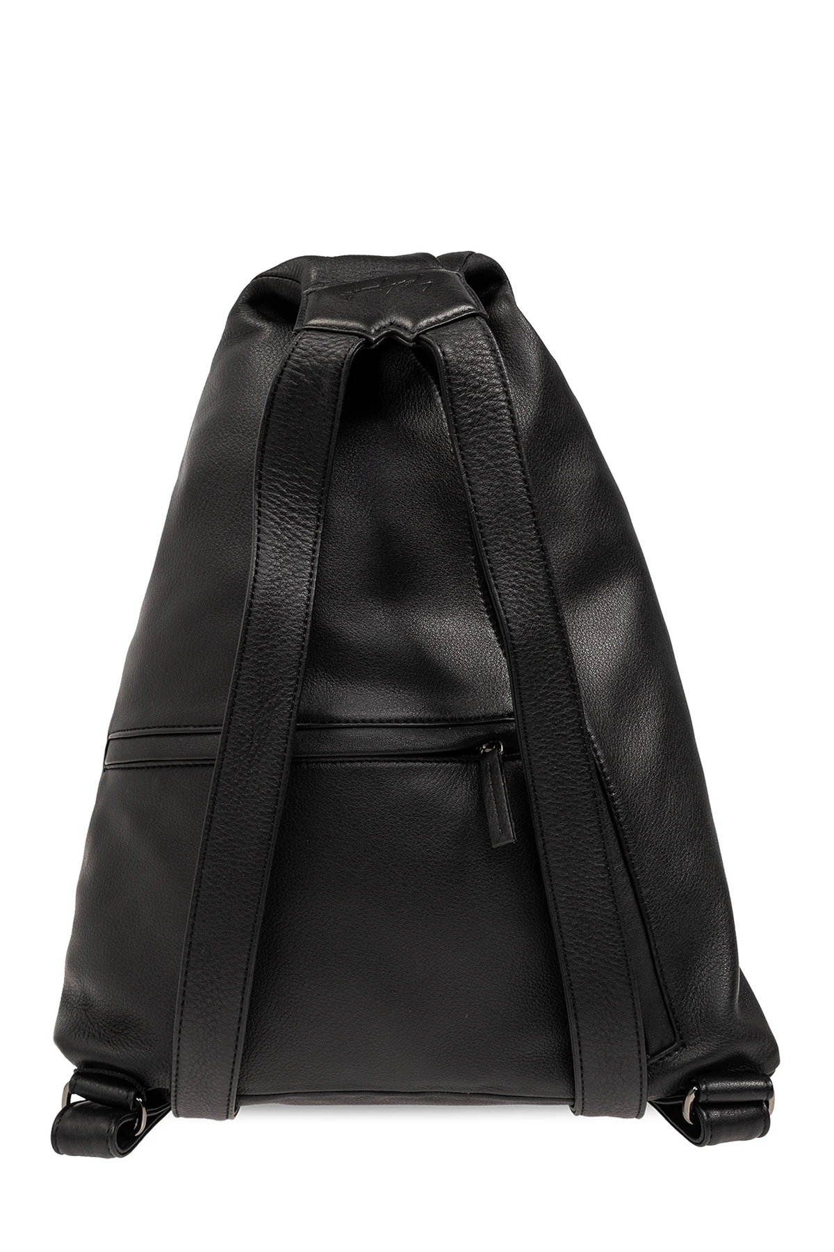 Black backpack from Discord Yohji Yamamoto. Made of leather, this item fastens via a zip and showcases an embossed logo, one zip pocket, adjustable shoulder straps, antiqued silver-tone metal hardware and one internal compartment with one zip pocket.