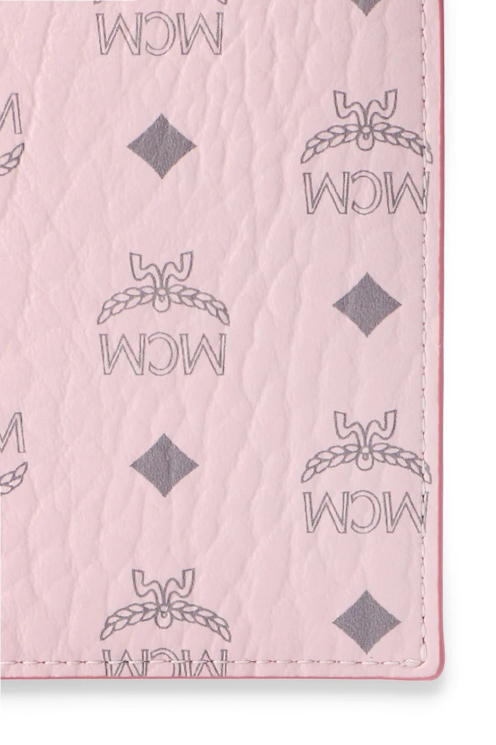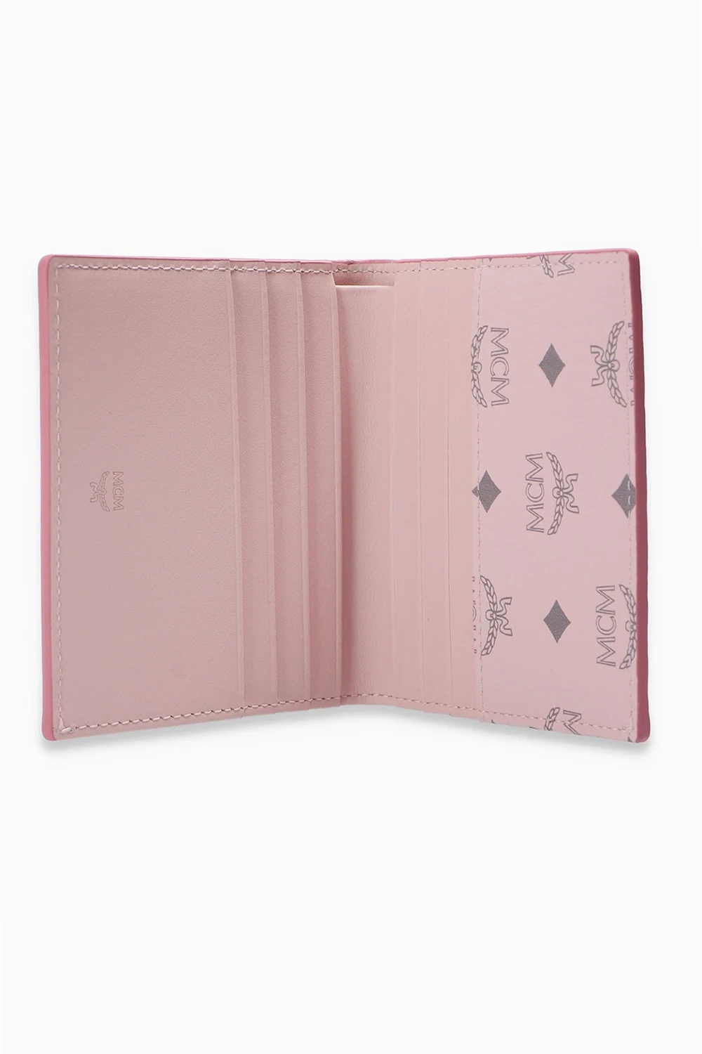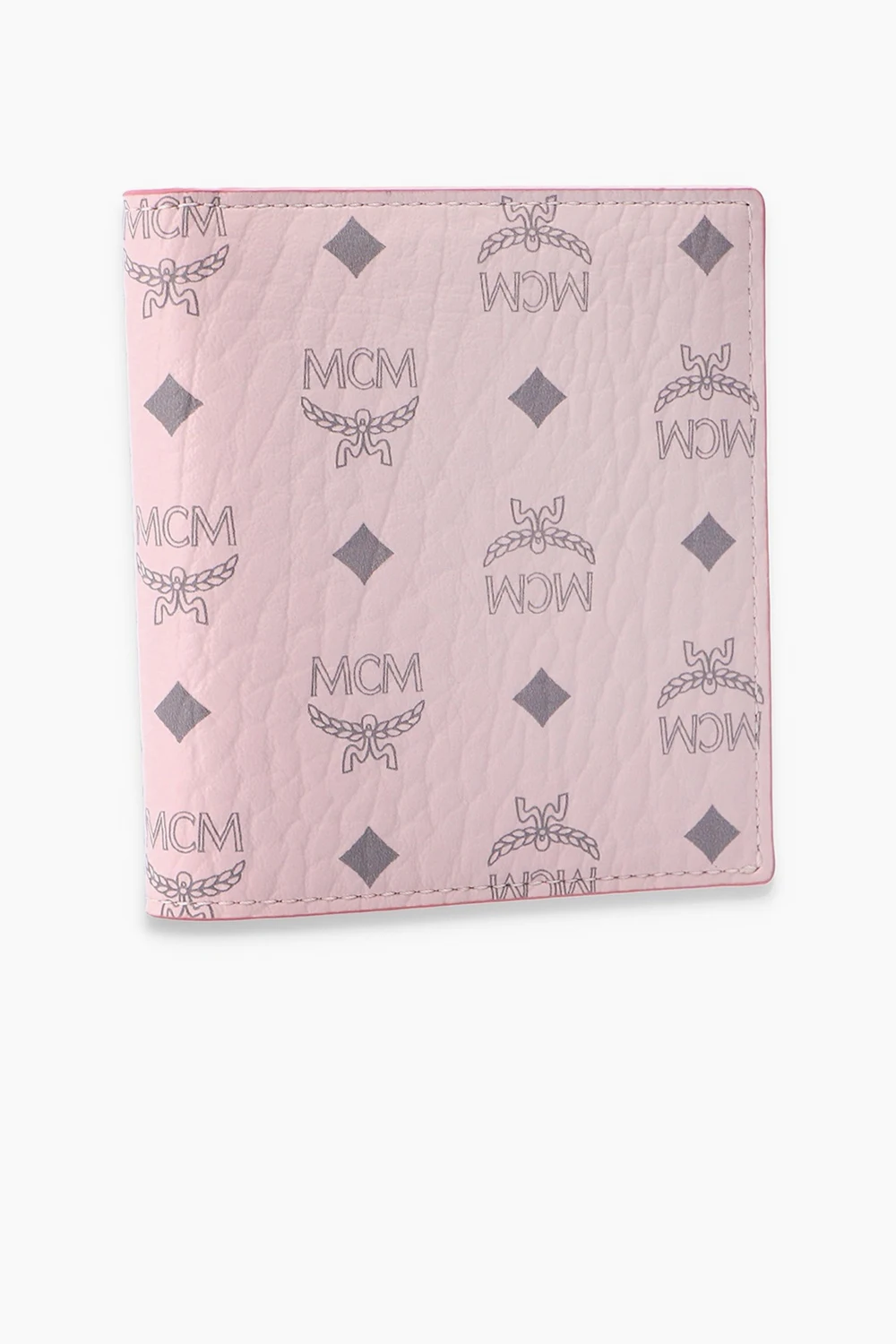 Pink folded wallet from MCM. Crafted from the brand’s signature canvas with leather trims, this item features a grey logo pattern and eight internal card slots.