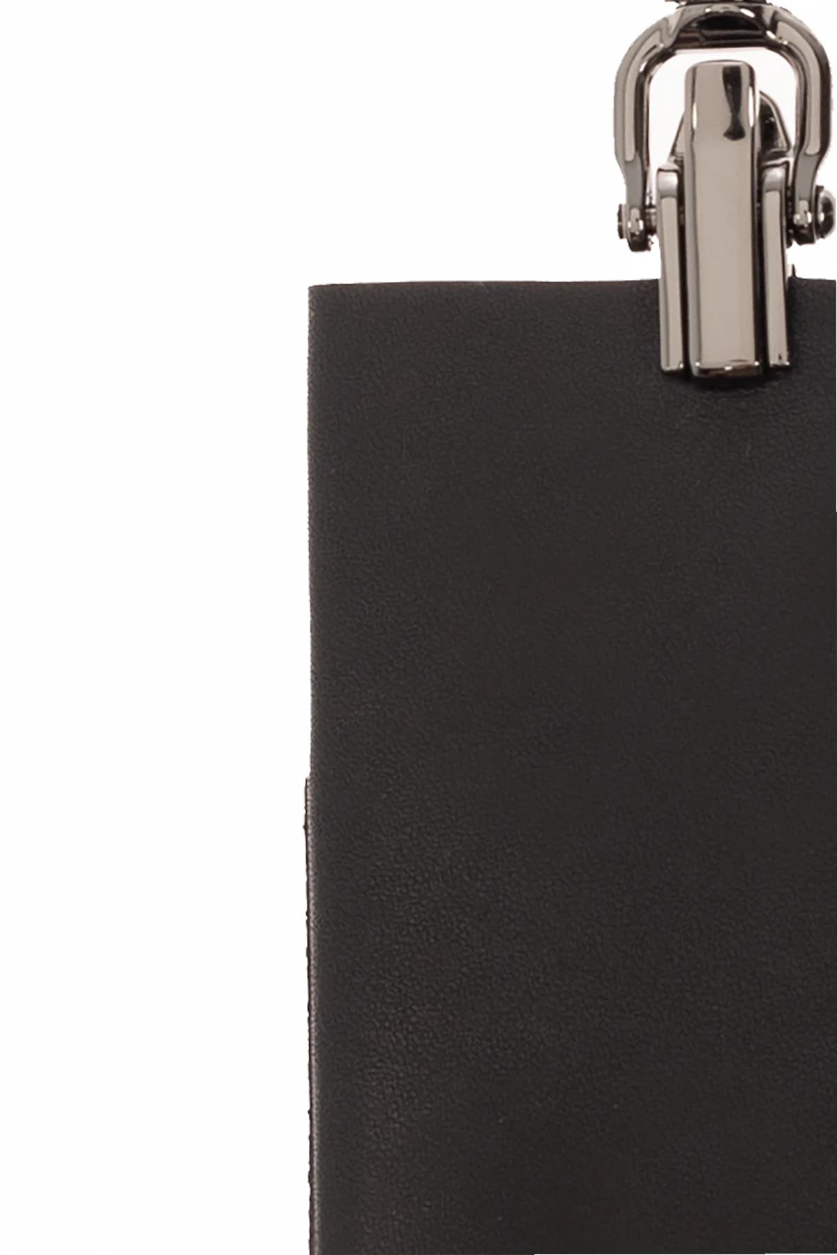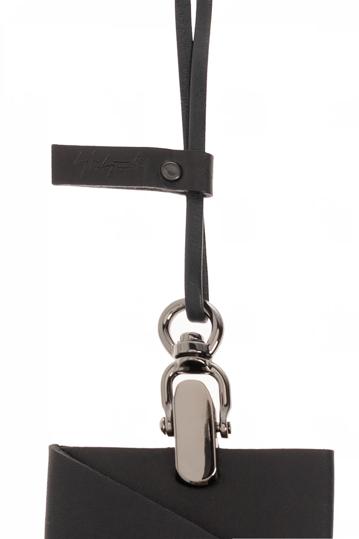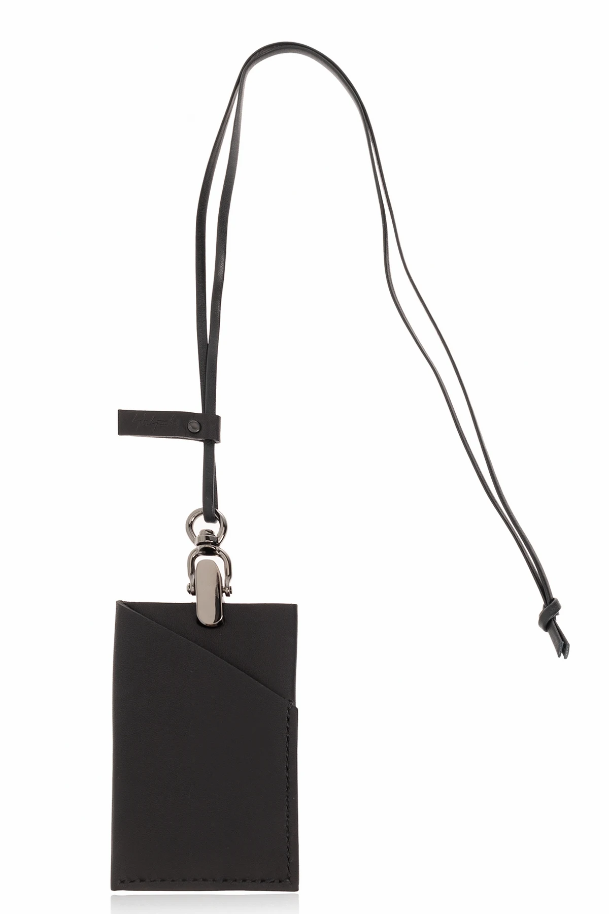 Black card case from Discord Yohji Yamamoto. Made of leather, this item showcases an embossed logo and two card slots. Comes with an attached strap.