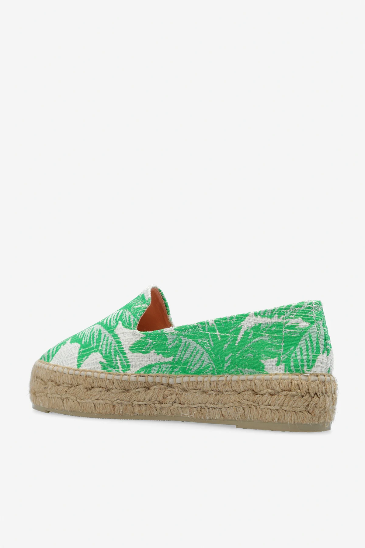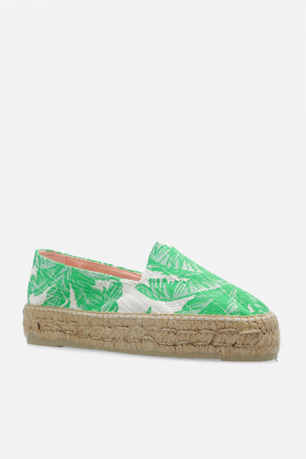 Green and cream espadrilles from Manebi. Made of fabric, this pair features a floral pattern and beige rubber sole.