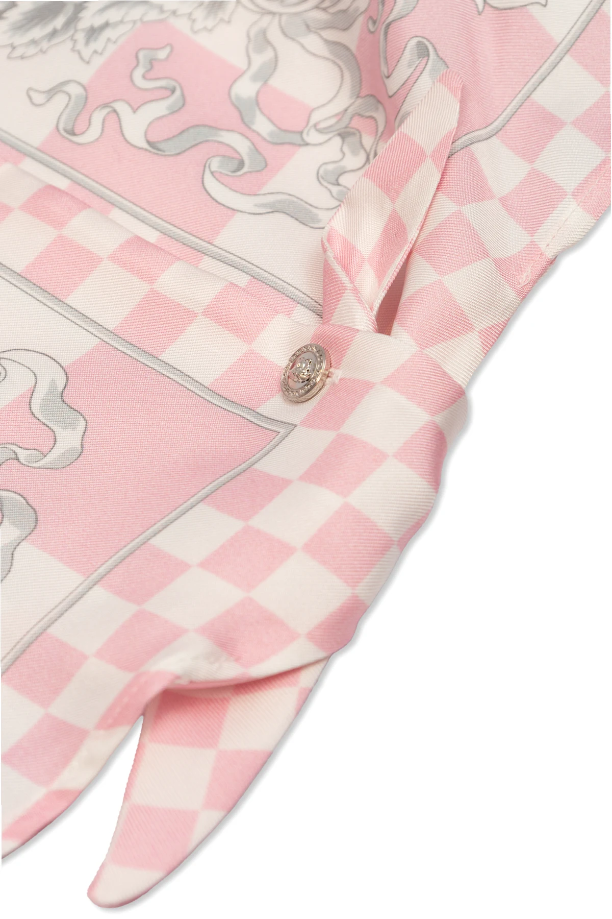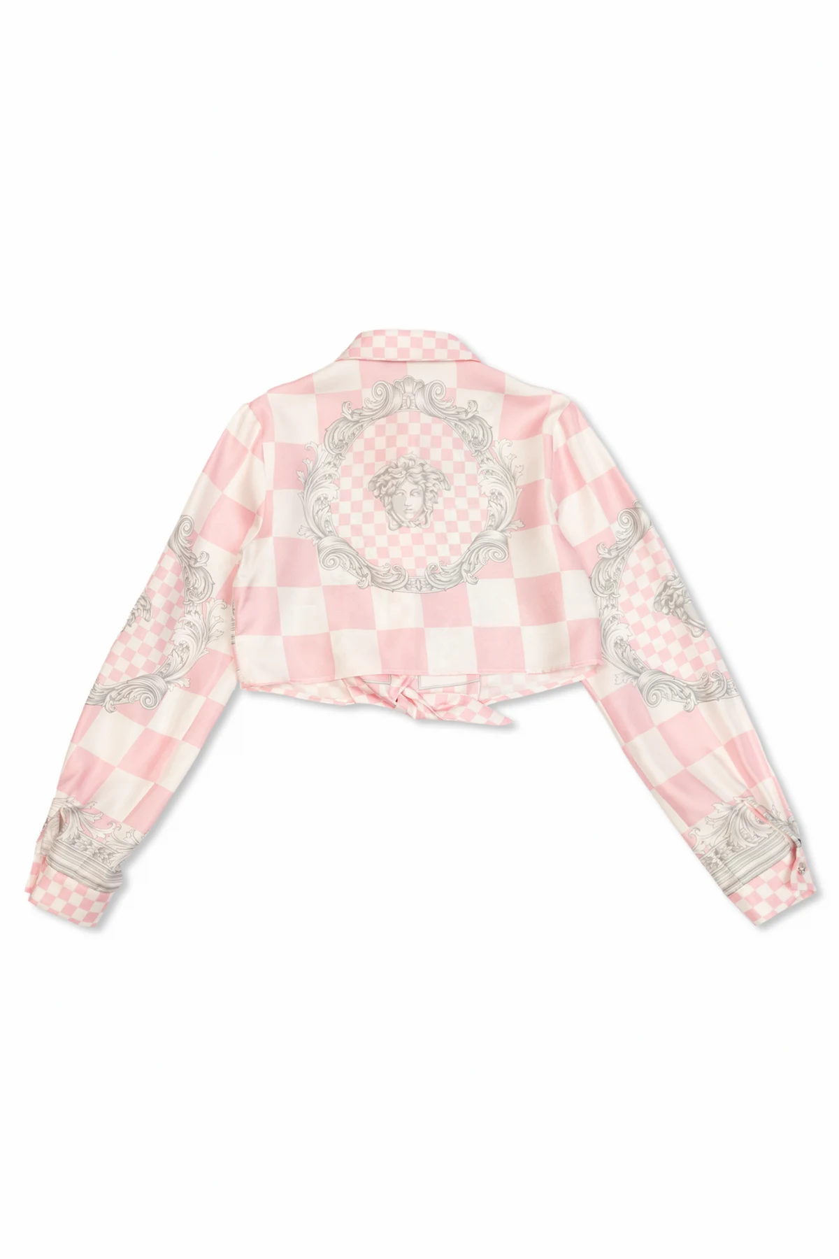 Introducing the epitome of sophistication and delicate craftsmanship - the Versace Kids Silk Short Shirt. Crafted from the finest 100% silk, this exquisite garment captivates with its soft touch and luxurious feel. The dominant pink color, complemented by white stripes arranged in a large check pattern across the surface, evokes a sense of playful elegance. Adding to its allure, a section of the fabric showcases an intricate, detail-rich pattern in lighter shades of pink and gray, reminiscent of classic Baroque or Rococo motifs, making it a masterpiece of design. The shirt boasts a short cut, ending just below the waist, with long sleeves and a classic, spread collar. The attention to detail is further accentuated by shimmering silver buttons, each adorned with a subtle logo or symbol, hinting at the brand\'s exclusivity and prestige. These elements, combined with a tie-up hem and buttoned cuffs, underline the shirt\'s unique charm and high-end appeal. As part of the esteemed Versace Kids collection, this shirt carries the brand\'s hallmark of excellence, visible in the discreet branding tag. Its \'Medusa Contrasto\' pattern embellishes the garment, making it not just clothing, but a statement of unparalleled style and quality. This shirt is a testament to Versace Kids\' commitment to luxury and meticulous attention to detail, ensuring that even the youngest fashion enthusiasts can enjoy the pinnacle of fashion design. Why Should You Purchase This Product? Elevated by the sumptuous feel of pure silk, offering unparalleled comfort and softness. Features a captivating Baroque-inspired pattern, adding a touch of historical elegance and sophistication. Enhanced with exclusive silver buttons, symbolizing the garment\'s luxury and the brand\'s attention to detail. Part of the renowned Versace Kids collection, a symbol of high fashion and quality.