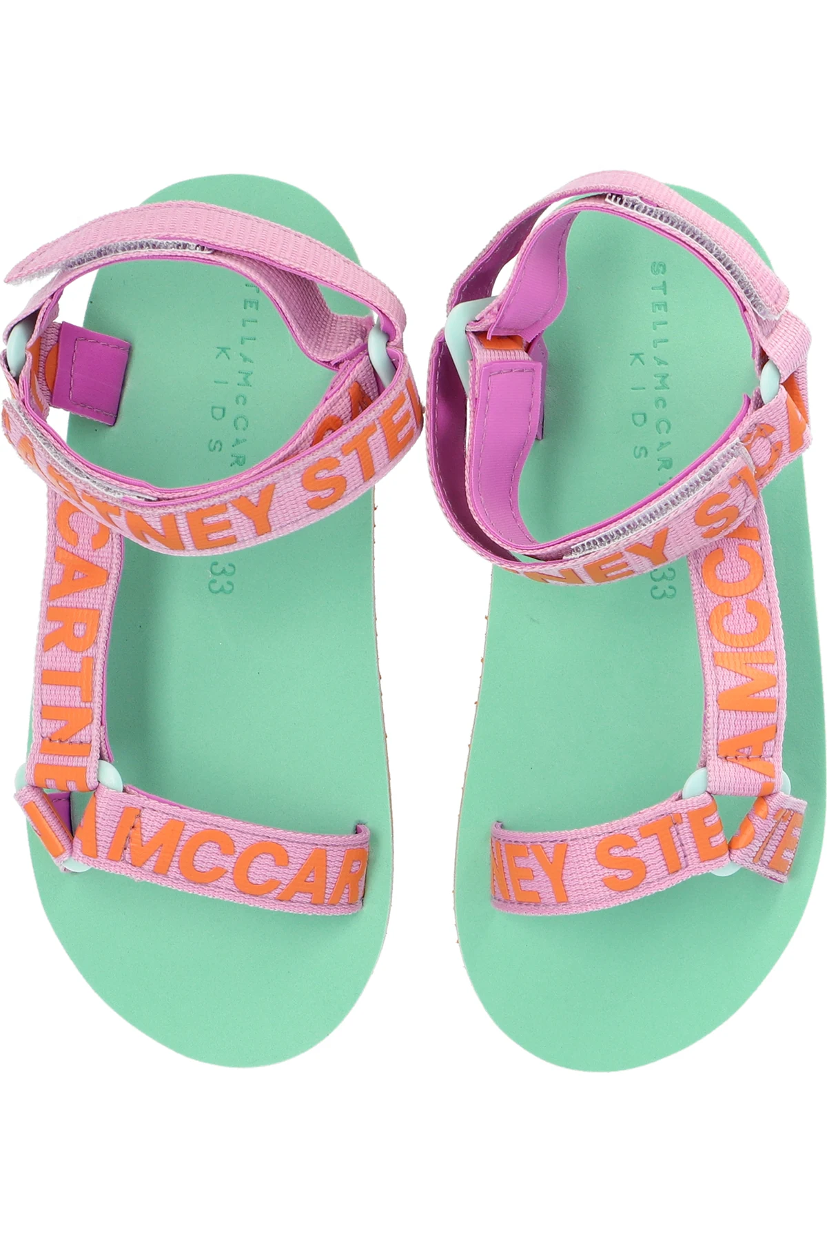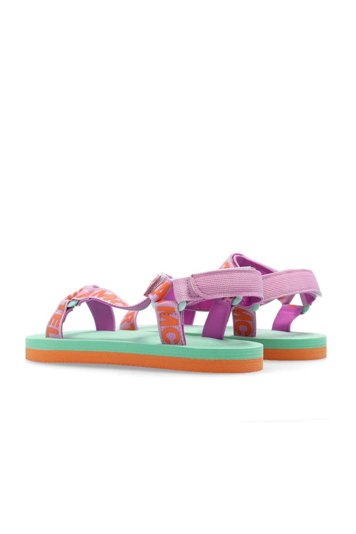 Purple lightweight sandals from Stella McCartney Kids. Embellished with an orange logo pattern, this model sits on a green and orange rubber sole and features velcro straps.