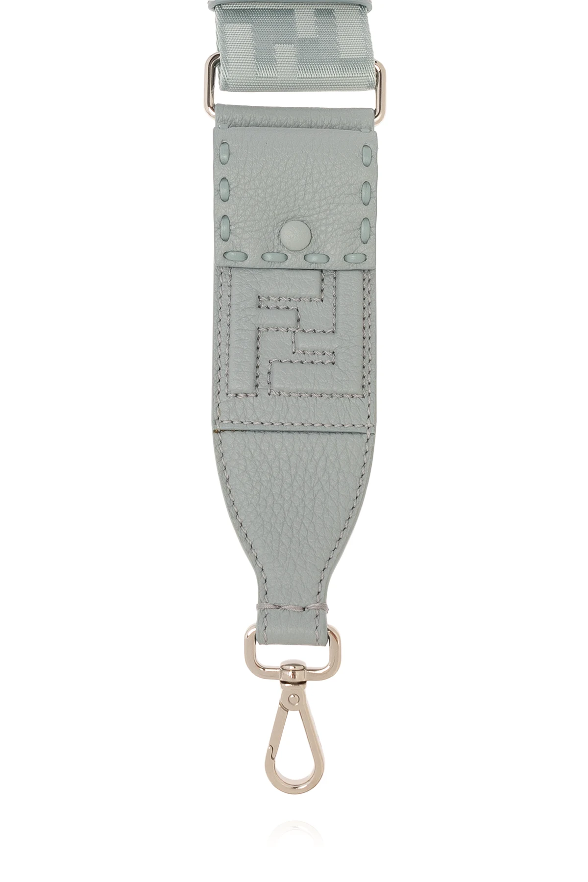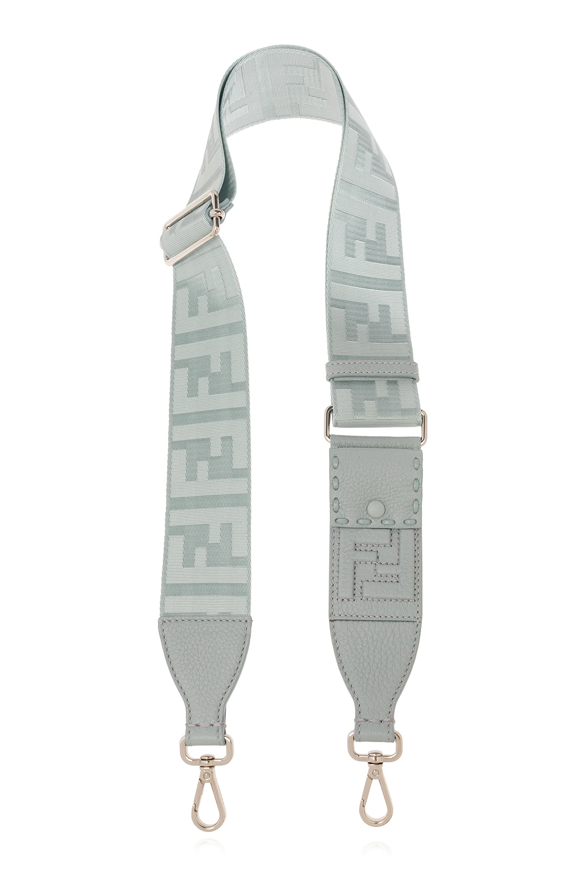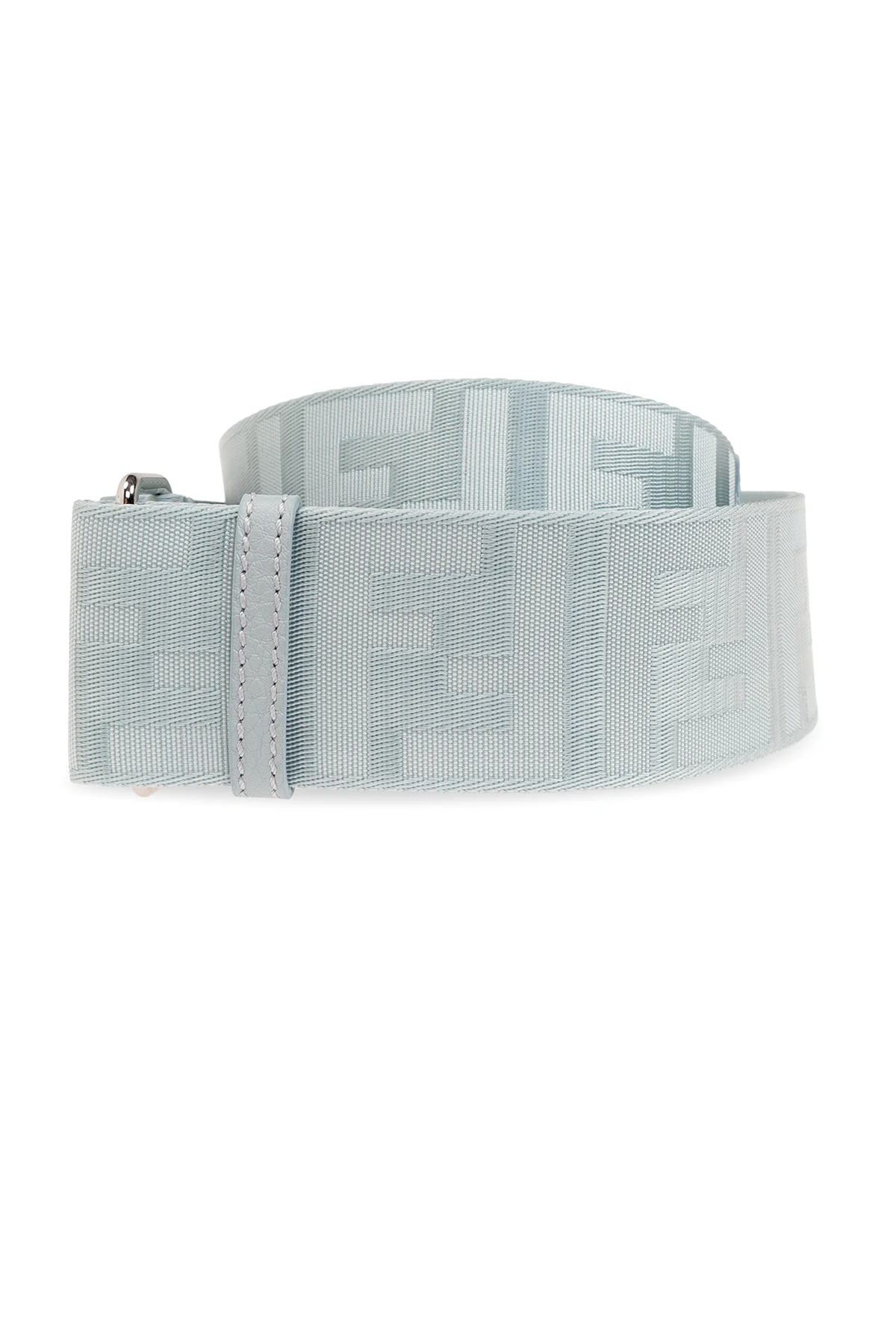 Blue, adjustable bag strap from Fendi. Made of fabric with a shiny finish as well as sheep and calf leather, this model features a jacquard and embossed monogram pattern and metal lobster clasps in silver-tone.