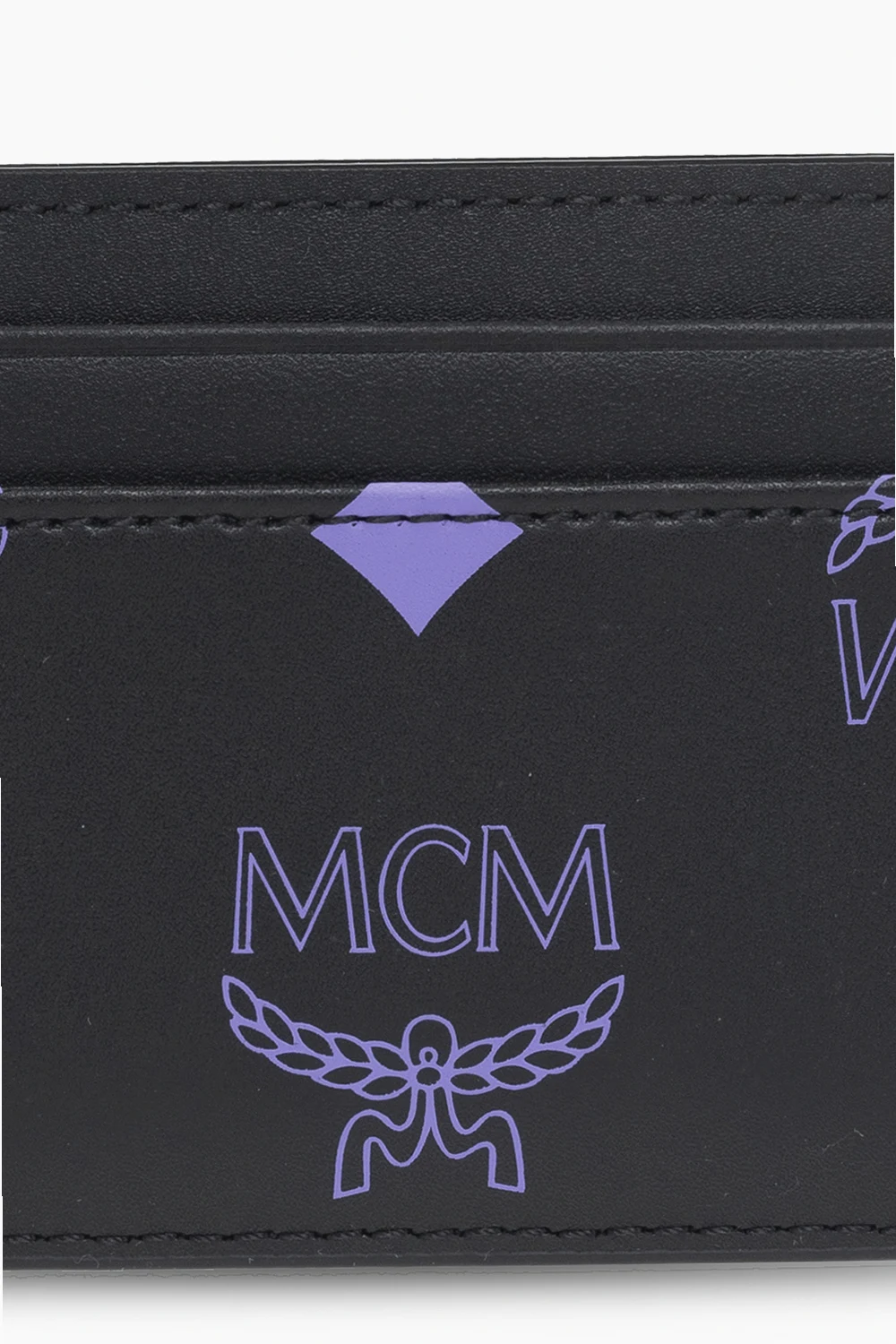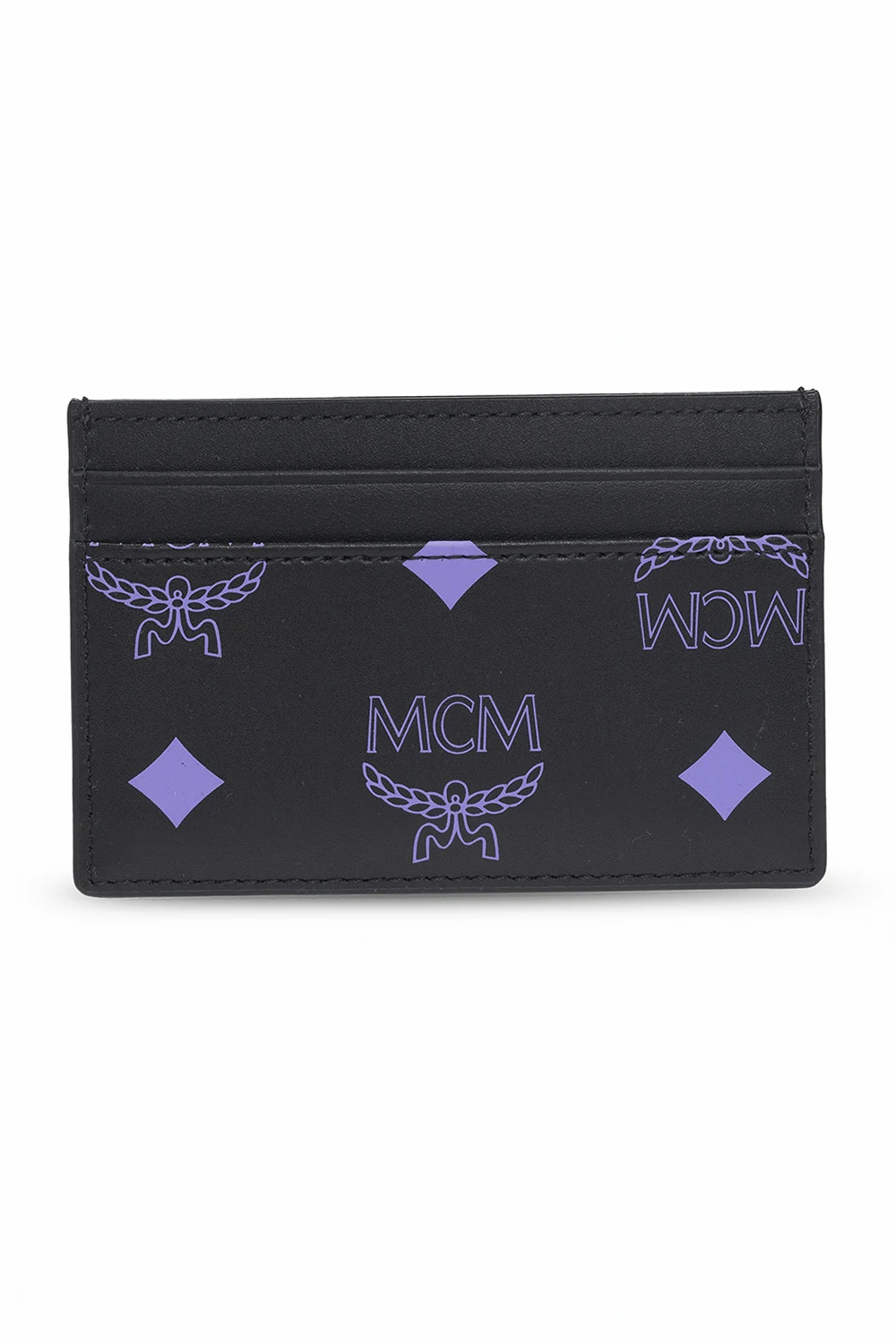 Black and purple ‘M Pup’ card holder from MCM. Made of leather, this model features a Visetos logo pattern, French bulldog appliqué and five card slots.