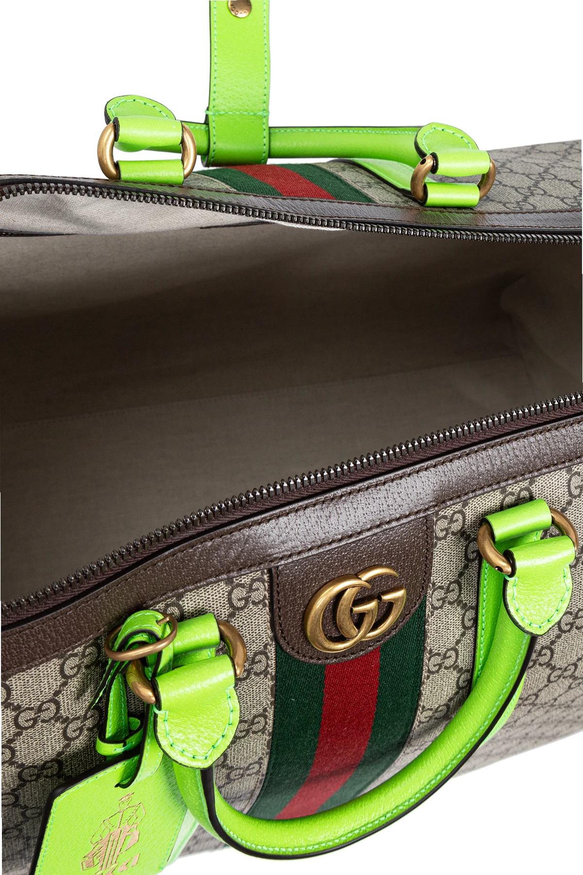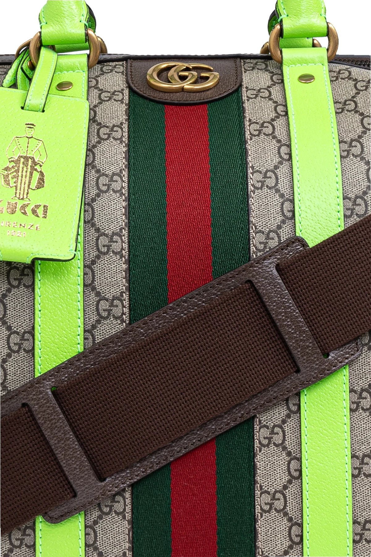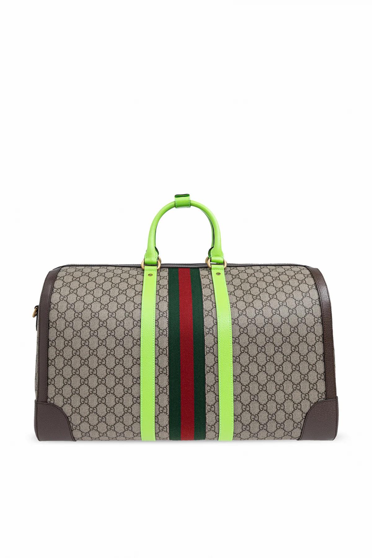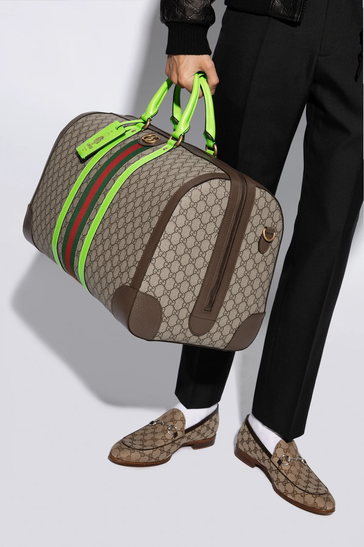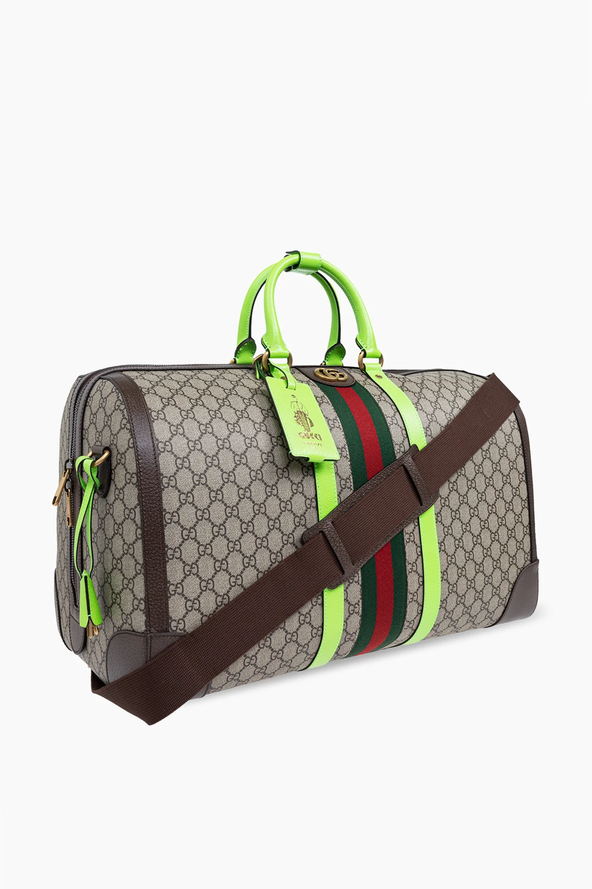 Introducing the Savoy Large travel bag by Gucci, an epitome of luxury and functionality. This piece, with its distinctive suitcase-like silhouette, exudes sophistication through its straight lines and flat bottom that allows it to stand upright. Crafted from the finest calfskin leather and \'GG Supreme\' canvas, it showcases the brand\'s iconic monogram pattern set against a beige and brown palette. The bag’s allure is further enhanced by the striking contrast of neon-green handles, brand tag, and zipper edges, complemented by green and red stripes running down its center. The gold-toned brand logo adorning the front adds a touch of elegance, while brown reinforcements on corners and edges signify durability. It features a spacious main compartment with a double-sided zipper, lined with a durable material interior, including two zippered pockets for organization. The Savoy Large also boasts an adjustable brown shoulder strap with metal clasps for versatile carrying options. Distinctive details such as the detachable key holder, custom \'Liftboy\' tag, and neon accents make this bag a unique accessory for the discerning traveler. Why Purchase This Product? Unparalleled craftsmanship from Gucci, blending luxury with practical design. Exclusive \'GG Supreme\' canvas and calfskin leather materials, offering durability and style. Adjustable and detachable shoulder strap for customized comfort and multiple carrying options. Internal organization features, including two zippered pockets and a detachable key holder, ensure your essentials are always within reach. Vivid color contrasts and refined metallic accents underscore its unique aesthetic, making it a standout piece.