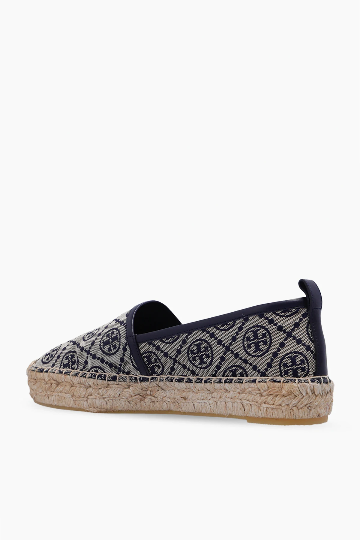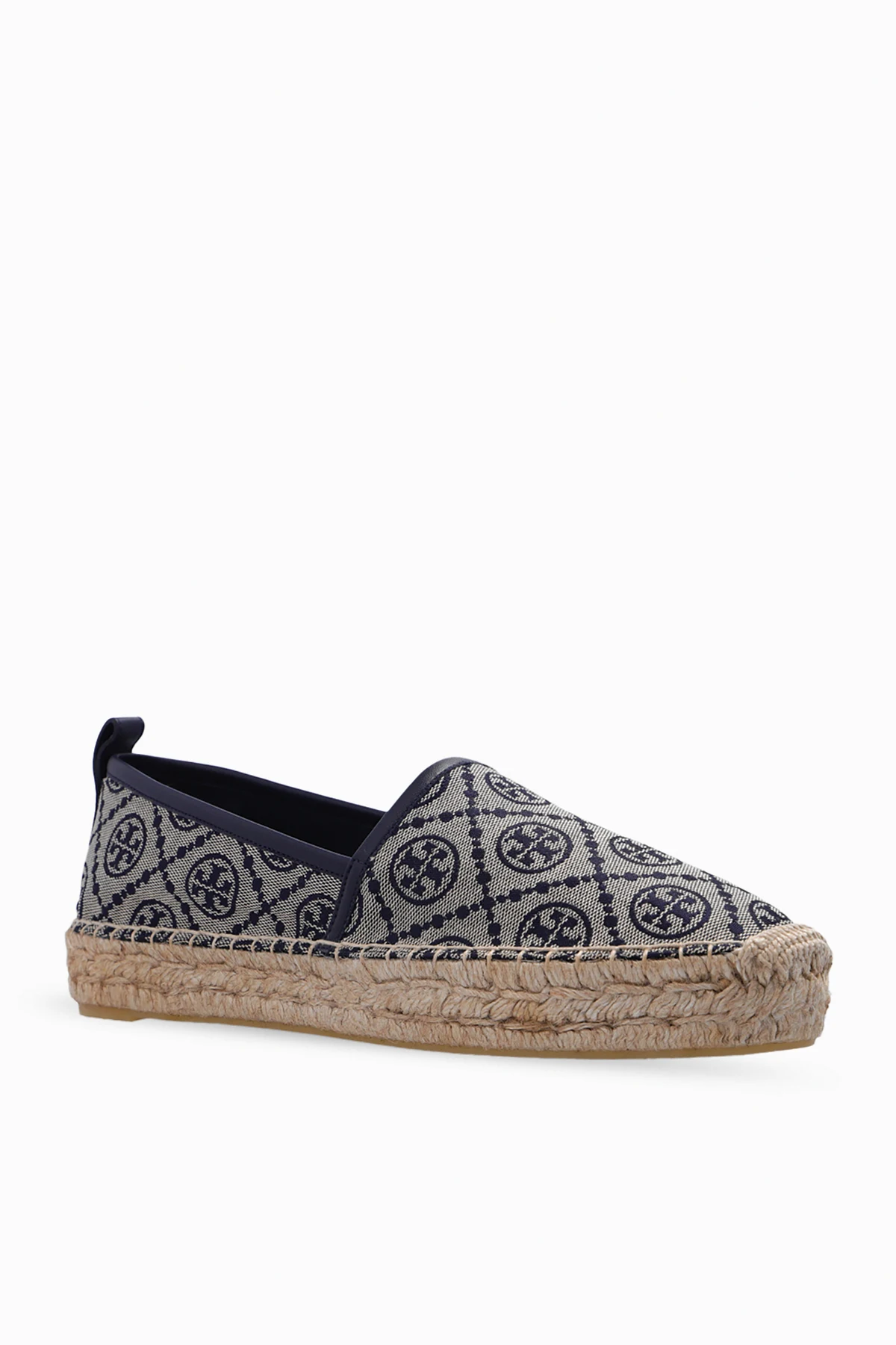 Beige and navy blue espadrilles from Tory Burch. Crafted from monogrammed fabric and trimmed with leather piping, this model features a rubber sole with a beige jute overlay.