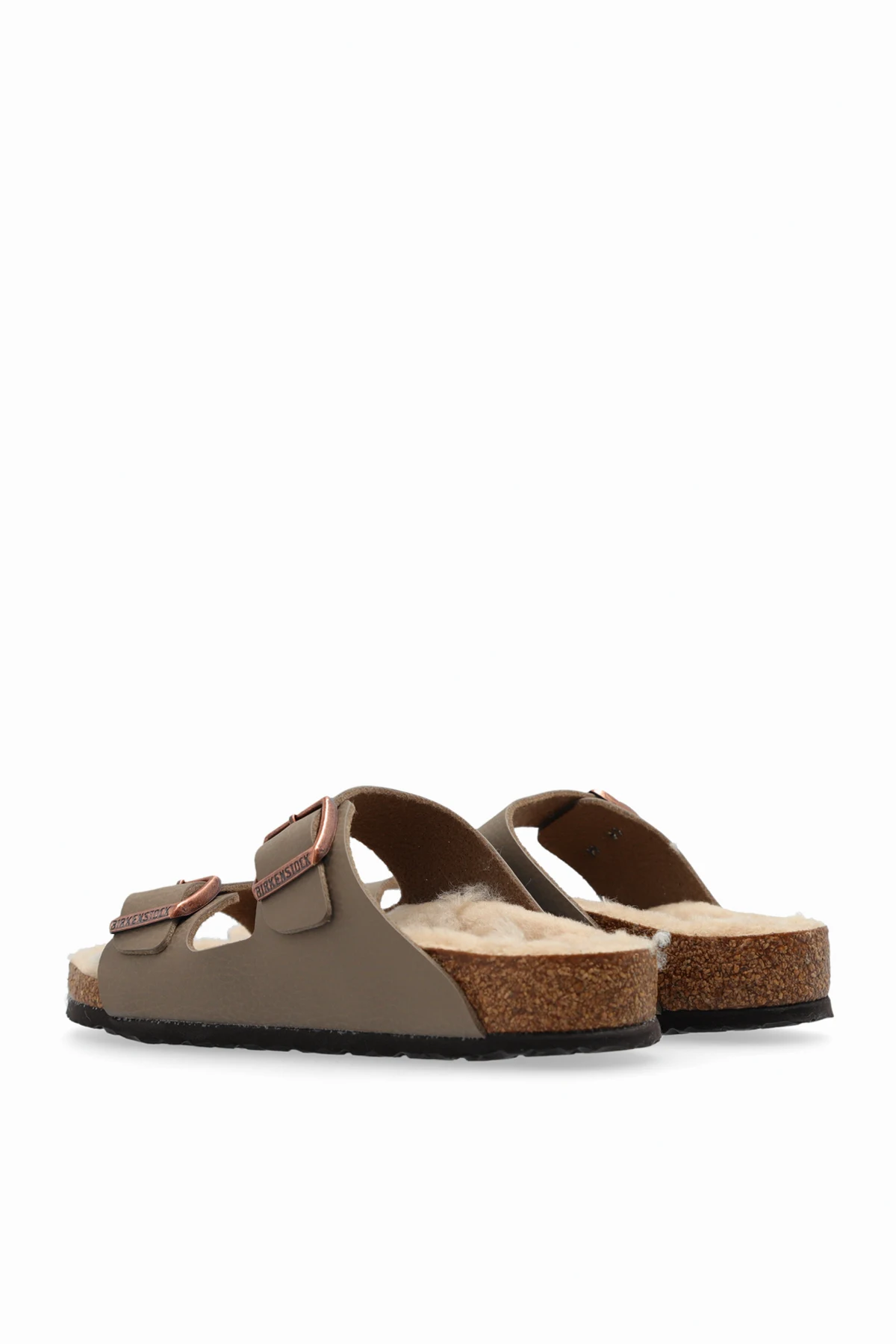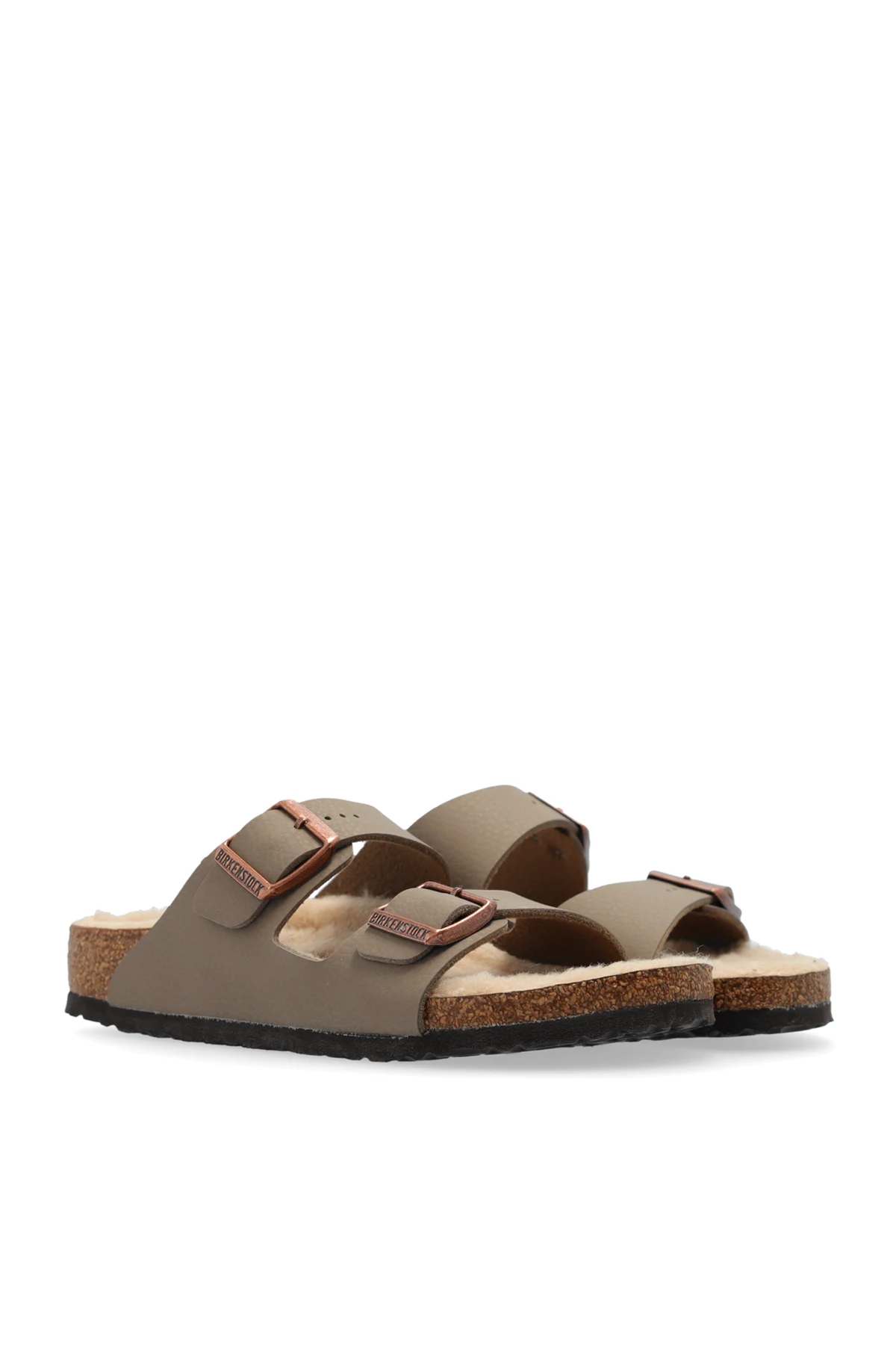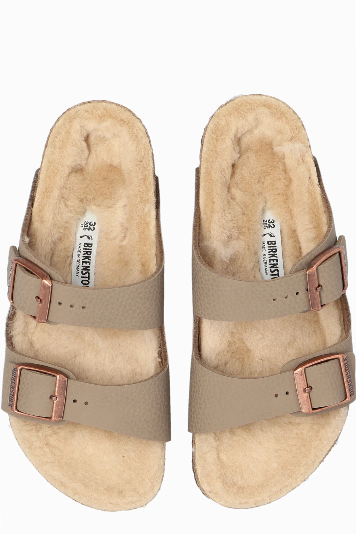 Introducing the \'Arizona BS\' sandals by Birkenstock Kids, a testament to timeless elegance and unparalleled comfort. These medium-heel slides, presented in a sophisticated beige hue, offer a perfect blend of style and functionality. Each sandal features two broad straps across the midfoot, adorned with brown accents for a refined finish. These straps are equipped with adjustable buckles, allowing for a tailored fit to accommodate various foot widths. The sole of the \'Arizona BS\' sandals is crafted from a cork-like material paired with EVA foam, ensuring exceptional cushioning and support with every step. The insole, made from smooth Birko-Flor® and genuine sheepskin fur, cradles the foot in luxurious comfort. An anatomically shaped profile promotes proper foot alignment, highlighting the brand\'s commitment to foot health. Subtle details, potentially including the brand\'s logo on the buckles or straps, underscore the authentic and exclusive nature of these sandals. With their sturdy construction and attention to detail, the \'Arizona BS\' sandals embody the high standards of exclusive brands, making them a versatile addition to any wardrobe. Why Purchase This Product? Adjustable Fit: Customizable strap buckles ensure a snug fit for various foot widths. Elegant Design: Beige color with brown accents offers versatility and sophistication. Luxurious Comfort: Birko-Flor® and sheepskin lining paired with a cork and EVA sole provide superior cushioning. Supportive Structure: Anatomically shaped sole promotes healthy foot posture. Exclusive Details: Subtle branding elements affirm the sandals\' authenticity and high-quality craftsmanship.