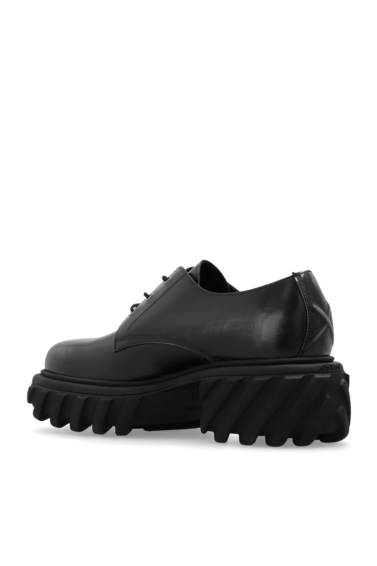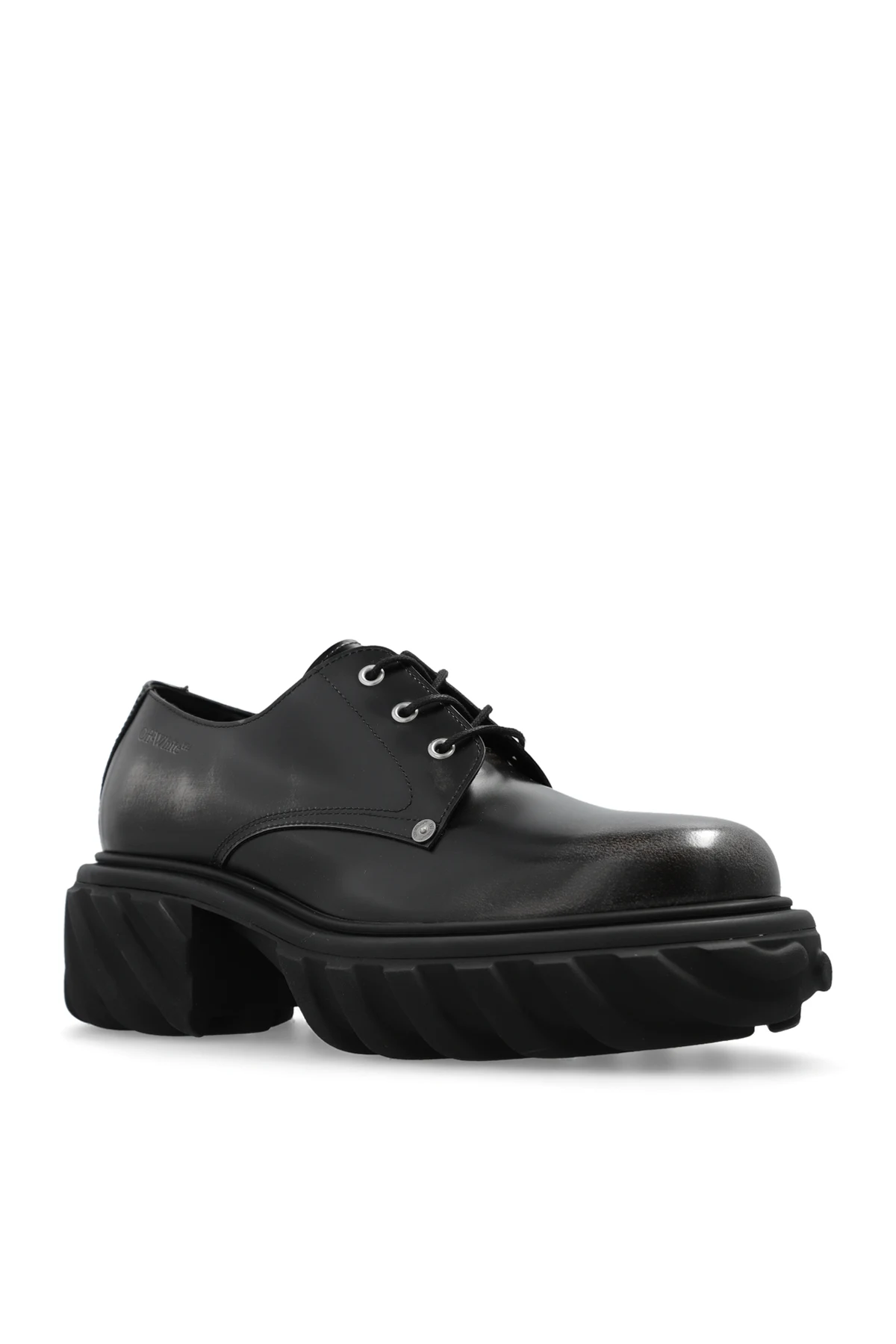 Black shoes from Off-White. Made of leather, this lace-up pair features a cracked effect, embossed logo and black rubber sole.