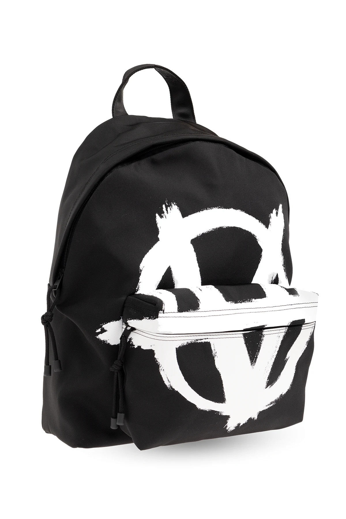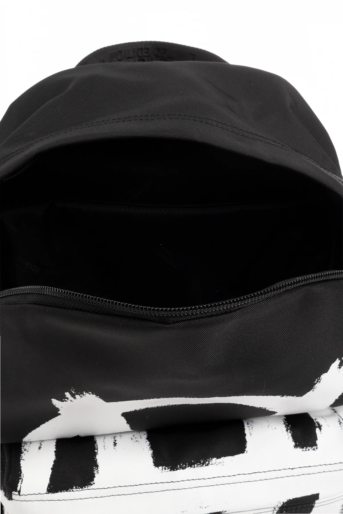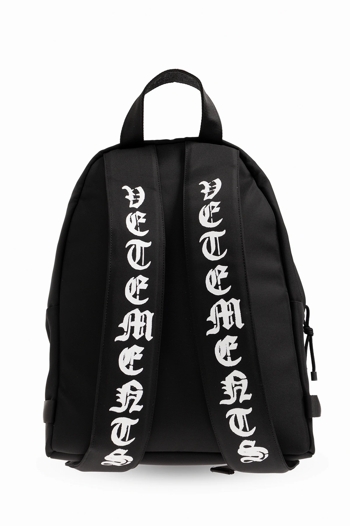 Black backpack from VETEMENTS. Fastened with a two-way zip, this design features a white logo pattern, zip pocket, half-round handle, adjustable shoulder straps, black metal hardware and one internal compartment with one slip pocket.