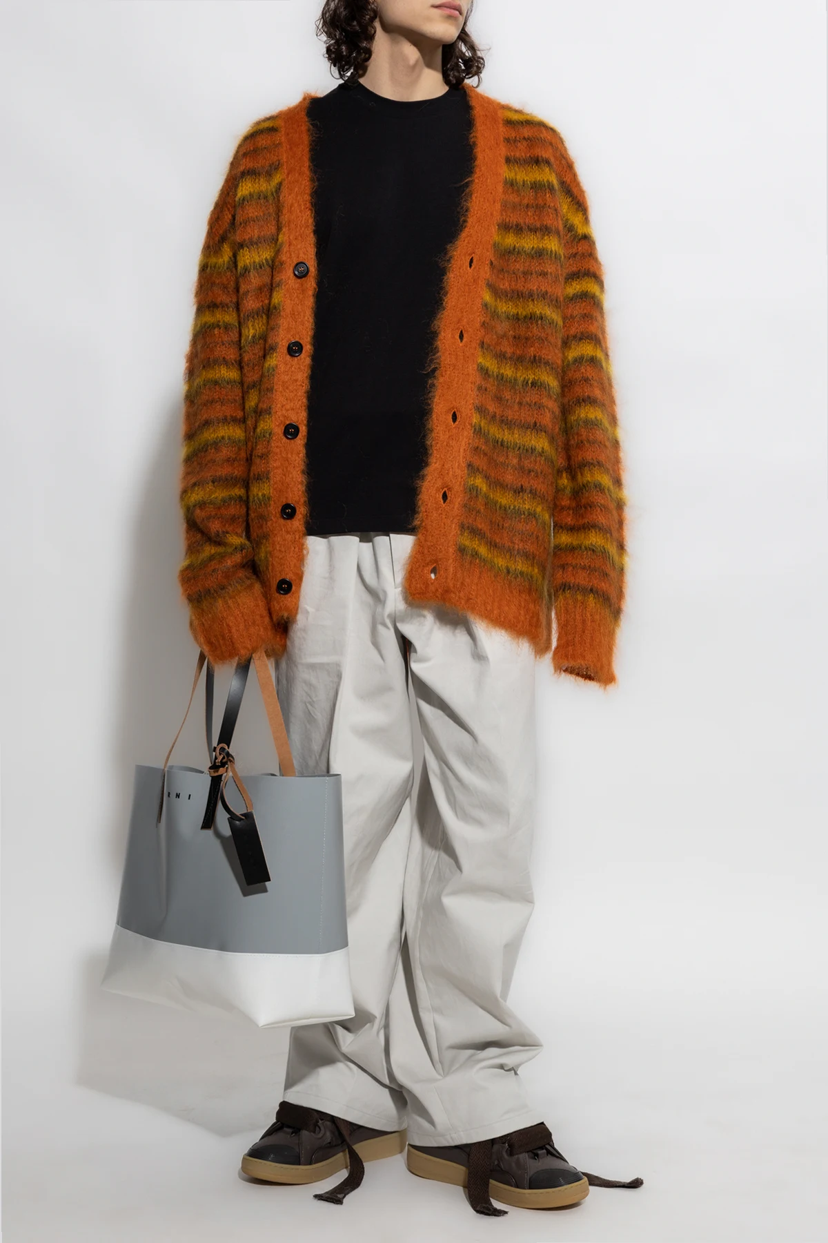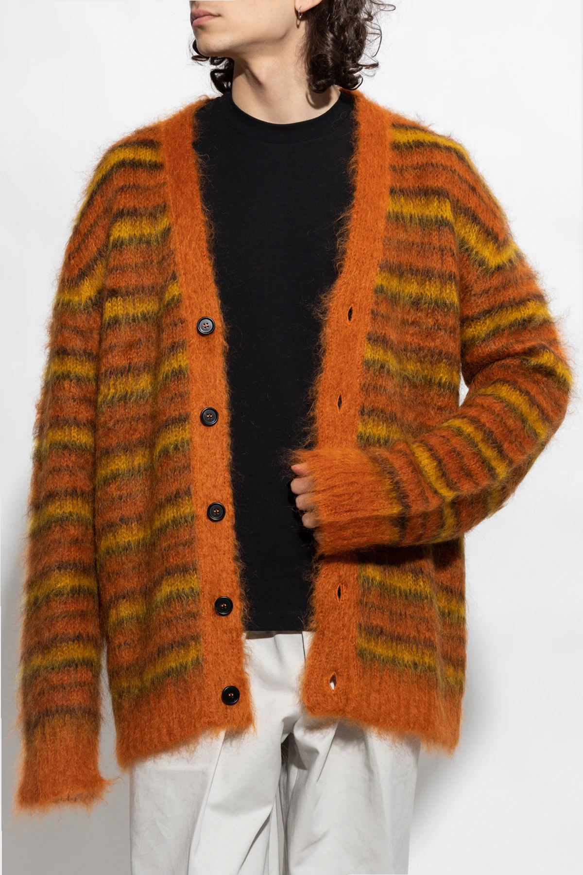 Orange, brown and yellow cardigan from Marni. Crafted from a mohair blend, this style fastens with buttons and showcases a stripe pattern, a V-neckline and ribbing on the collar, bottom hem and long sleeves.