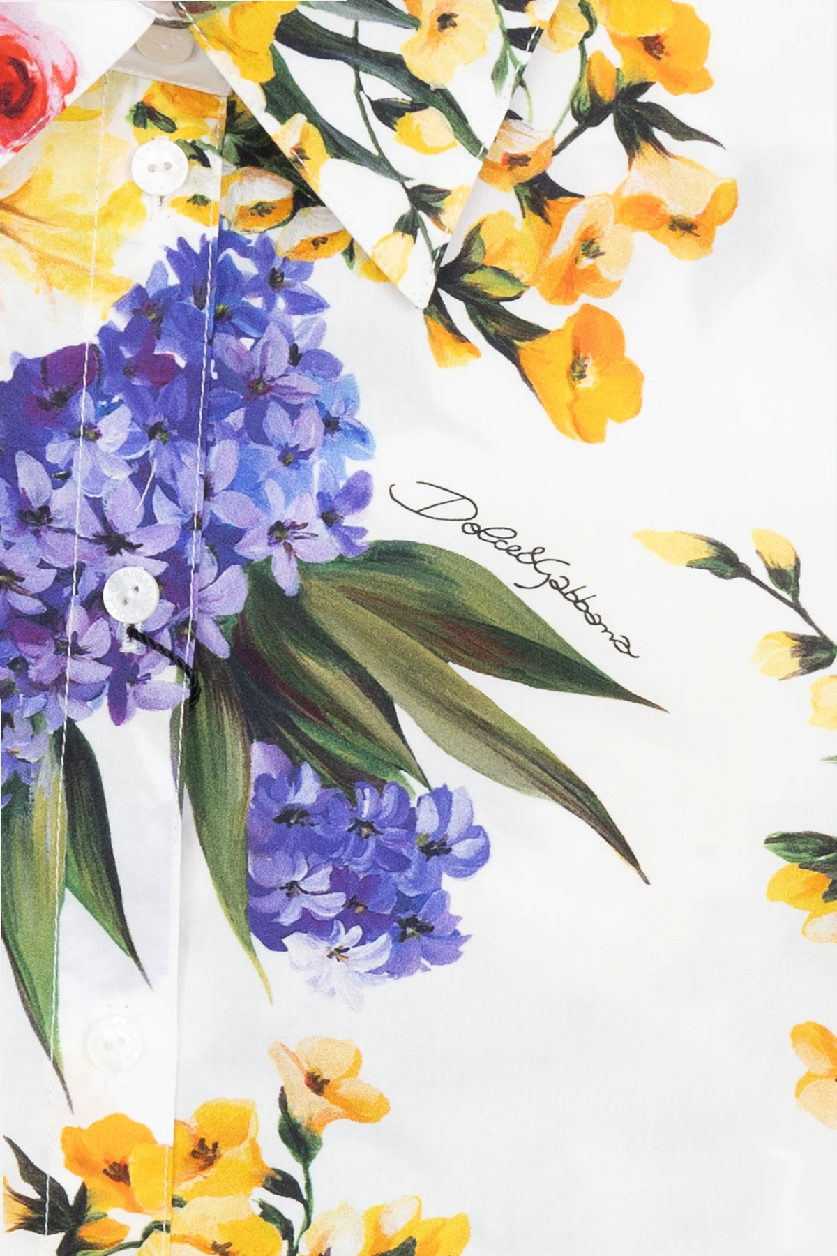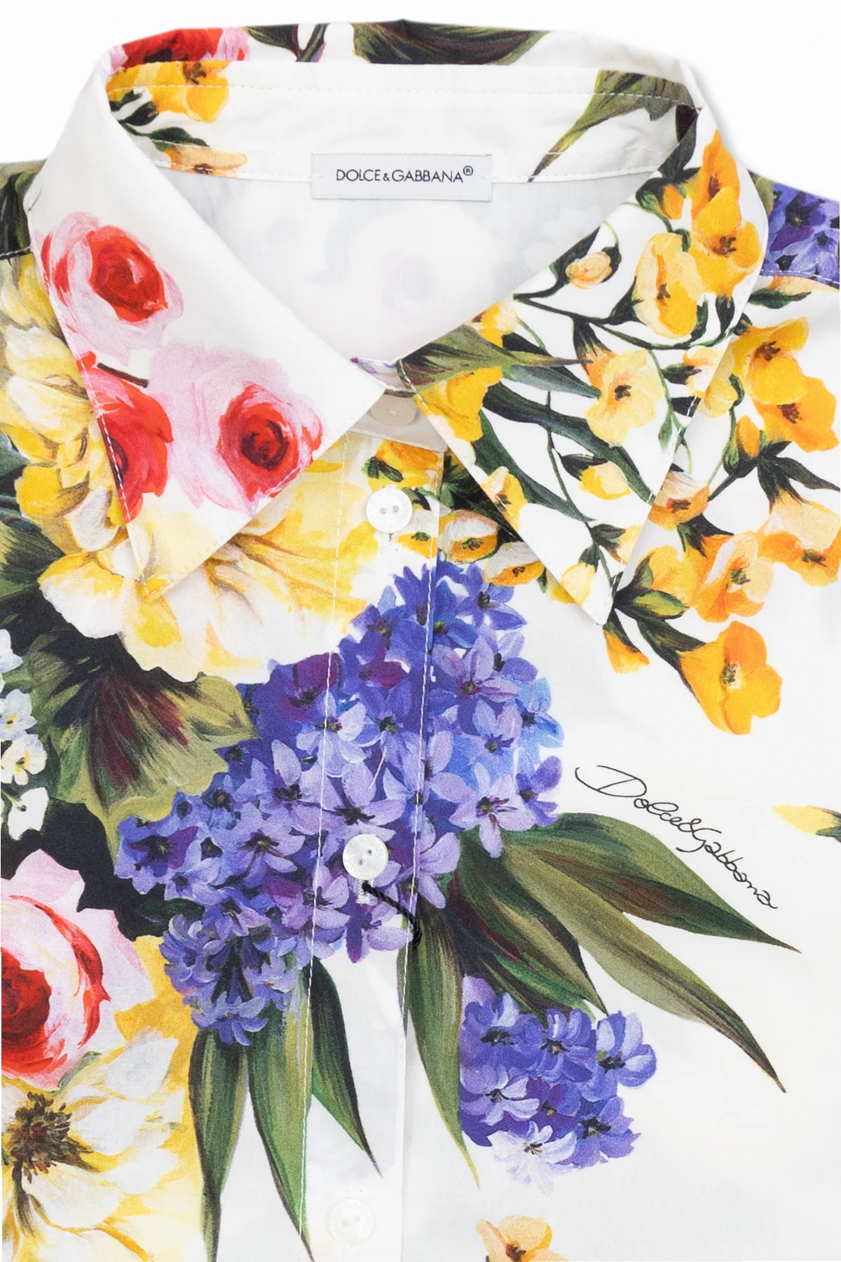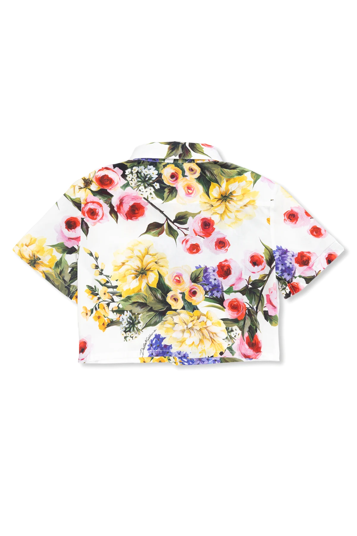 White shirt from Dolce & Gabbana Kids. Made of cotton with a cropped fit, this style showcases a colourful floral motif accompanied by a logo, button fastenings and short sleeves with turn-up cuffs.