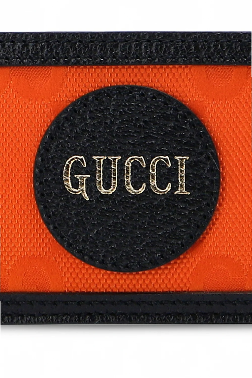 Black and orange card holder from Gucci. Crafted from leather and trimmed with logo-embroidered eco nylon, this accessory features a gold-tone logo print and three card slots.