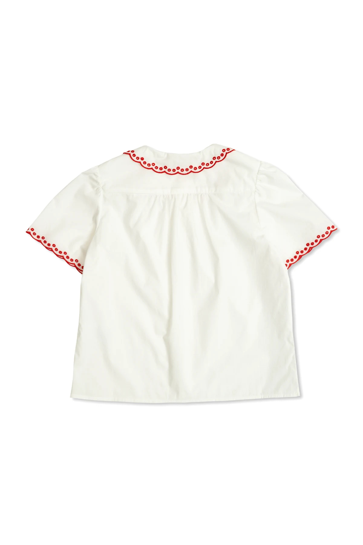 Introducing the ‘Ezzie’ Blouse by Bonpoint, a quintessential embodiment of French elegance and charm. This white, lightweight blouse is crafted from the finest cotton, ensuring a soft and gentle touch against the skin. The blouse features a short sleeve design with a delicate red embroidery in the shape of ruffles and circles adorning the collar and sleeve edges, adding a whimsical and feminine touch. The front is elegantly secured with buttons, while a subtle red cherry embroidery embellishes the fabric, a signature motif of Bonpoint. Expertly produced in Madagascar, this garment is a testament to Bonpoint’s dedication to superior craftsmanship and timeless style, making it a perfect choice for young girls aged 4-14, suitable for a variety of occasions. Why Choose This Product? Exquisite design with unique red embroidery Crafted from high-quality 100% cotton Timeless elegance from renowned French brand Bonpoint Produced with exceptional craftsmanship in Madagascar