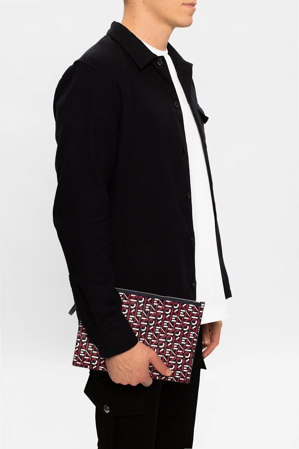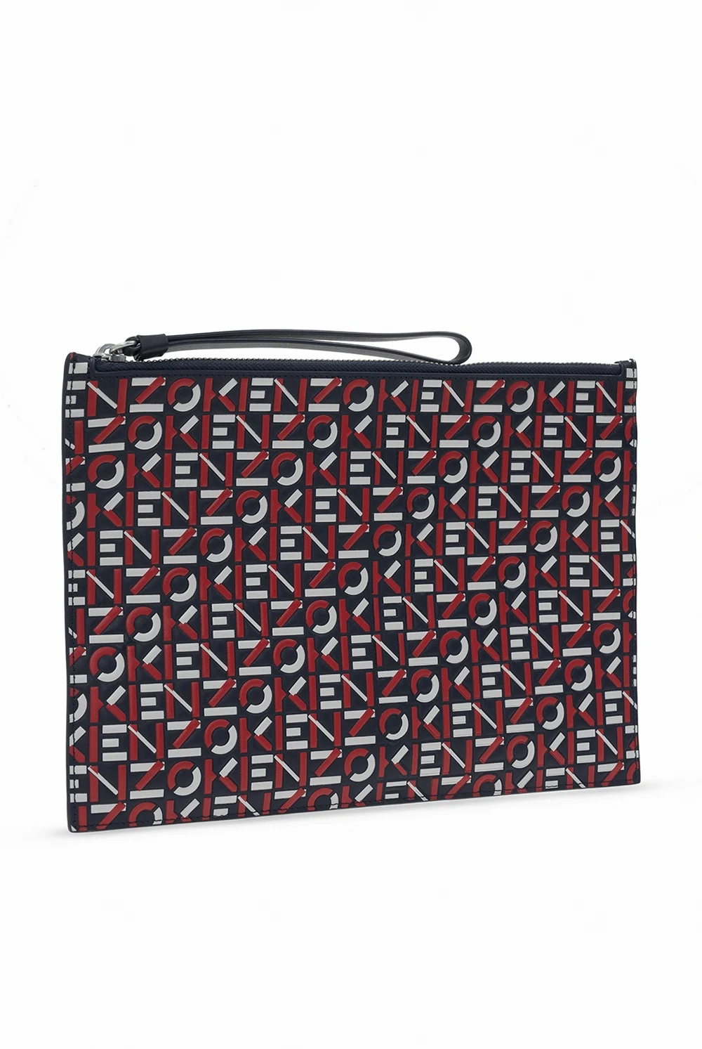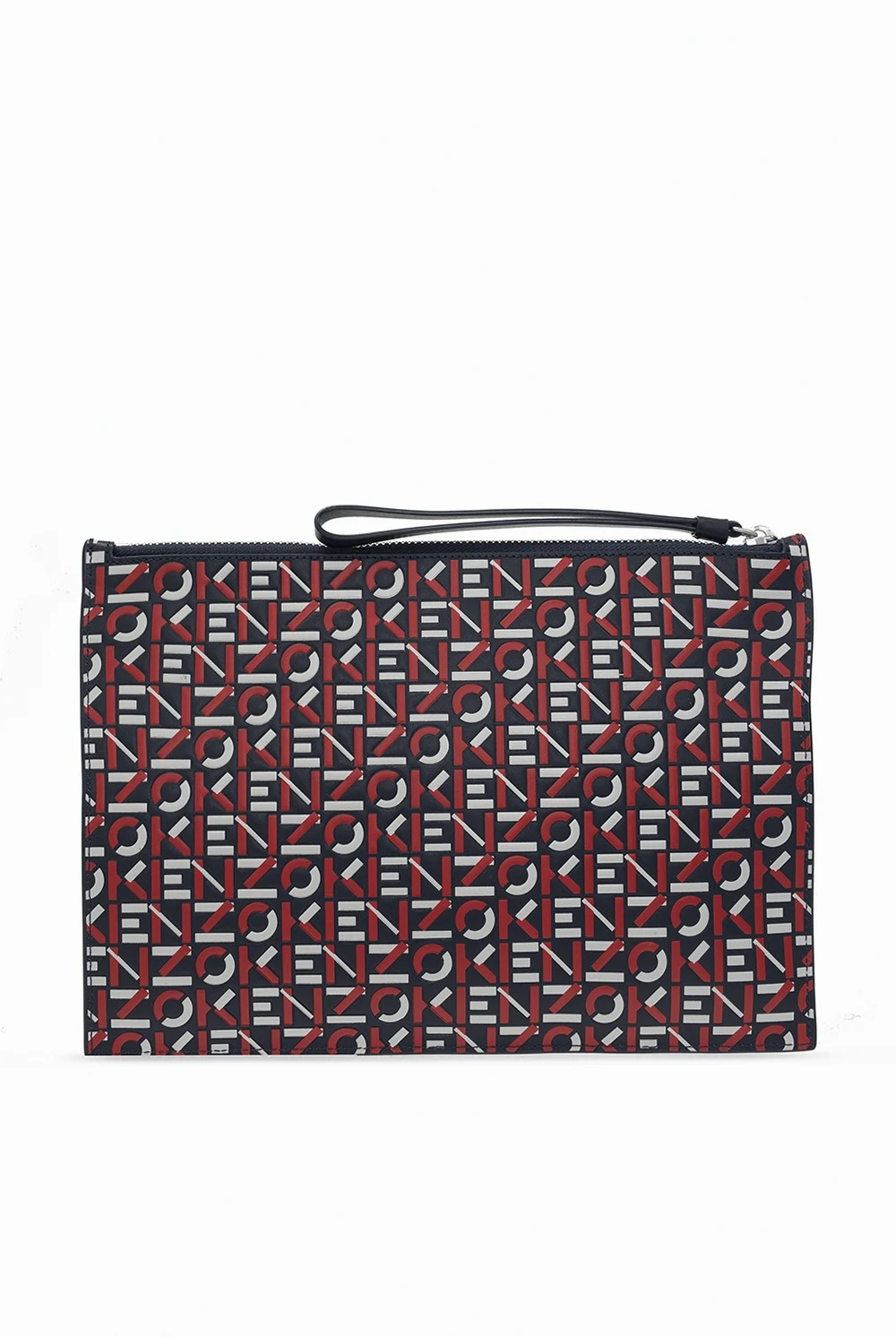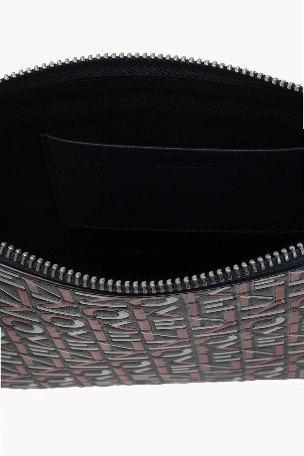 Black clutch from Kenzo. Crafted from cow leather, this item features a zip closure, printed logo pattern in black and white as well as one internal compartment with one card slot.