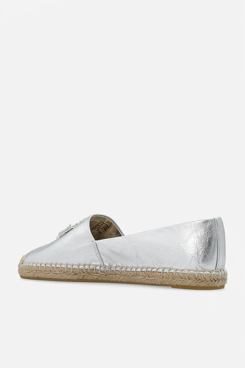 Silver-tone ‘Eleanor’ espadrilles from Tory Burch. Made of leather, this model features Double T logo hardware and a beige sole in woven jute and rubber.