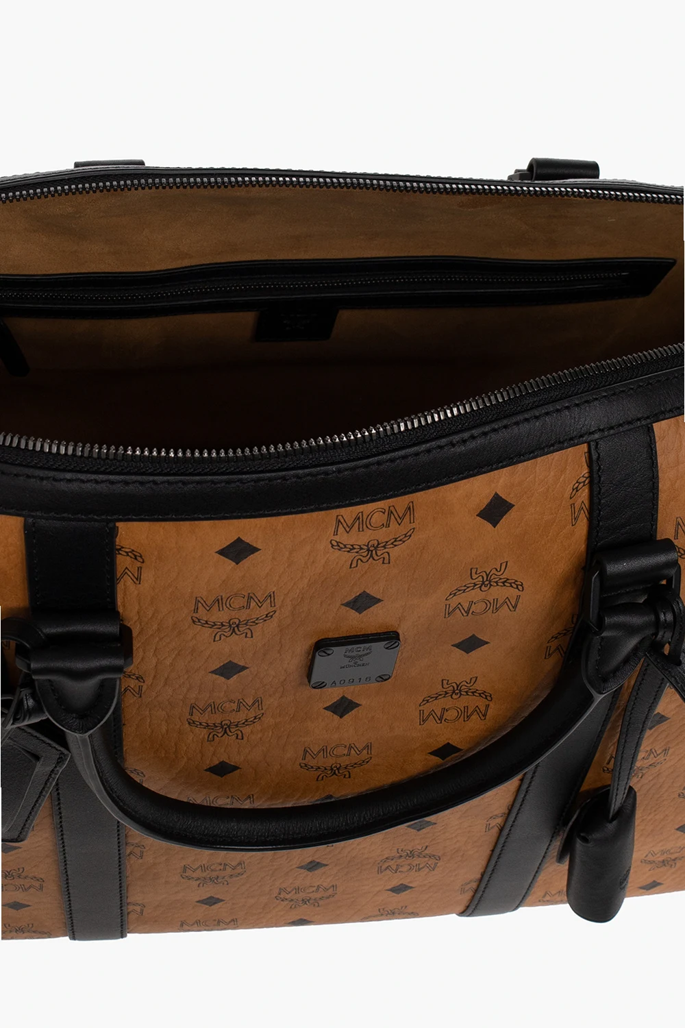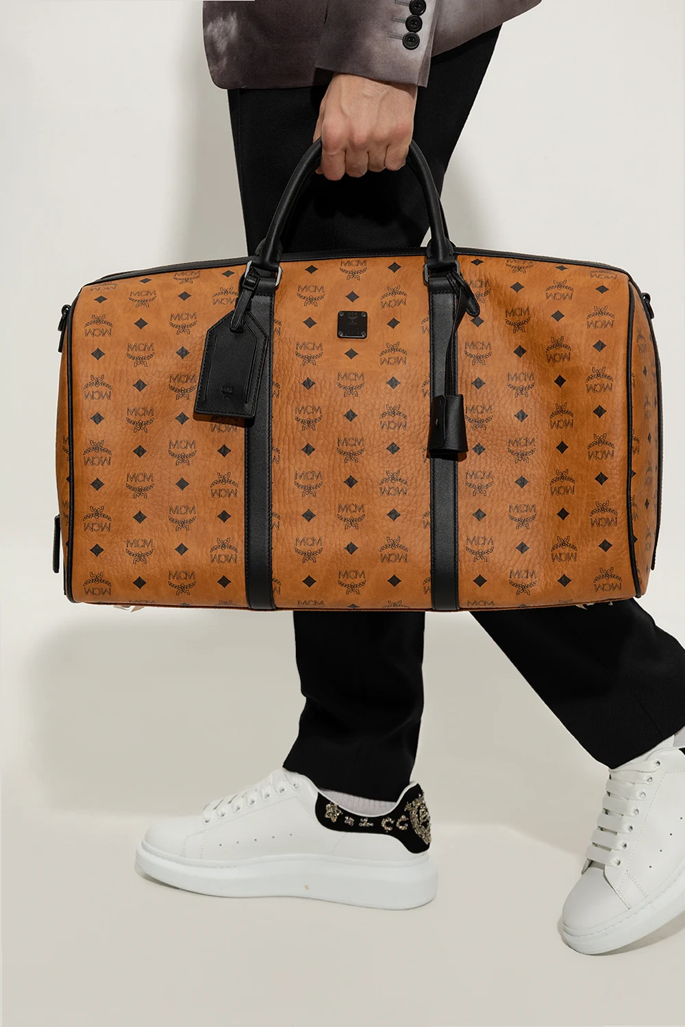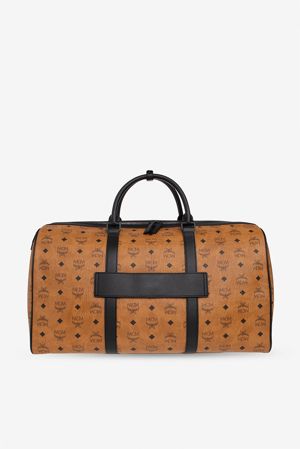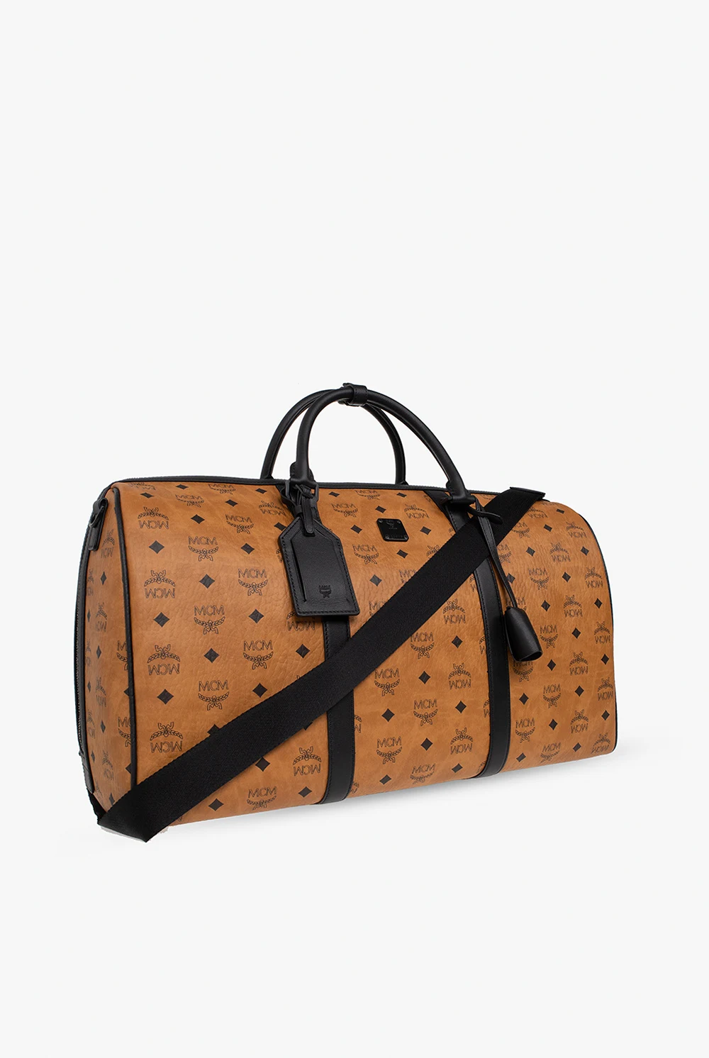 Brown and black ‘Weekender’ holdall bag from MCM. Made of faux leather with a black Visetos pattern, this model is complete with leather trims, two-way zip, logo appliqué, two half-round leather handles, detachable and adjustable shoulder strap, dark silver-tone metal hardware and one internal compartment with one zip pocket and two slip pockets. Comes with two pendants.