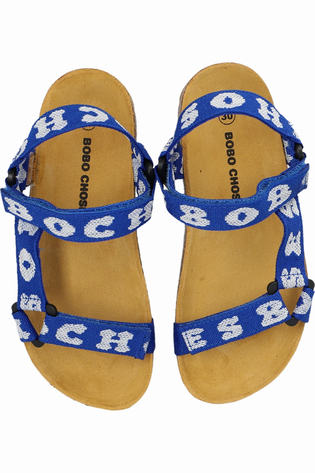 Dark blue sandals from Bobo Choses. Made from fabric, this model sits on a brown foam sole and showcases a white logo, velcro closures as well as an anatomically-shaped footbed and cork midsole.