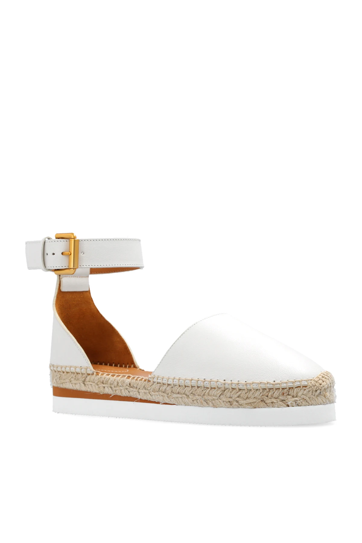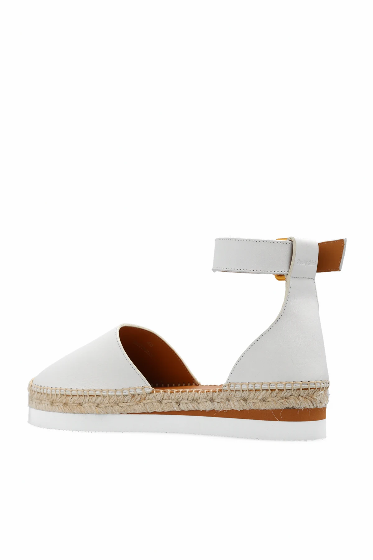Cream ‘Glyn’ espadrilles from See By Chloé. Made of leather, this model sits on a white rubber sole and features an adjustable ankle strap with a buckle and logo detailing on the heel counter.