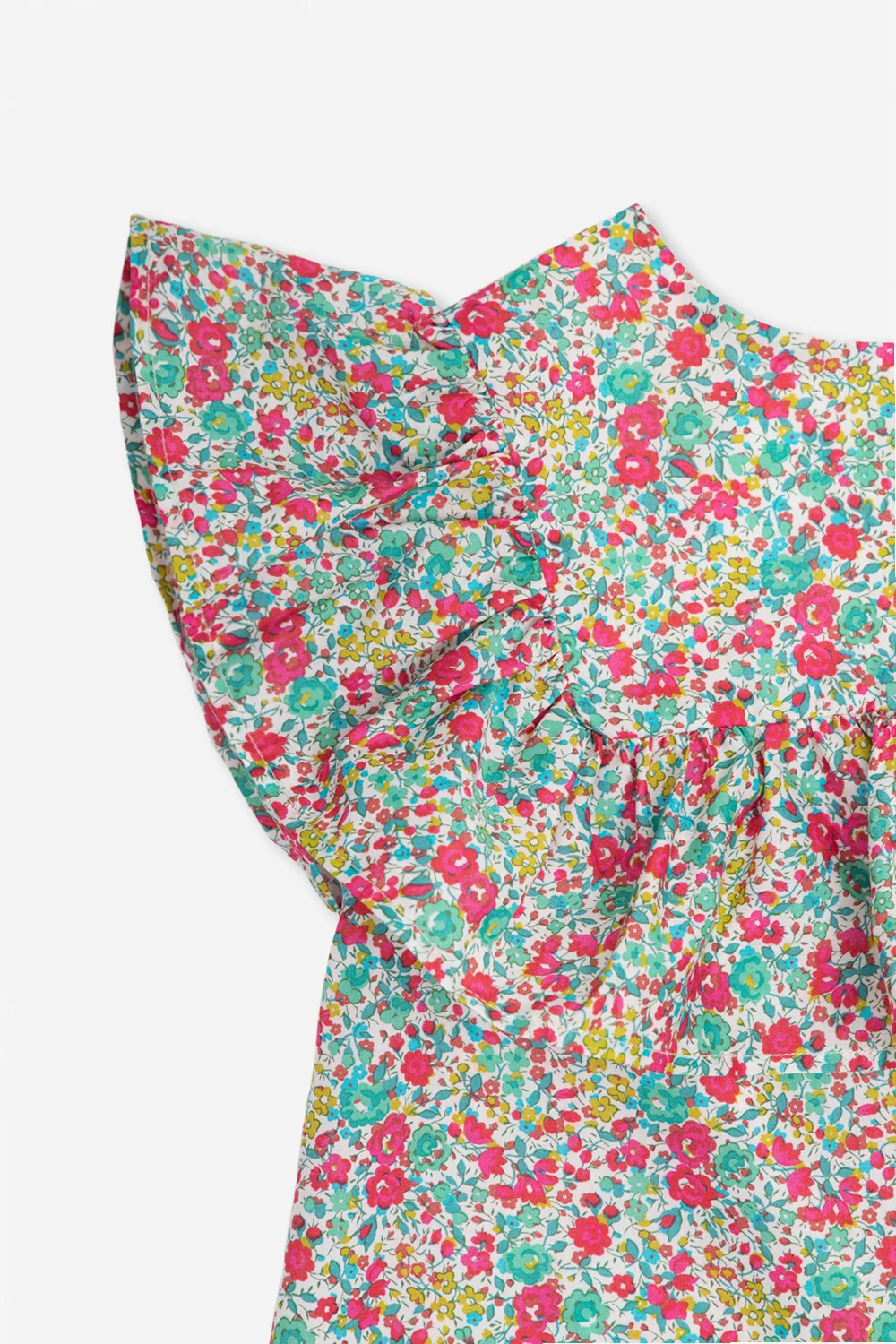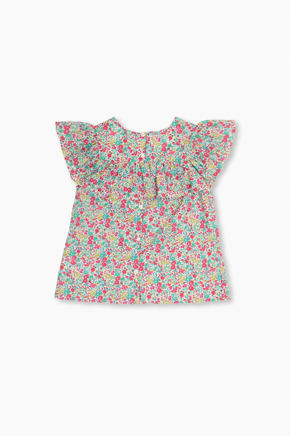 Multicoloured ‘Bianca’ top from Bonpoint. Crafted from Liberty organic cotton, this style fastens with back buttons and features a floral pattern and ruffle detailing on the round neck and long sleeves.