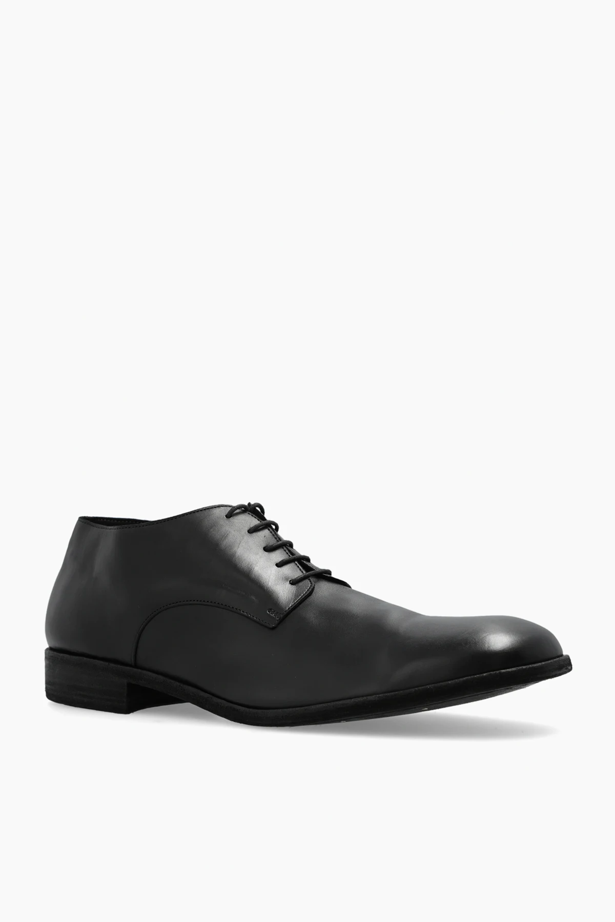 Black shoes from Petrosolaum. Crafted from naturally dyed calf leather characterized by its subtle texture and transparency due to semi-aniline finish. Manufactured using the McKay method, in which the insole, the instep leather, and the outsole are sewn all at once after being put into a wooden pattern. Sitting on a black leather sole, this lace-up model features a round toe and visible stitching. It\'s made from a single piece of leather, so that copies may differ slightly from each other and have naturally occurring roughness and minor flaws.