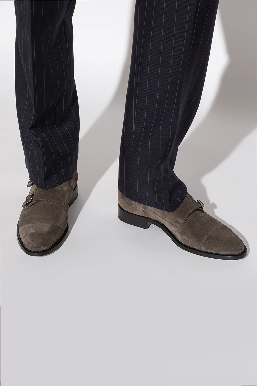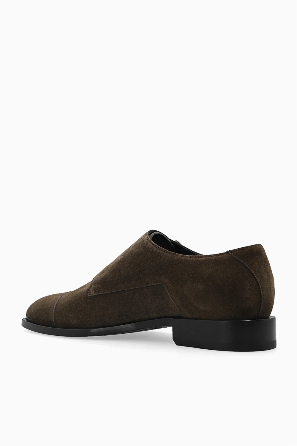 Khaki ‘Finnion’ shoes from Jimmy Choo. Made of suede, this pair features two straps with metal buckles with a logo, round toe and black leather sole.