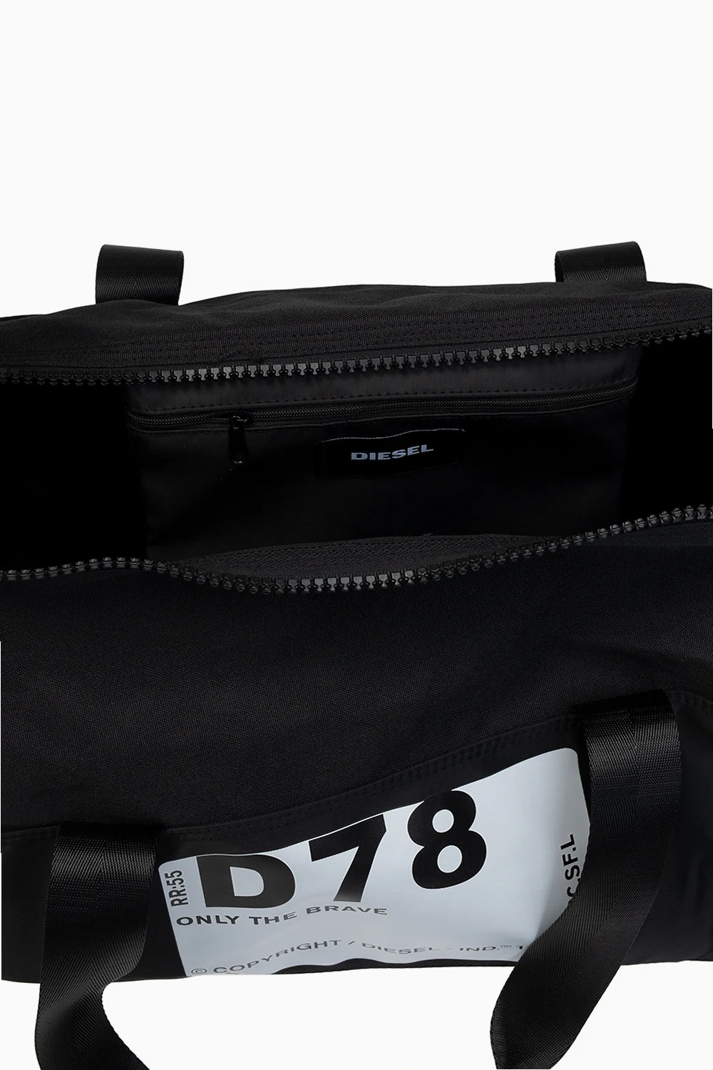 Black holdall bag from Diesel. Fastened with a zip, this design features a printed logo pattern in white, two half-round handles, detachable and adjustable shoulder strap, black metal hardware and one internal compartment with one zip pocket.