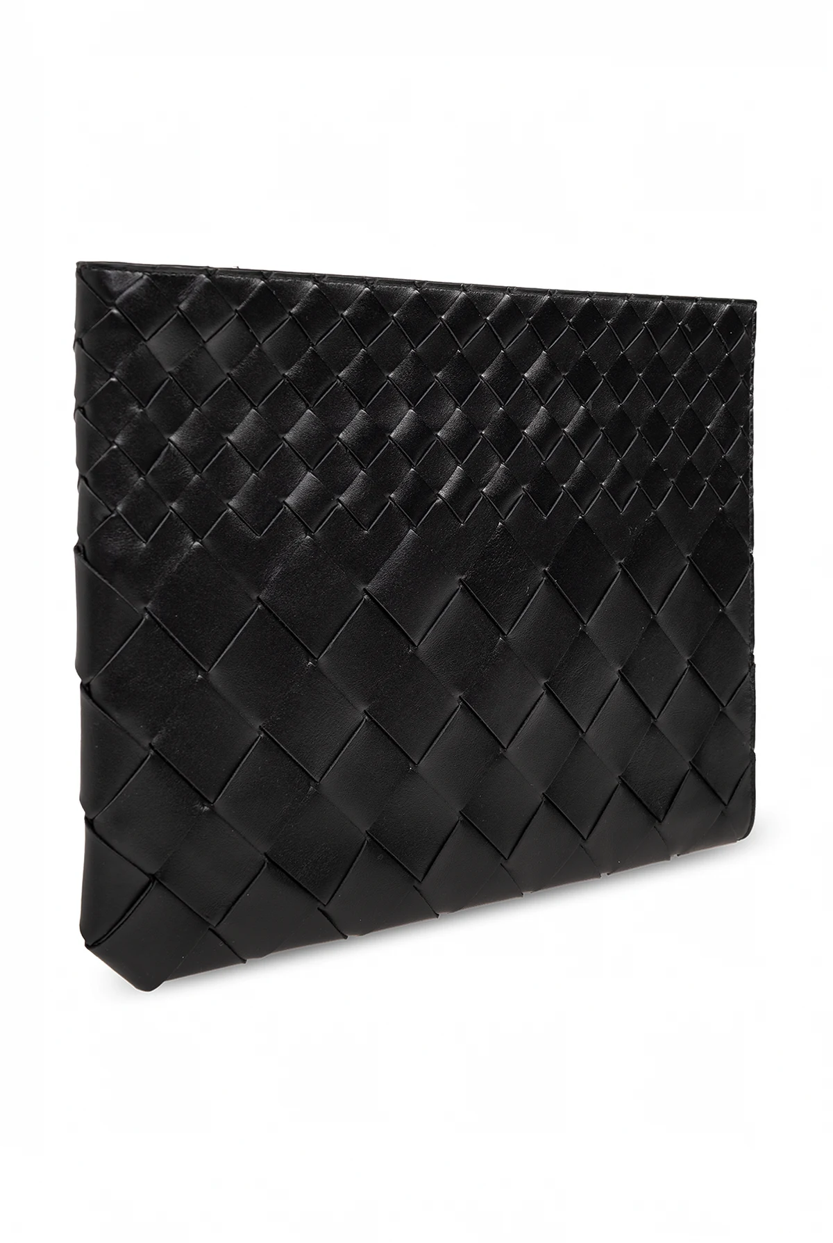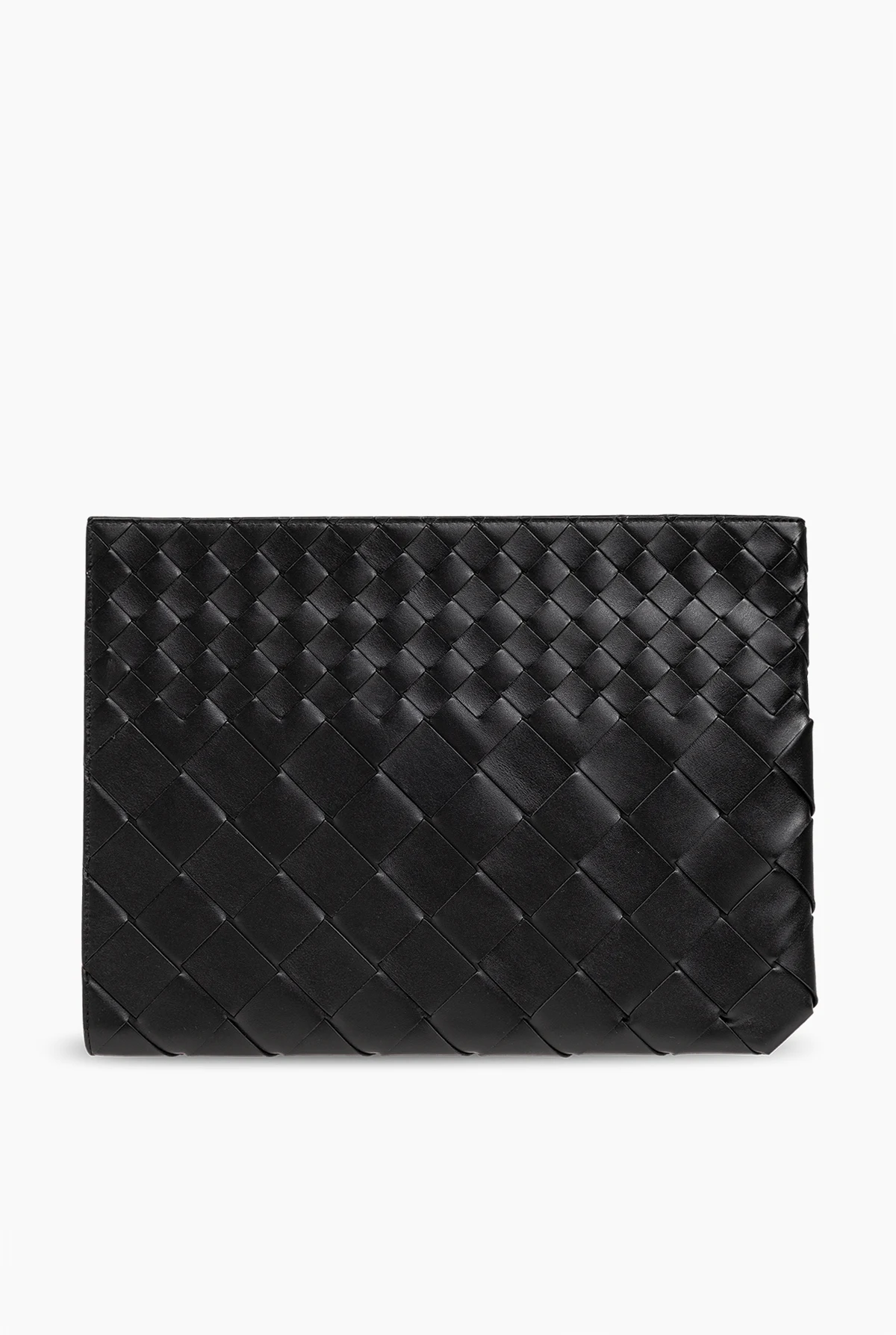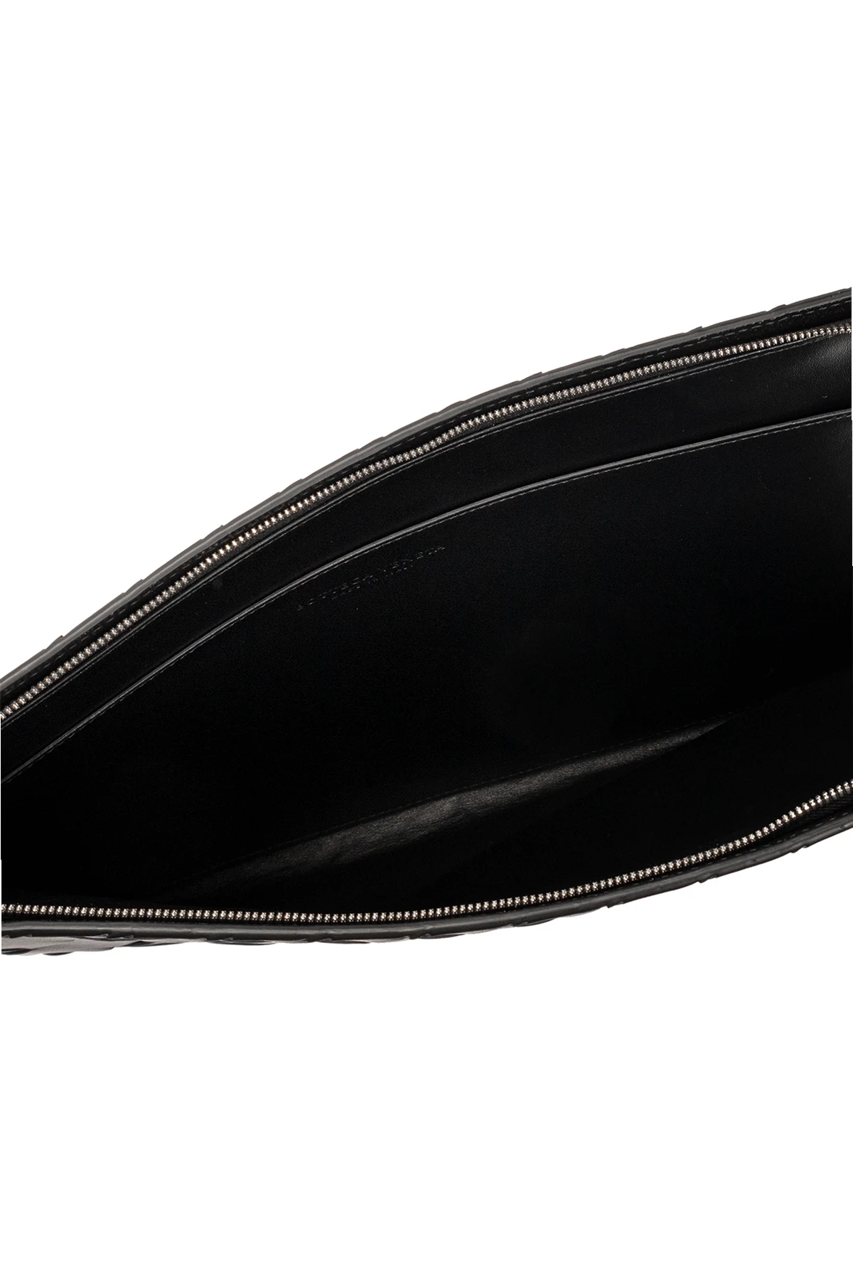 Black ‘Half Zip Pouch’ handbag from Bottega Veneta. Made from calf leather with the brand\'s signature Intrecciato weave, this item features a zip fastening, silver-tone metal hardware and one internal compartment with a slip pocket.