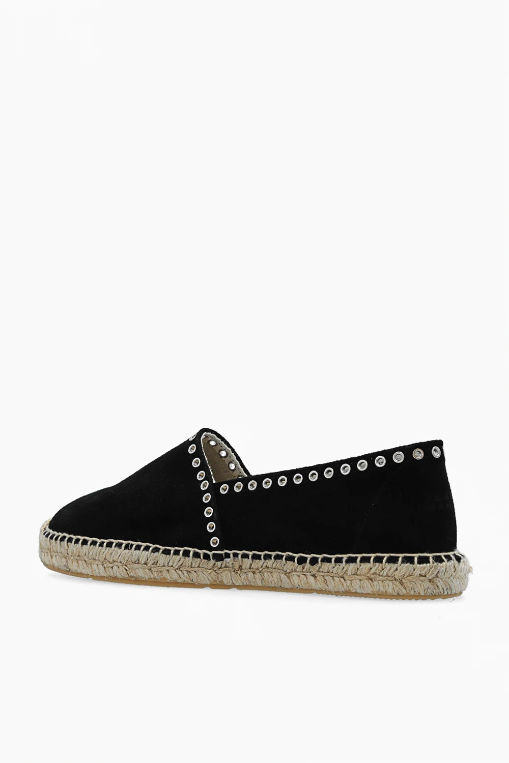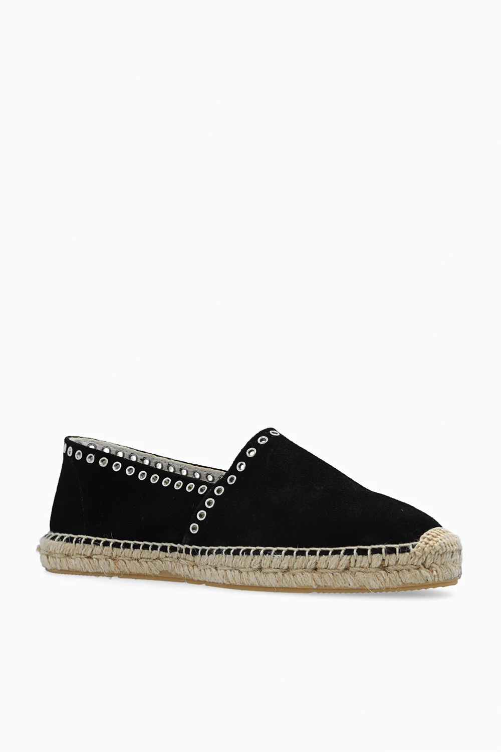 Black ‘Canae’ suede espadrilles from Isabel Marant. Crafted from suede, this pair features decorative perforations, silver-tone metal elements and beige rubber sole.