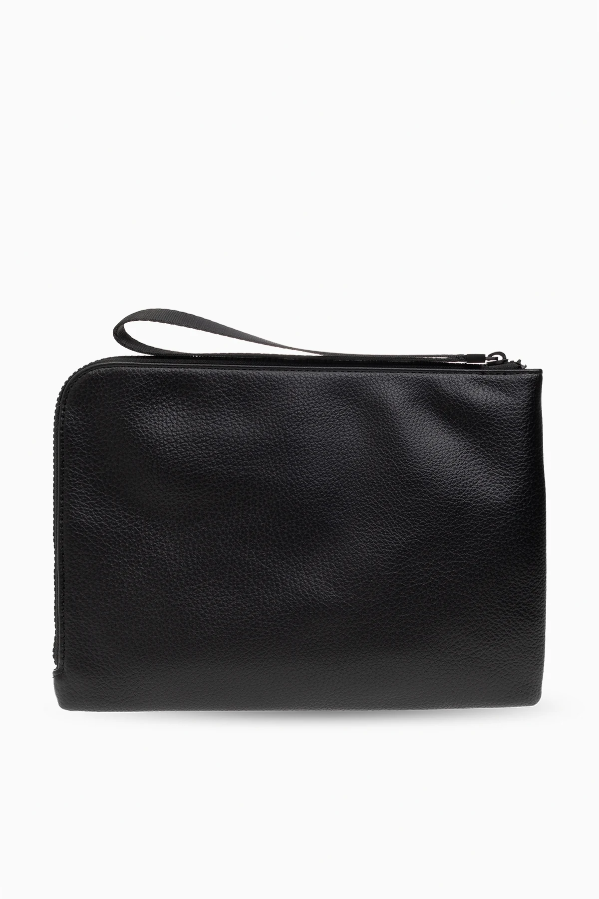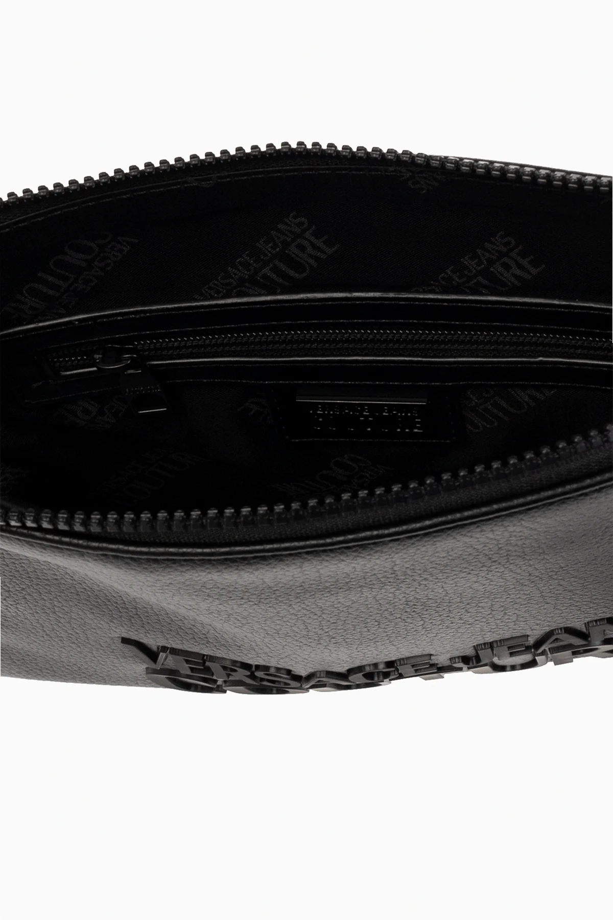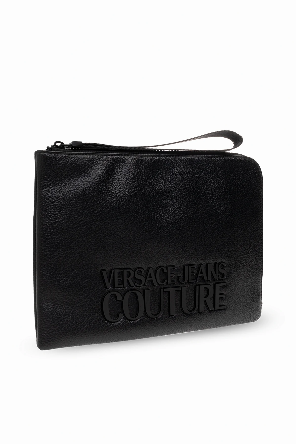 Black handbag from Versace Jeans Couture. Made from grained faux leather, this design features a zip fastening with a wrist strap, logo detail, detachable wrist strap, black metal hardware and one internal compartment with one zip pocket and one slip pocket.