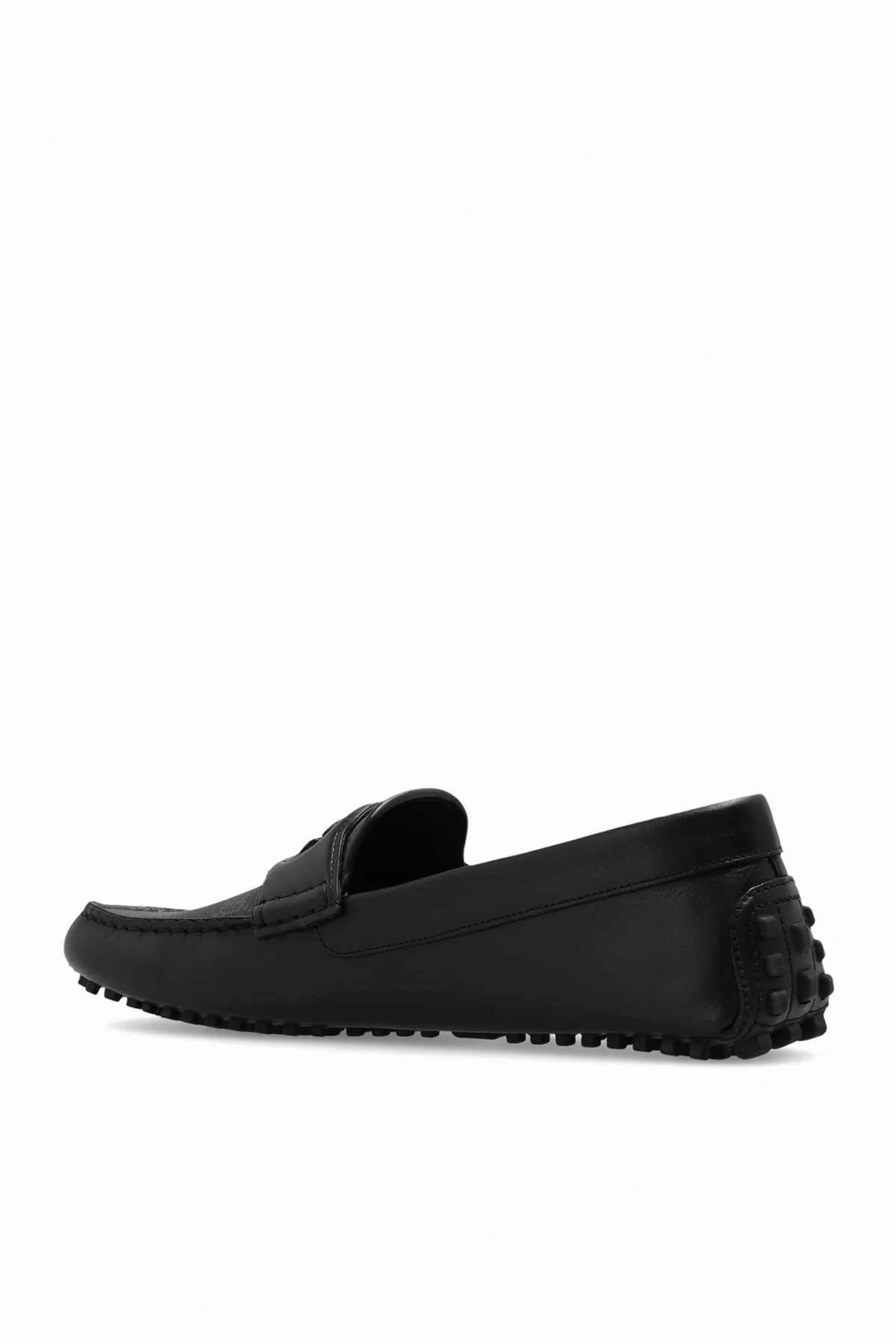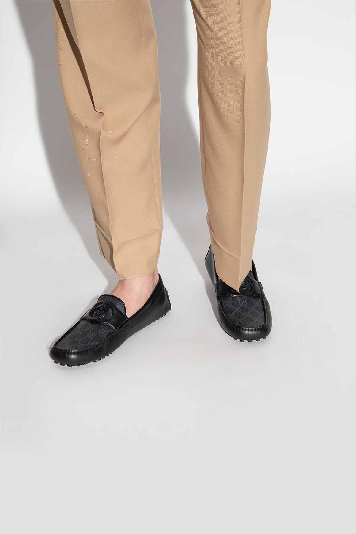 Black moccasins from Gucci. Crafted from leather and ‘GG Supreme’ canvas, this model sits on a black leather sole with a rubber trim and features a monogrammed strap on the vamp.