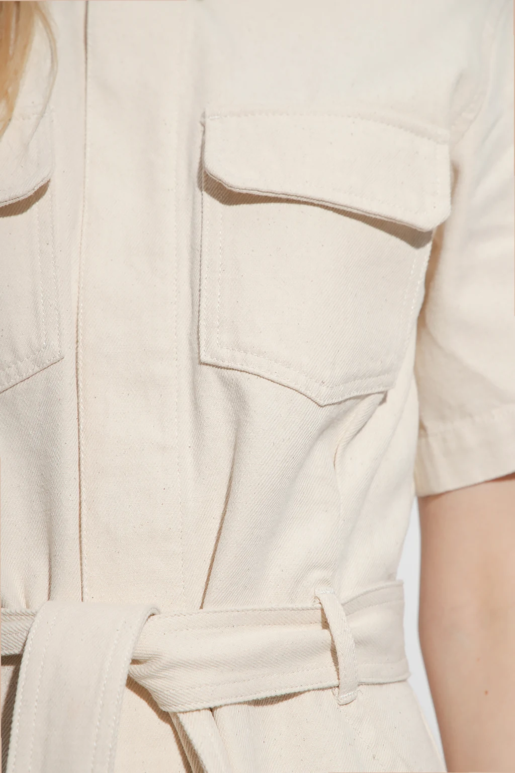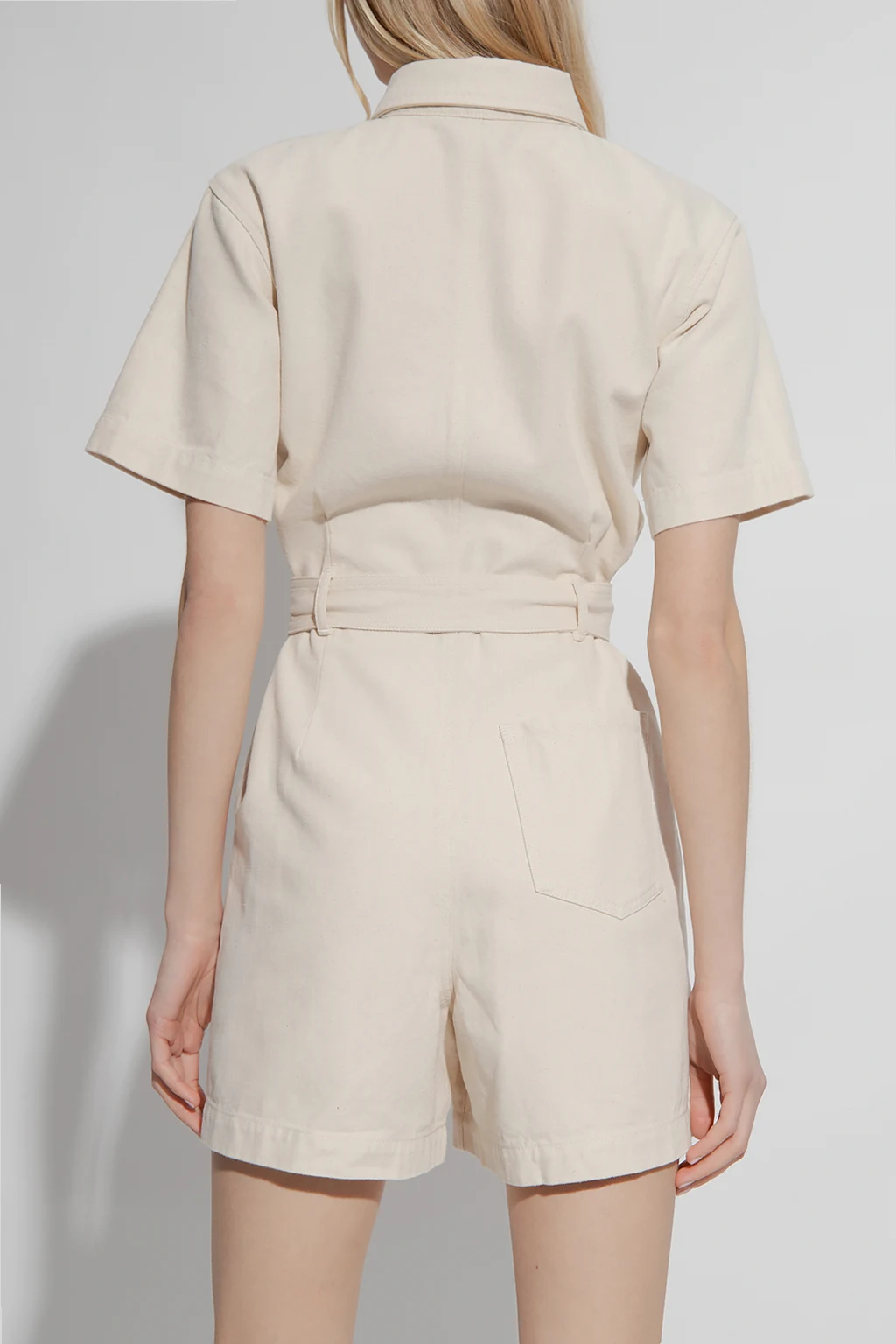 Cream ‘Antonia’ denim jumpsuit from A.P.C. With a snap-fastened collar, this style features button fastenings with a concealed placket, a waist-cinching tie belt, three slip pockets, two flapped pockets and short sleeves and legs.