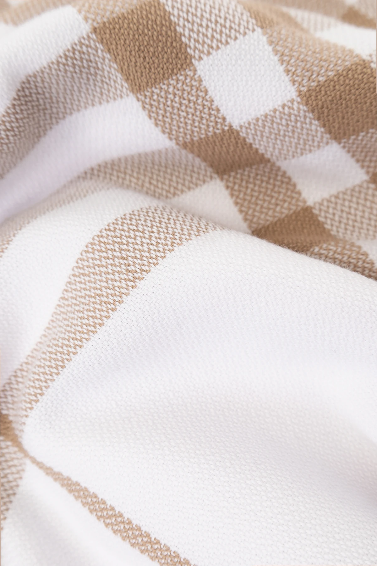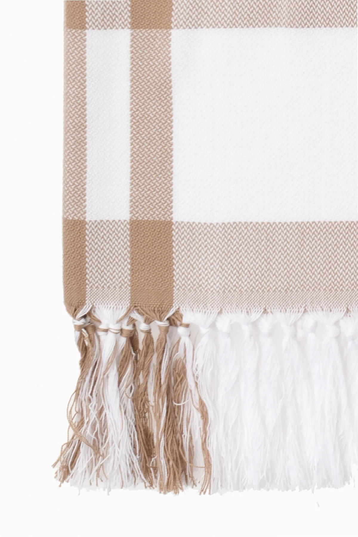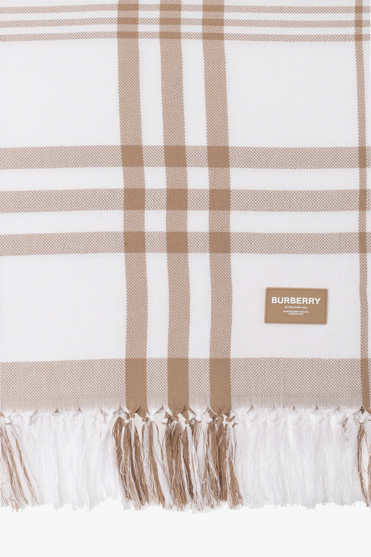 Beige and white beach blanket from Burberry. Made of cotton, this item is enriched by the brand\'s signature, logo patch and fringe edges.