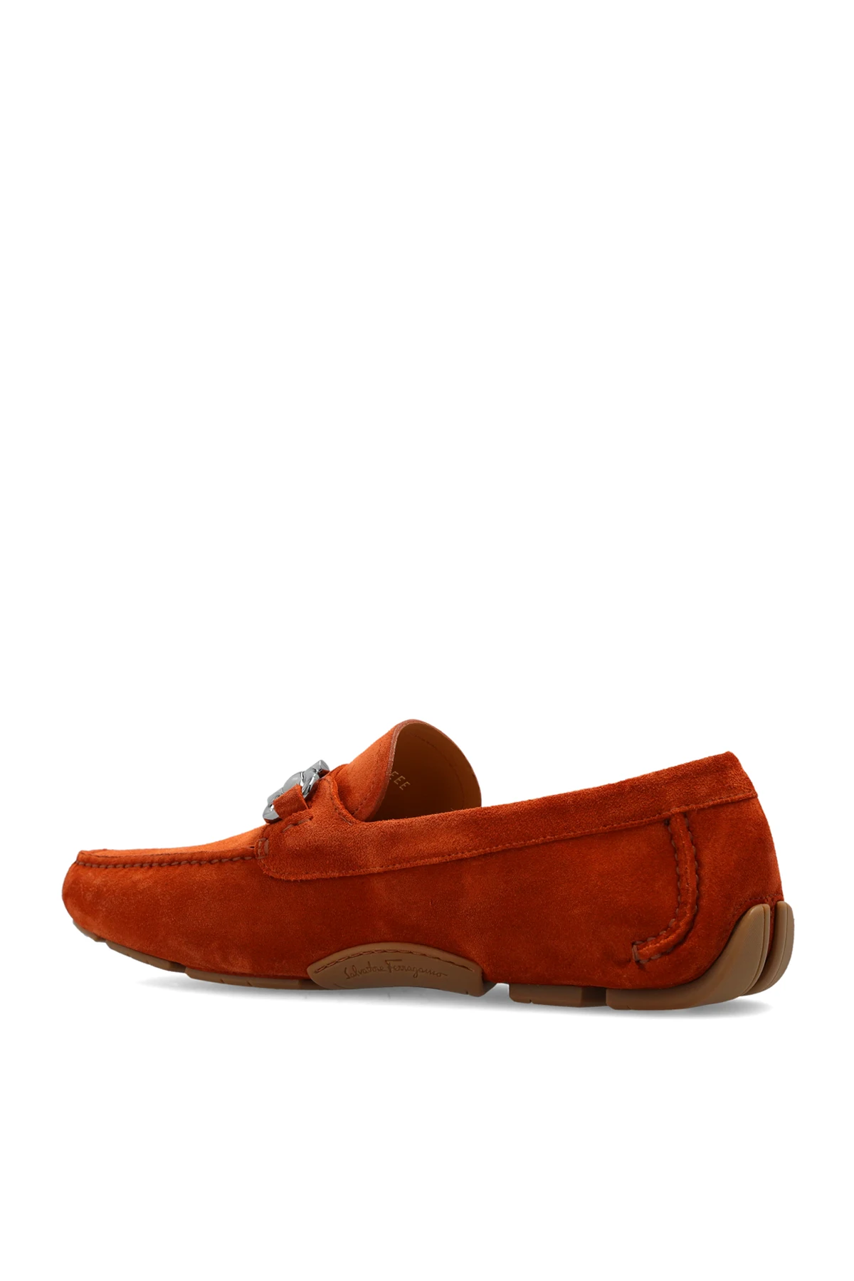 Orange-brown ‘Parigi Eco’ moccasins from FERRAGAMO. Made of suede, this model sits on a beige rubber sole and showcases silver-tone Gancini hardware on the front. Extrawide insole.