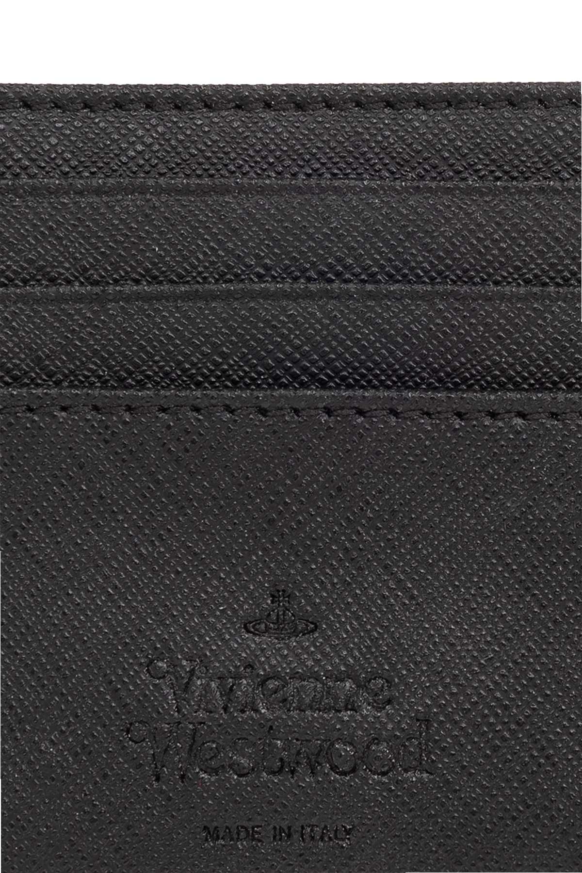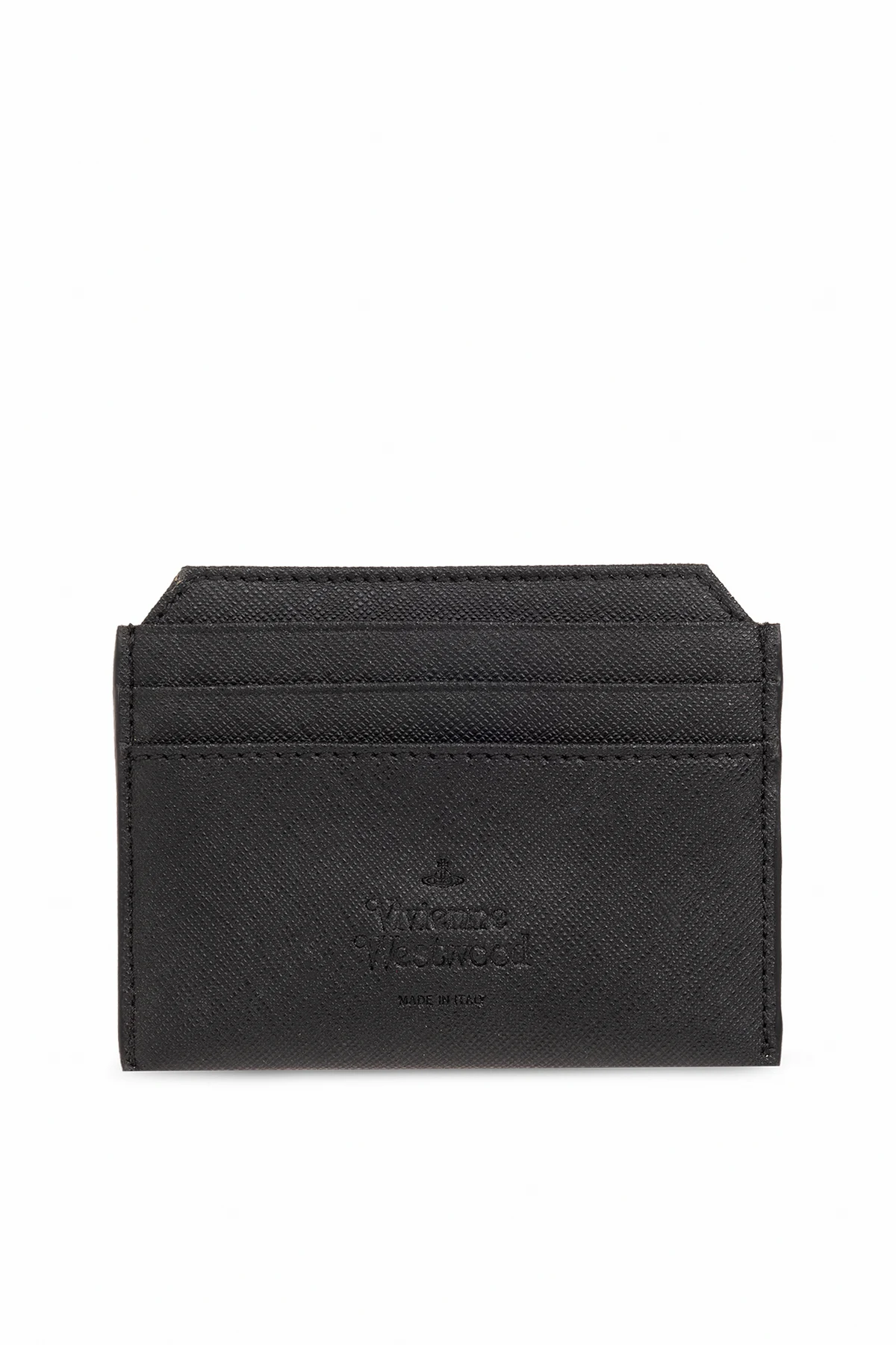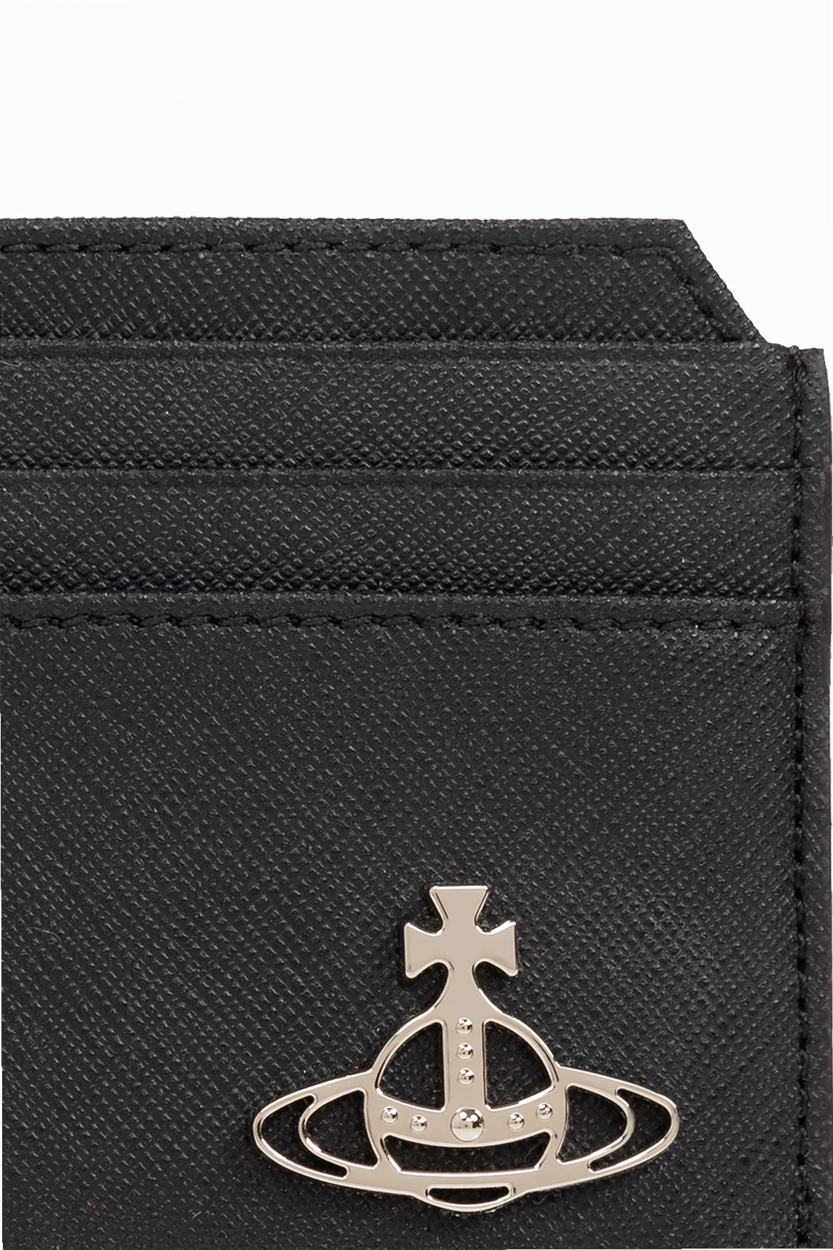 Black card case from Vivienne Westwood. Crafted from vegan leather with a saffiano effect, this item features a silver-tone metal logo plaque on the front, seven card slots and embossed lettering on the back.