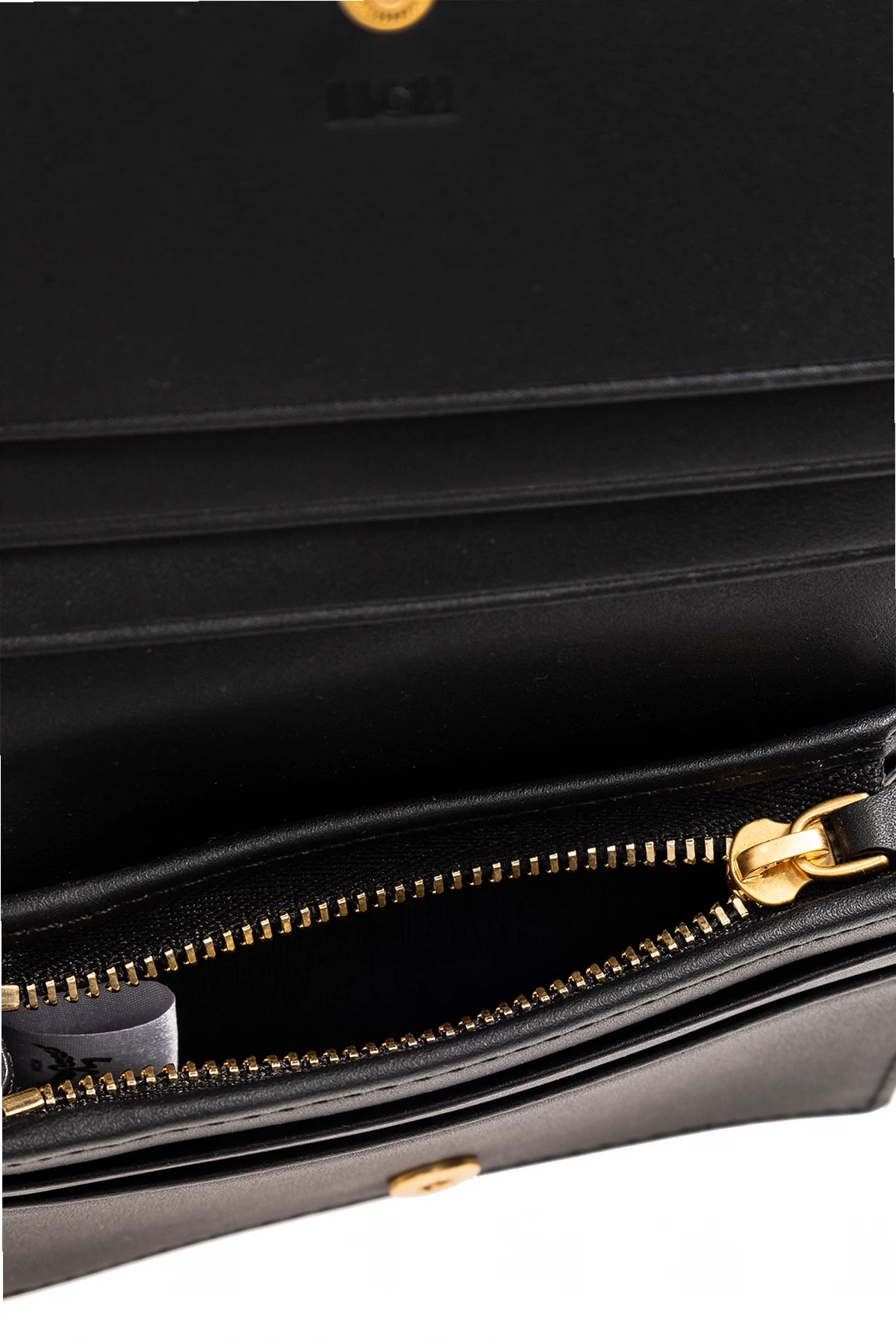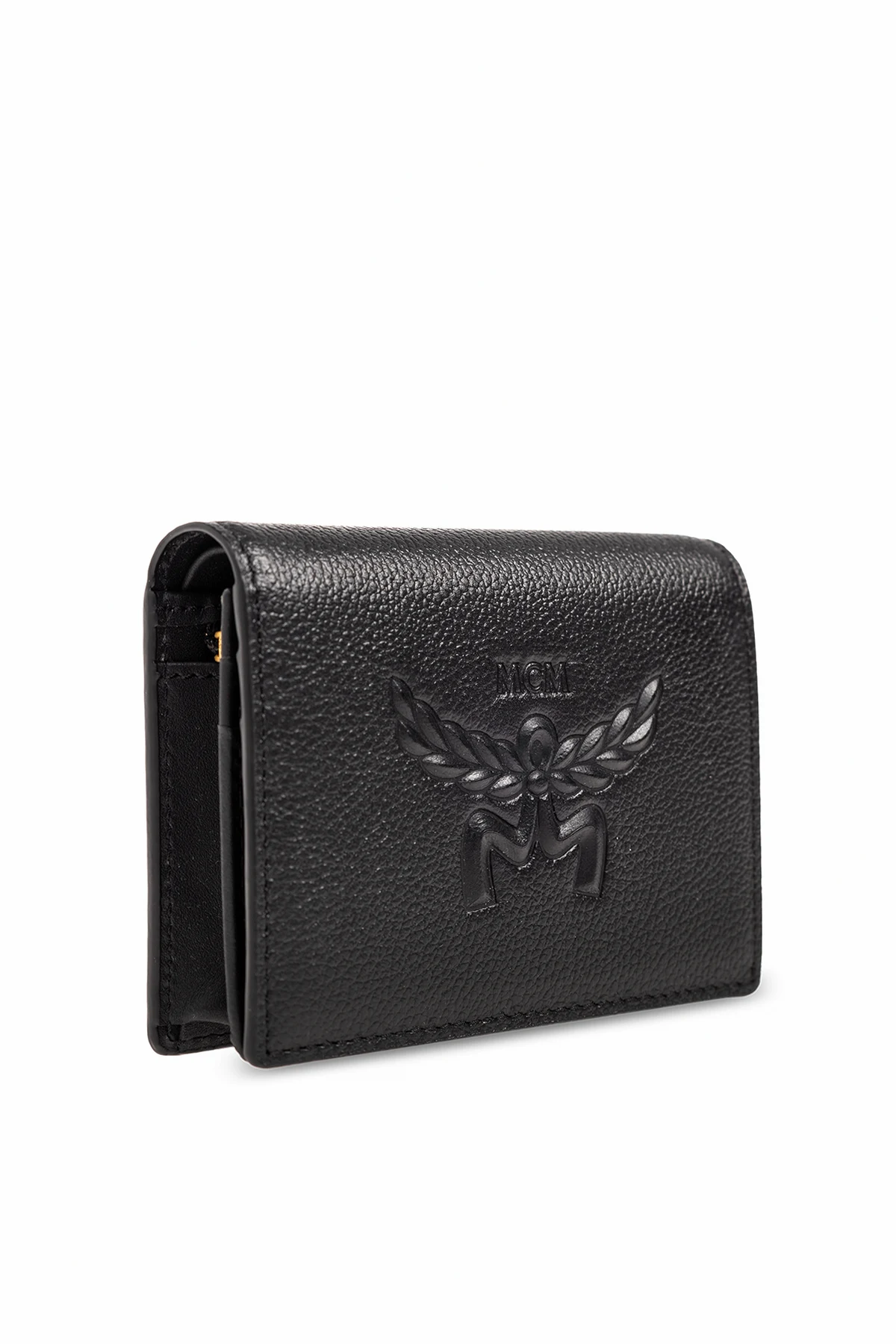 Black wallet from MCM. Made of grained leather, this design features a snap closure and an embossed logo as well as a bill compartment, one zipped coin pocket, one slip pocket and five card slots.