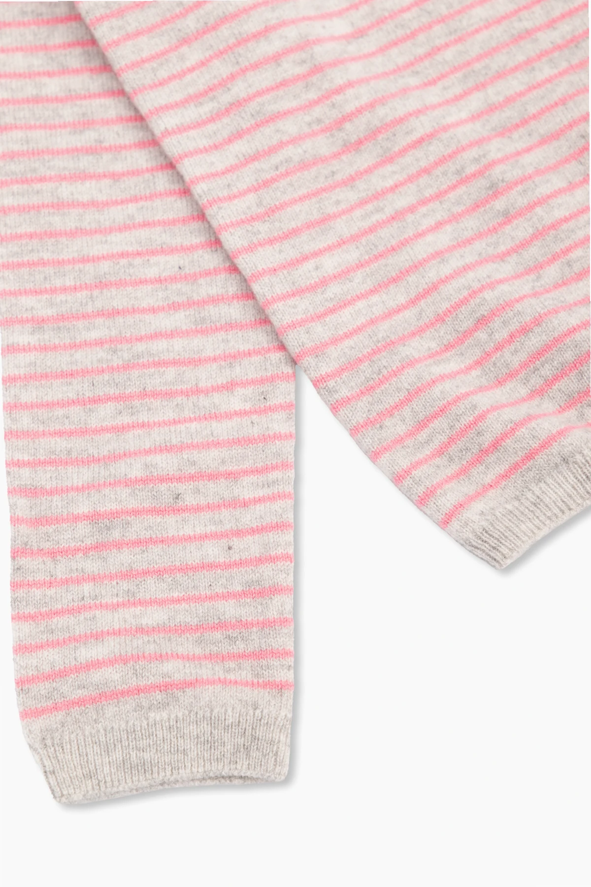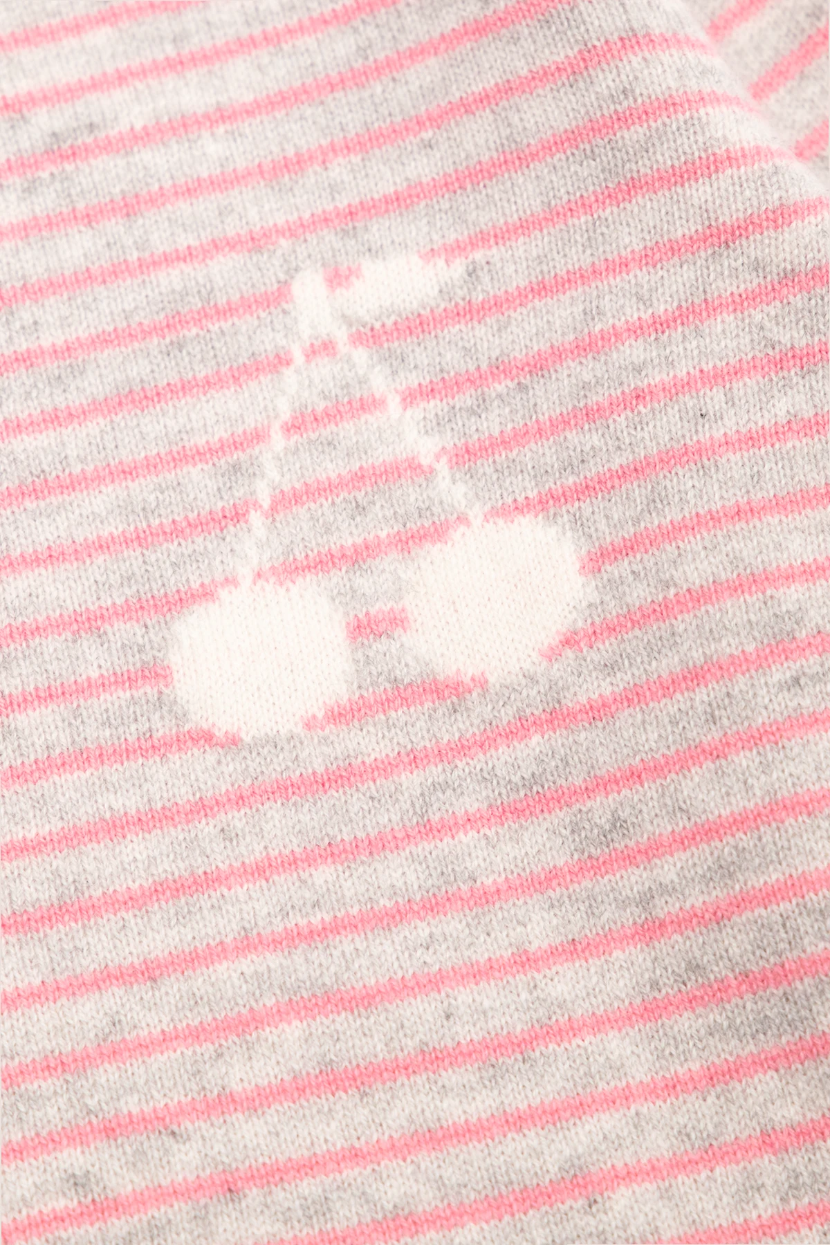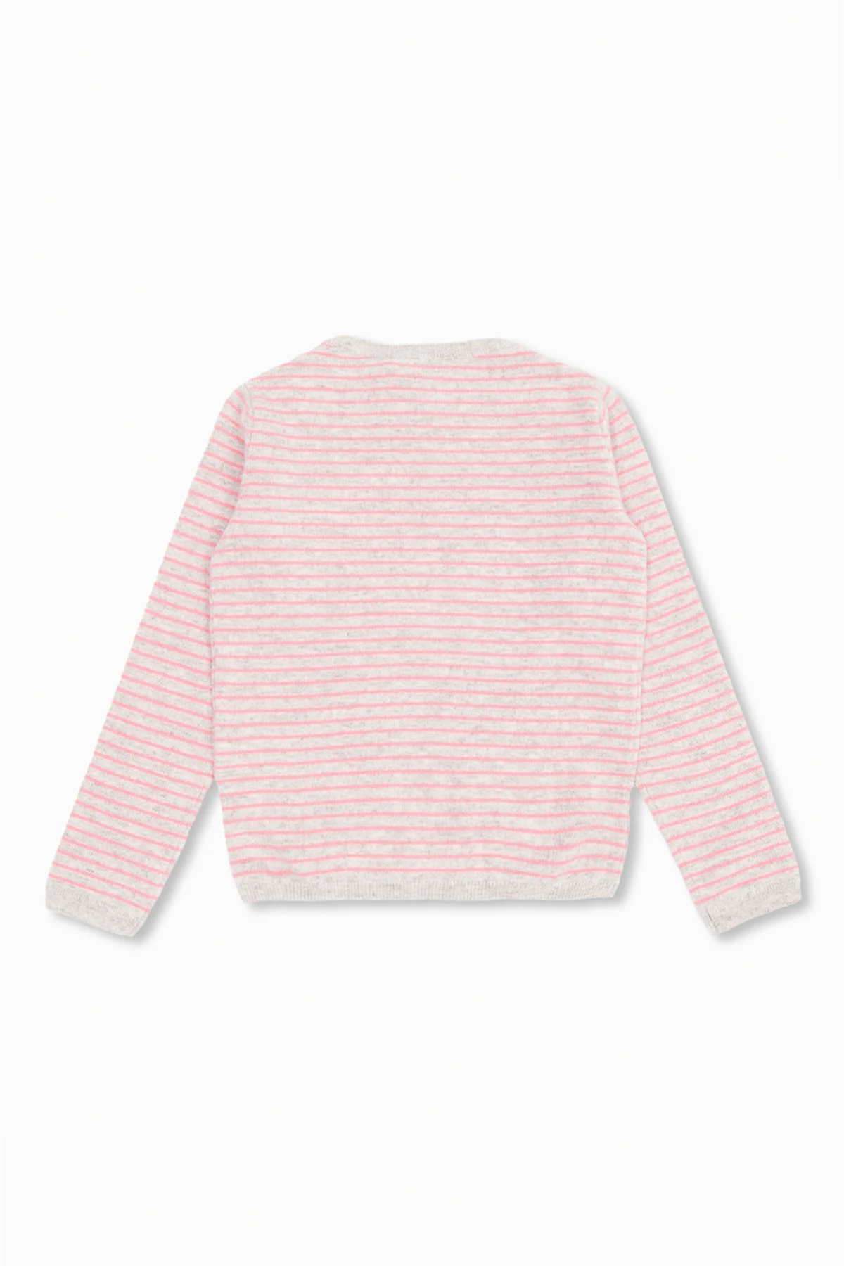 Grey and pink ‘Brunelle’ sweater from Bonpoint. Made of cashmere, this style is embellished with a stripe pattern and logo in white and features long sleeves and ribbed trims on the round neck, bottom hem and cuffs.