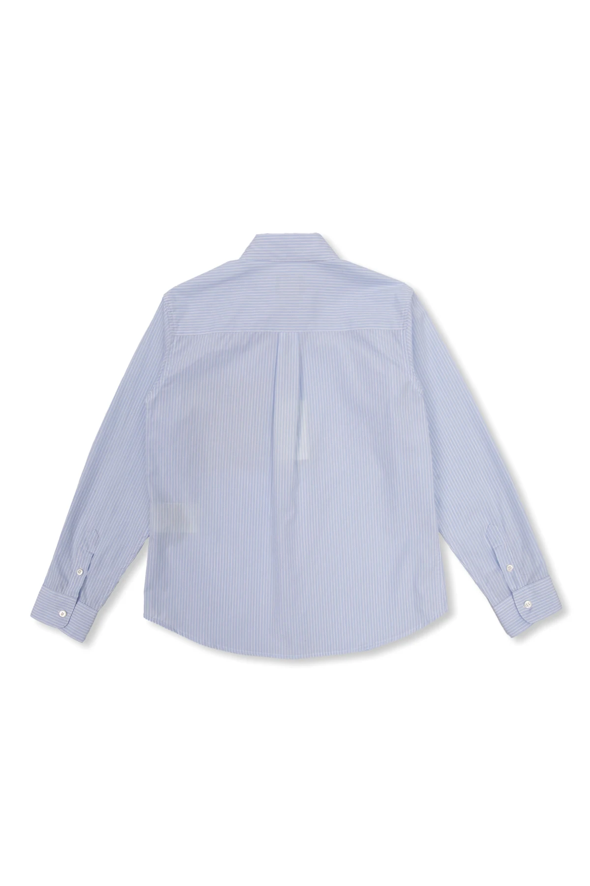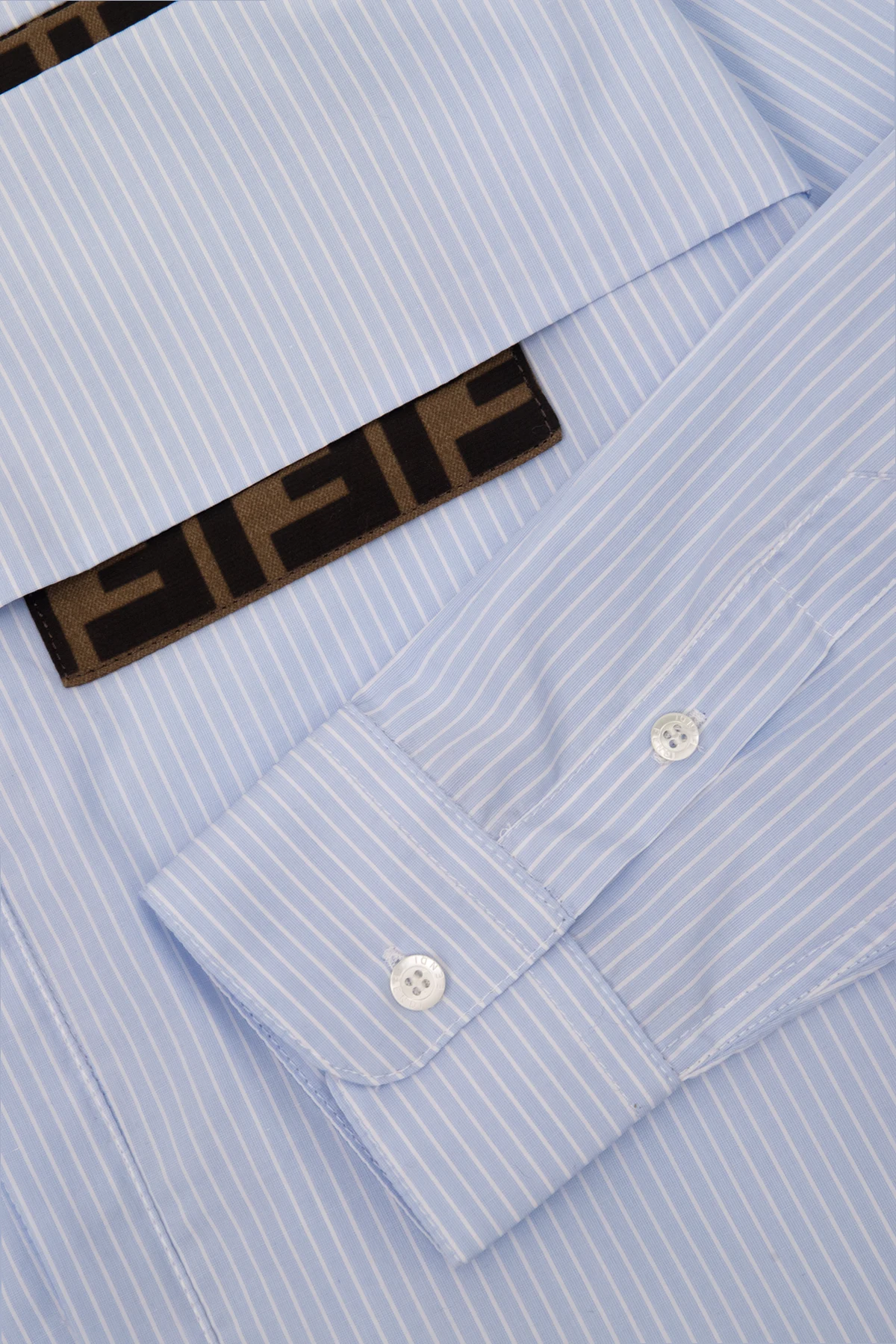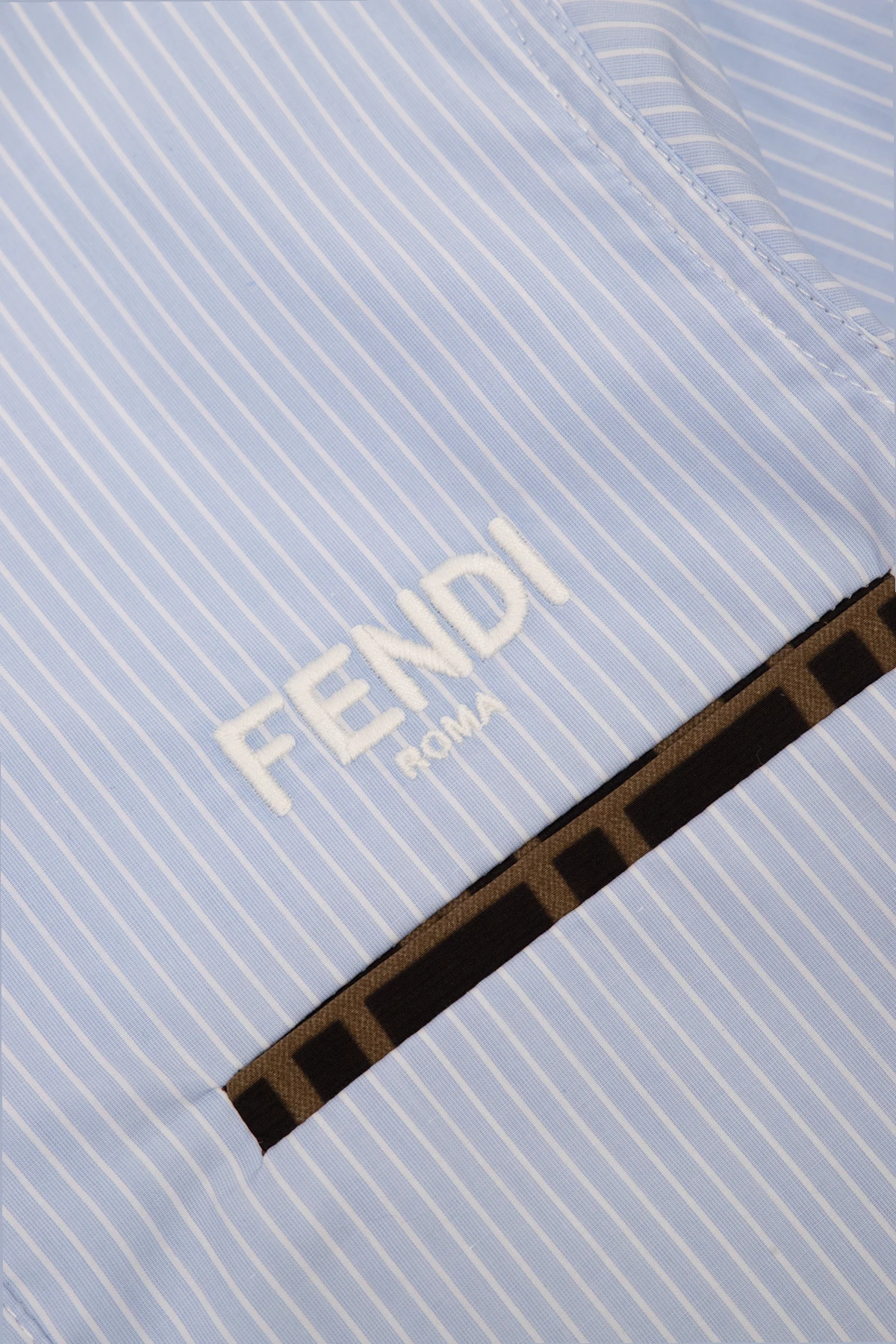 Blue and white shirt from Fendi Kids. Made from cotton and decorated with a pinstripe pattern, this style features an embroidered logo and panels on the front, button fastenings, long sleeves with button cuffs and a brown chest pocket accentuated with a monogram.
