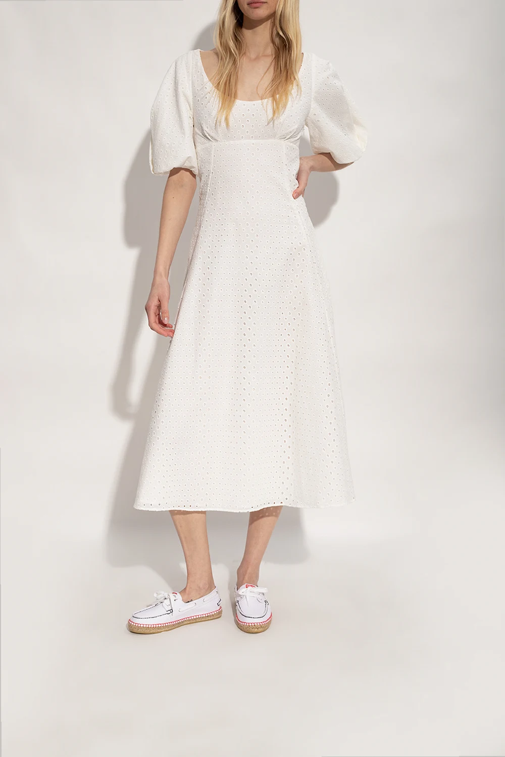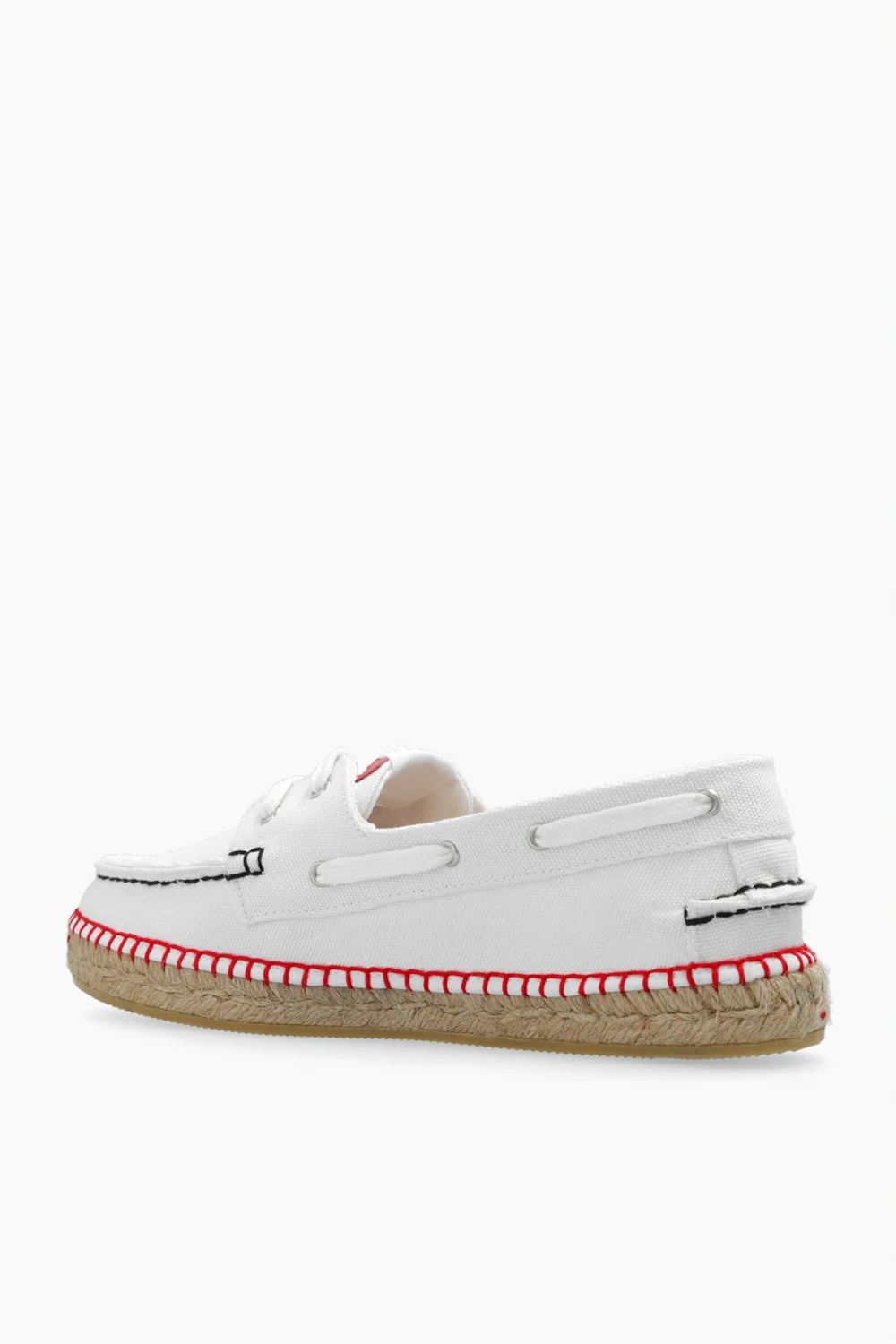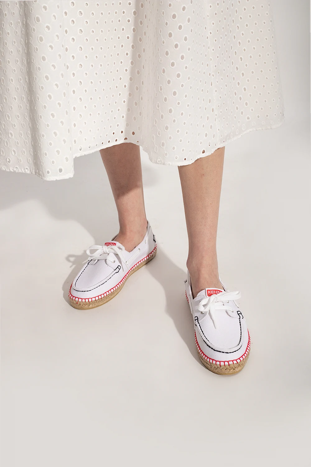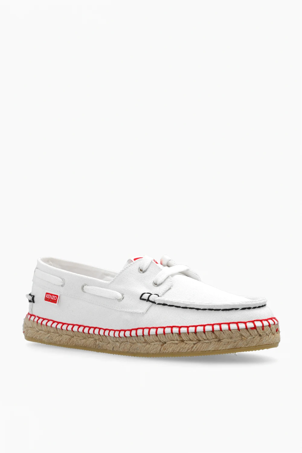 White ‘Marine’ shoes from Kenzo. Made of canvas, this lace-up pair features logo patches, red and black stitching details and beige rubber sole with woven jute.