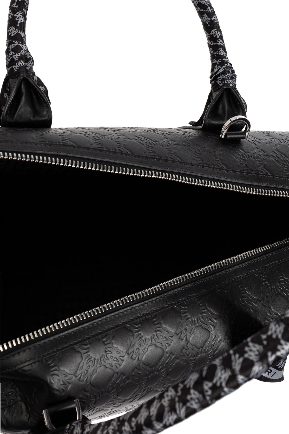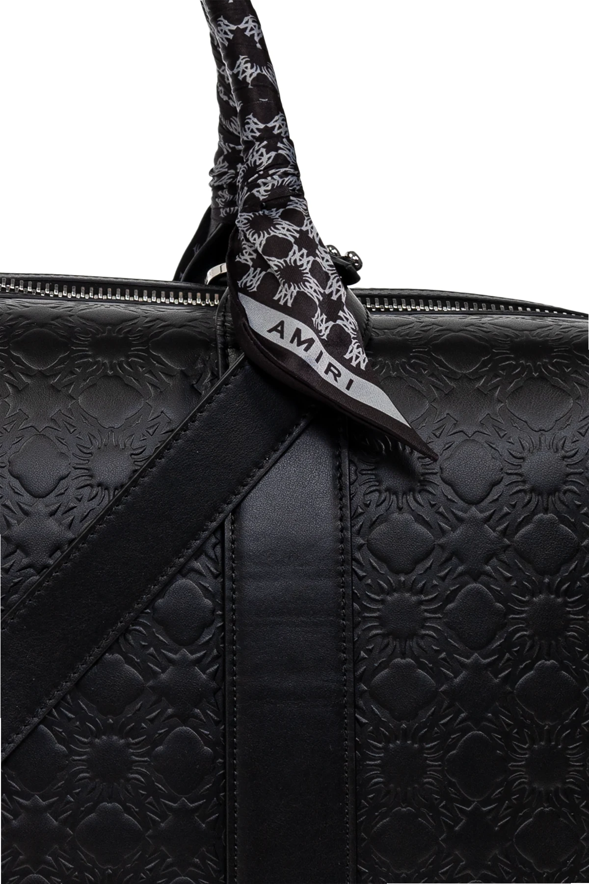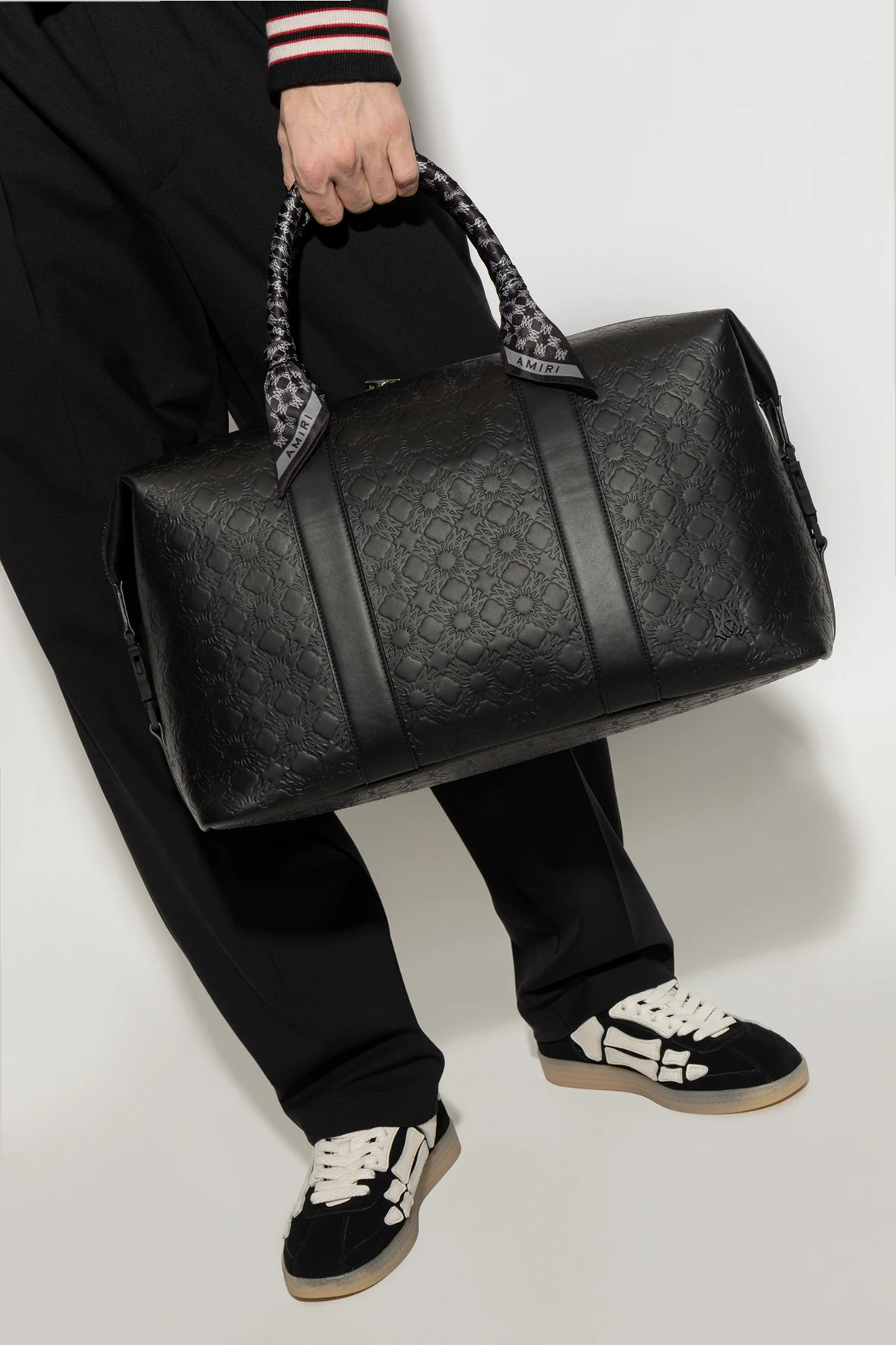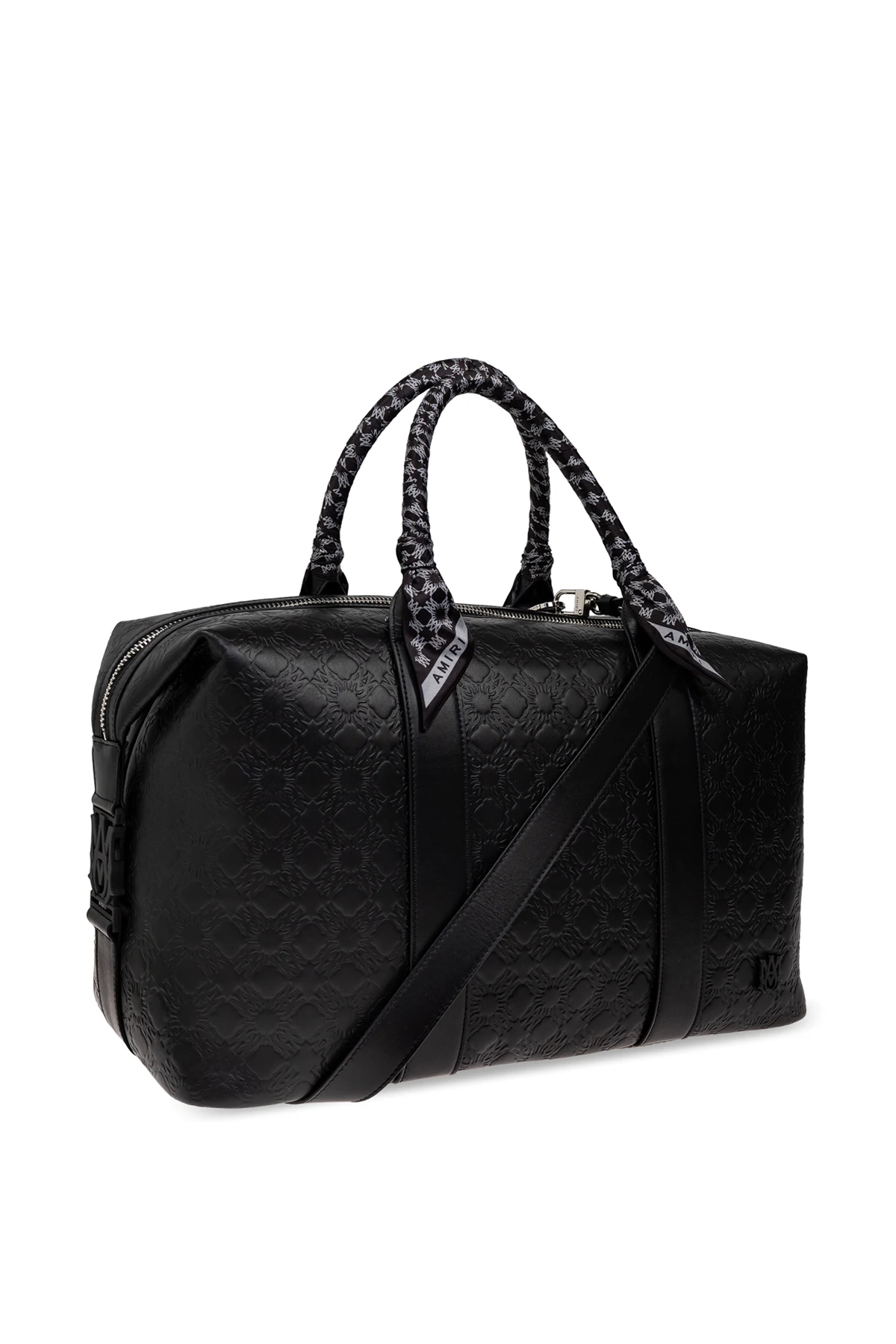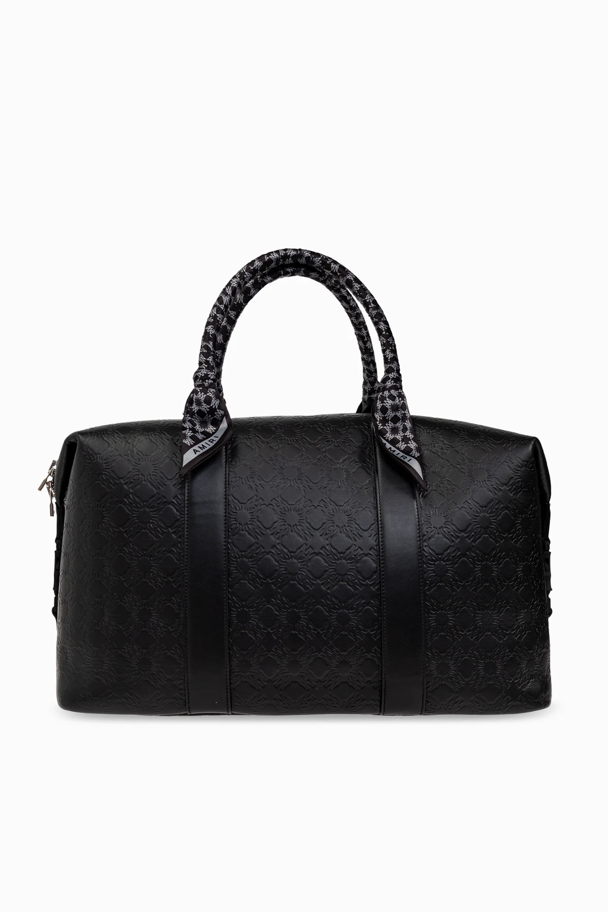 Introducing the Handbag by Amiri, an epitome of elegance and sophistication. This black carry-on bag boasts a classic rectangular shape with rounded edges, merging timeless design with a contemporary allure. Perfectly spacious, it is tailored for the modern traveler. Crafted from high-quality leather, this bag features an embossed geometric pattern that exudes luxury. The subtle, repeating design enhances its refined character. The bag is adorned with two sturdy handles, fashioned with a distinctive pattern that beautifully contrasts the black leather. Equipped with a smooth zipper closure, it ensures easy access to its spacious interior, meticulously designed for practicality. A decorative detail featuring the brand name \"AMIRI\" embellishes one handle, with the designer\'s logo embossed onto the material, underscoring its exclusivity. Why Choose This Product? Luxurious leather with a unique embossed pattern Spacious interior, ideal for travel essentials Adjustable shoulder strap for added comfort Exclusive design by renowned brand Amiri