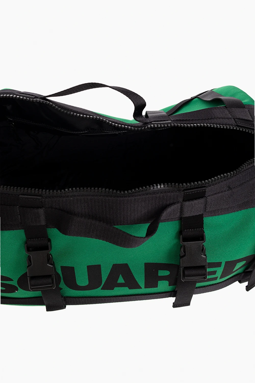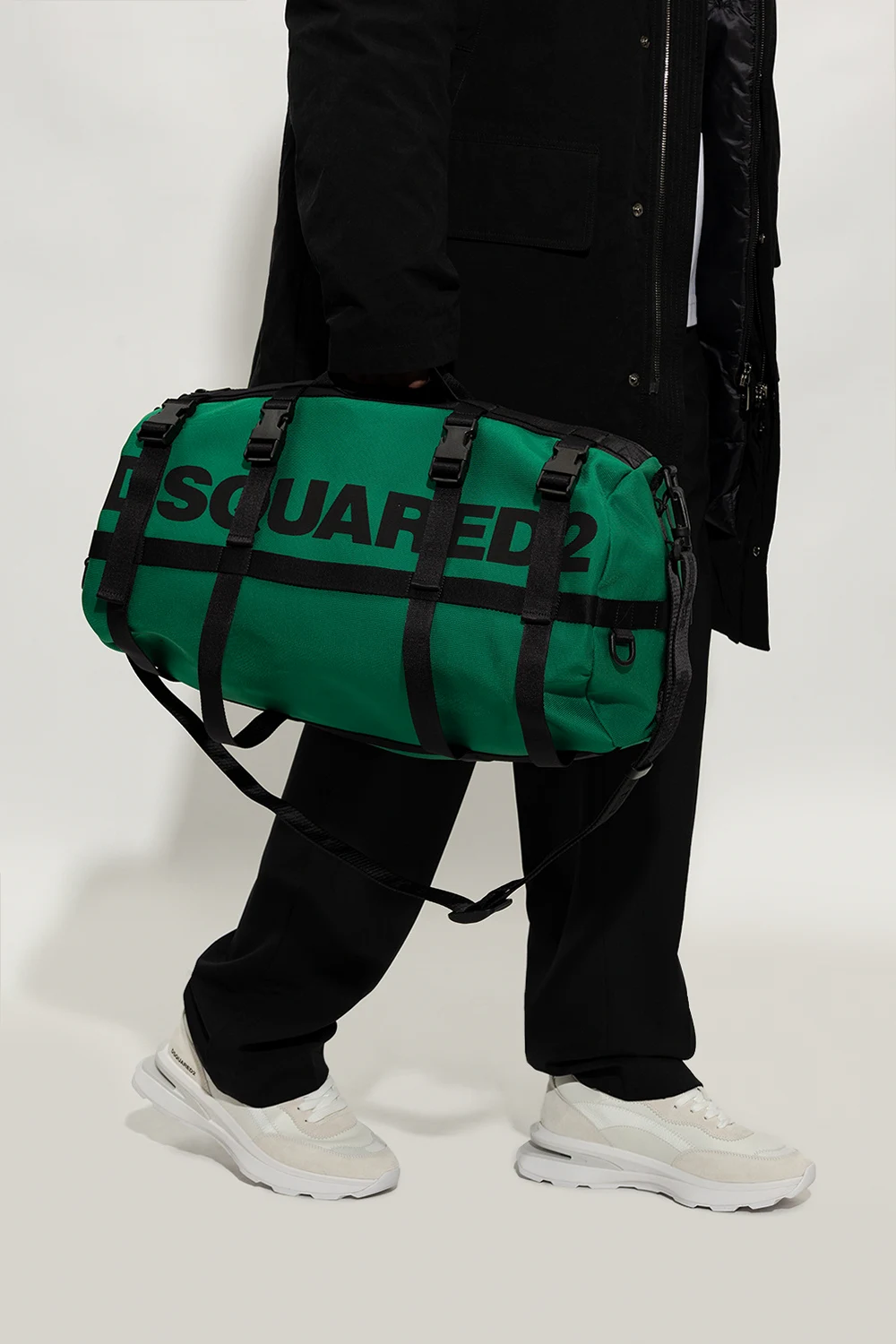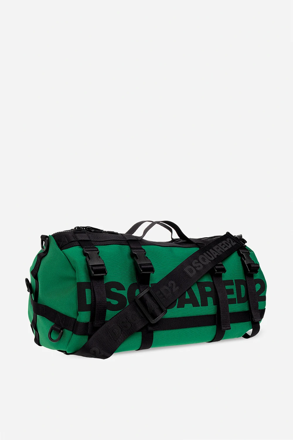 Green and black holdall bag from Dsquared2. Fastened with a two-way zip, this model features a black logo print, decorative snaps, two half-round handles, detachable and adjustable shoulder strap as well as one internal compartment with one zip pocket.