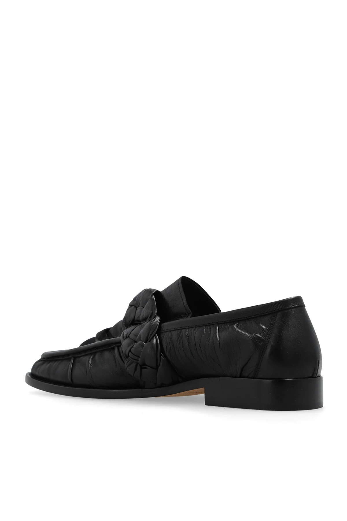 Black ‘Astaire’ shoes from Bottega Veneta. Made of leather, this model sits on a beige leather sole and showcases gathered inserts and a strap with a decorative weave.